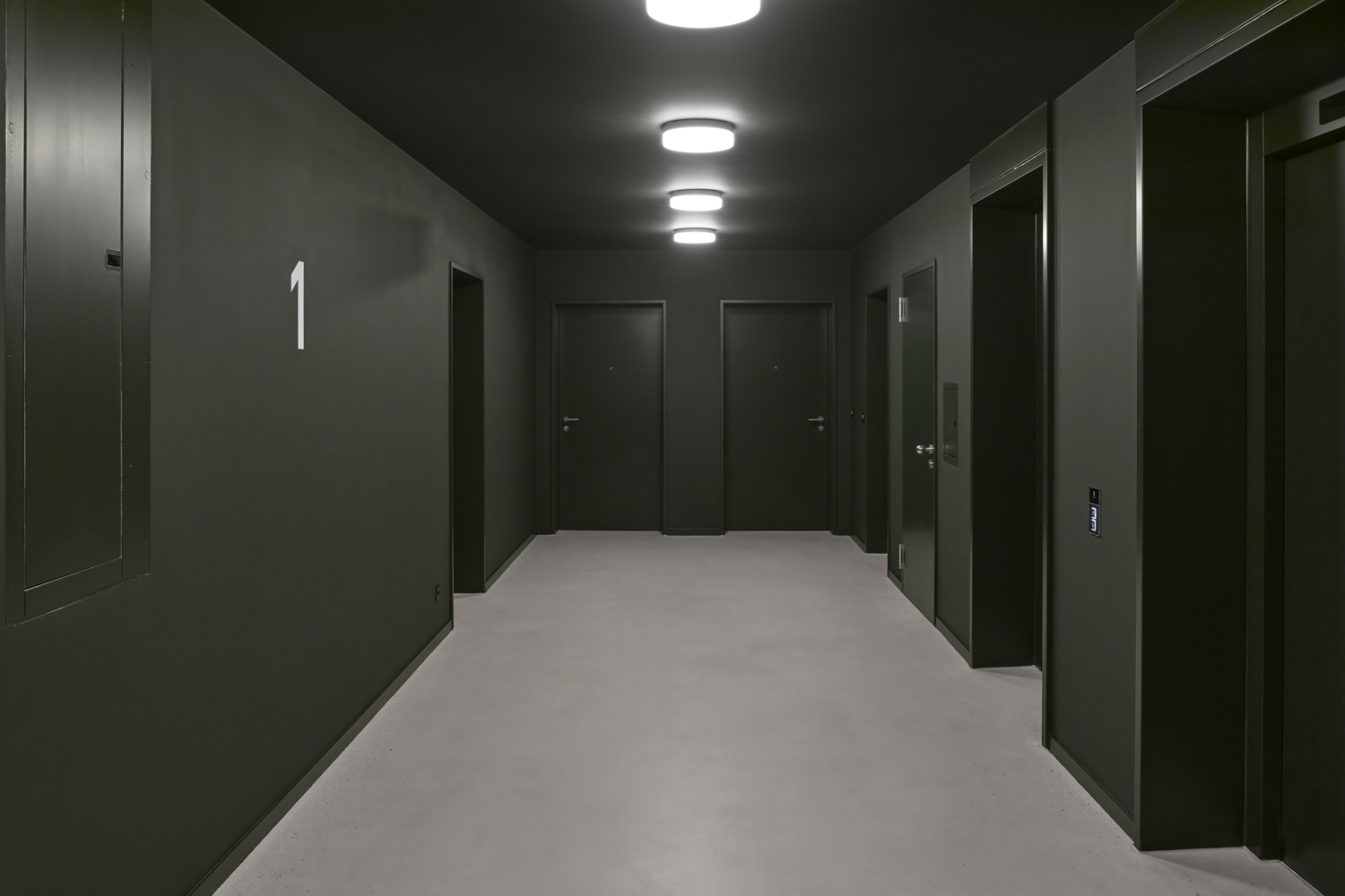 The entrance hallways in Tower 2 create an arrival zone and link the public space outside with the central garden that forms an open yet shielded hub for the new quarter.