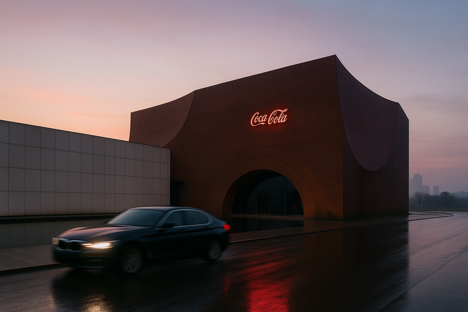 Red brick corporate pavilion with Coca-Cola branding, semicircular arch, gray panel annex, sunset lighting, wet asphalt reflections, motion-blurred black sedan, low-angle architectural photography, commercial brutalism style, urban setting, dramatic golden hour atmosphere, brand integration design