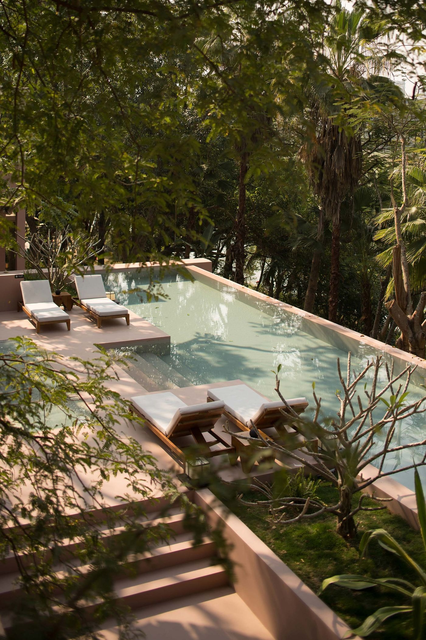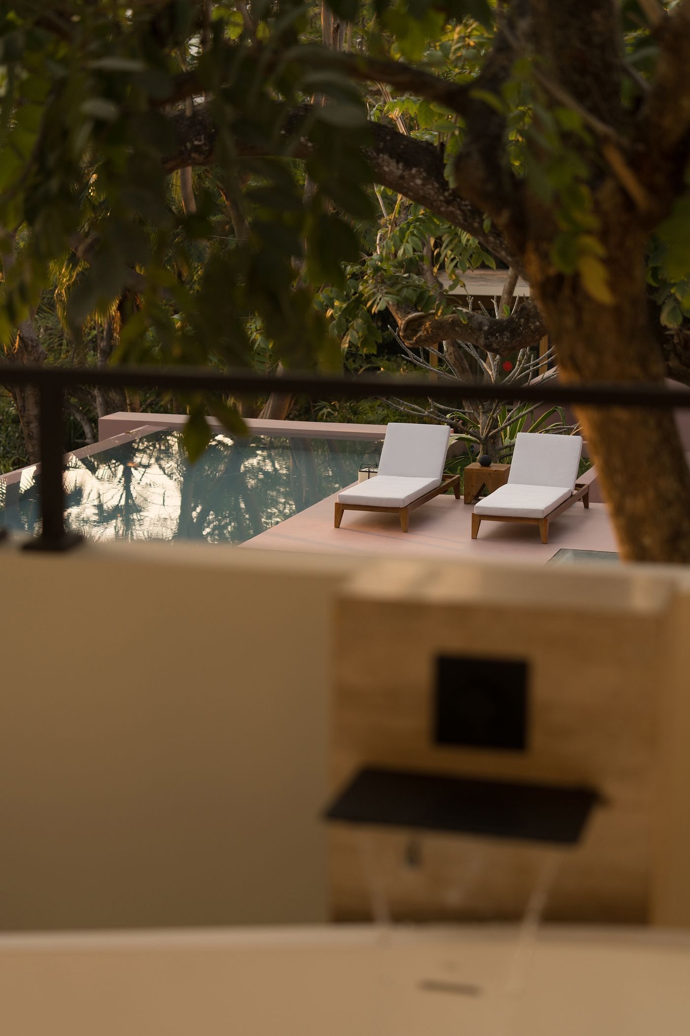 Guest rooms on the lower level open onto private patios with plunge pools, offering a sense of tranquil seclusion. Those on the upper levels trade intimacy for elevation, with expansive balconies that float above the treetops and gaze out towards the river’s silvery glint.