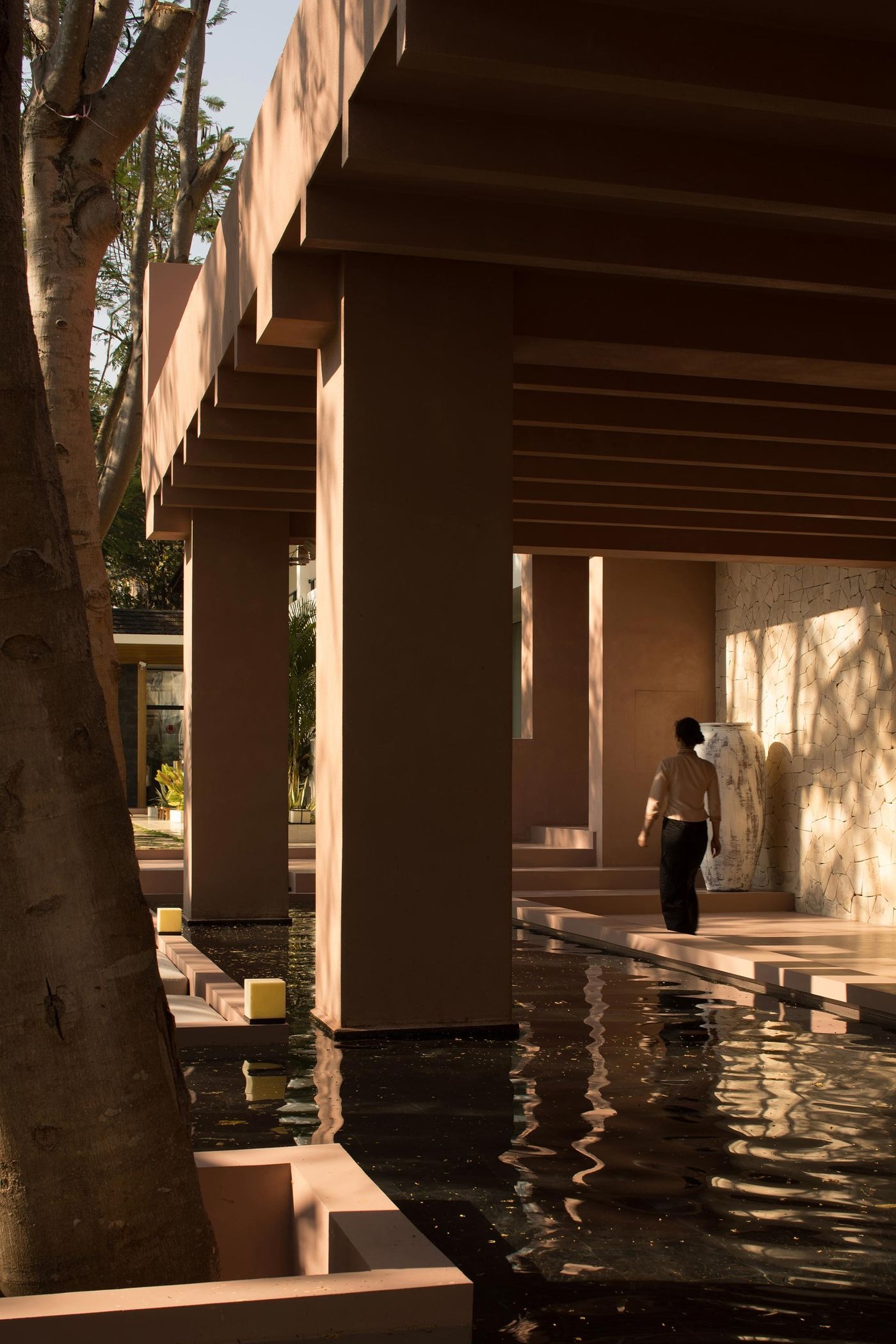 중앙 구역은 숙박동 사이의 연결고리 역할을 하며, 공간을 조용한 극적 효과로 나누는 긴 반영 연못 주위에 그늘진 야외 라운지가 배치되어 있다. 넉넉한 개구부와 그늘진 콜로네이드와 짝을 이룬 이 선형 수공간은 주변 미기후를 식힐 뿐만 아니라 실내외, 인공환경과 자연환경 사이의 경계를 부드럽게 흐린다.