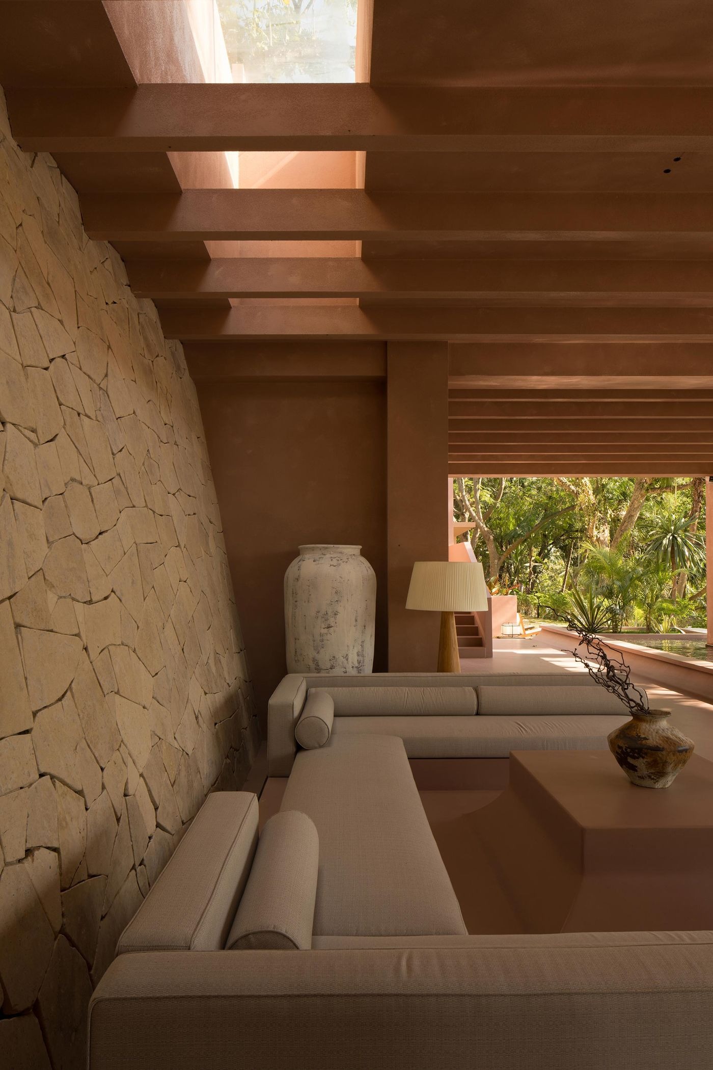 Characterised by clean rectilinear forms and a consistent material palette, the complex feels deeply rooted in place despite its modernist rigor. This is due, in no small part, to the building’s earthen pink exterior, a hue that seems to have been borrowed from the soil and filtered through the sun. It’s a subtle camouflage that allows the structure to recede into the rainforest’s shifting textures and shadows, rather than stand starkly alone.