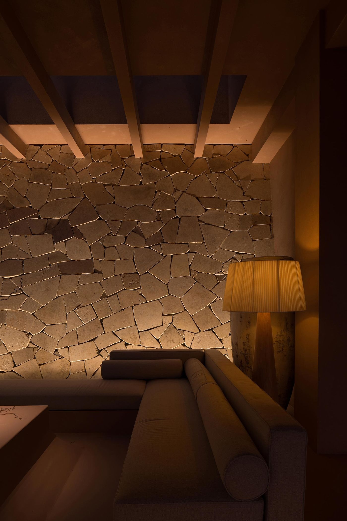 내부 공간은 미니멀리즘과 따뜻함 사이의 신중한 균형을 이룬다. 건식 돌벽과 목재 슬래트 천장은 토착 공예의 흔적을 간직하는 한편, 매끄러운 콘크리트 바닥과 바닥부터 천장까지의 유리창은 공간을 현재에 확고히 뿌리내린다.