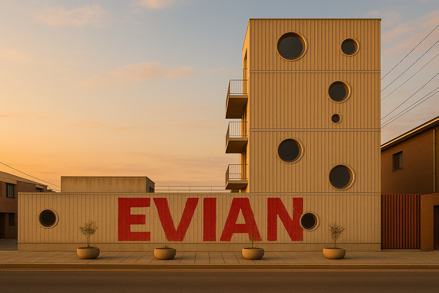 Evian’s brand evokes notions of natural purity, timeless refinement, and pristine origins — qualities drawn from the Alpine springs that inspire its identity. Conversely, Brutalism speaks of material honesty, monumental presence, and structural integrity — a design language often associated with bold permanence rather than delicate refinement.