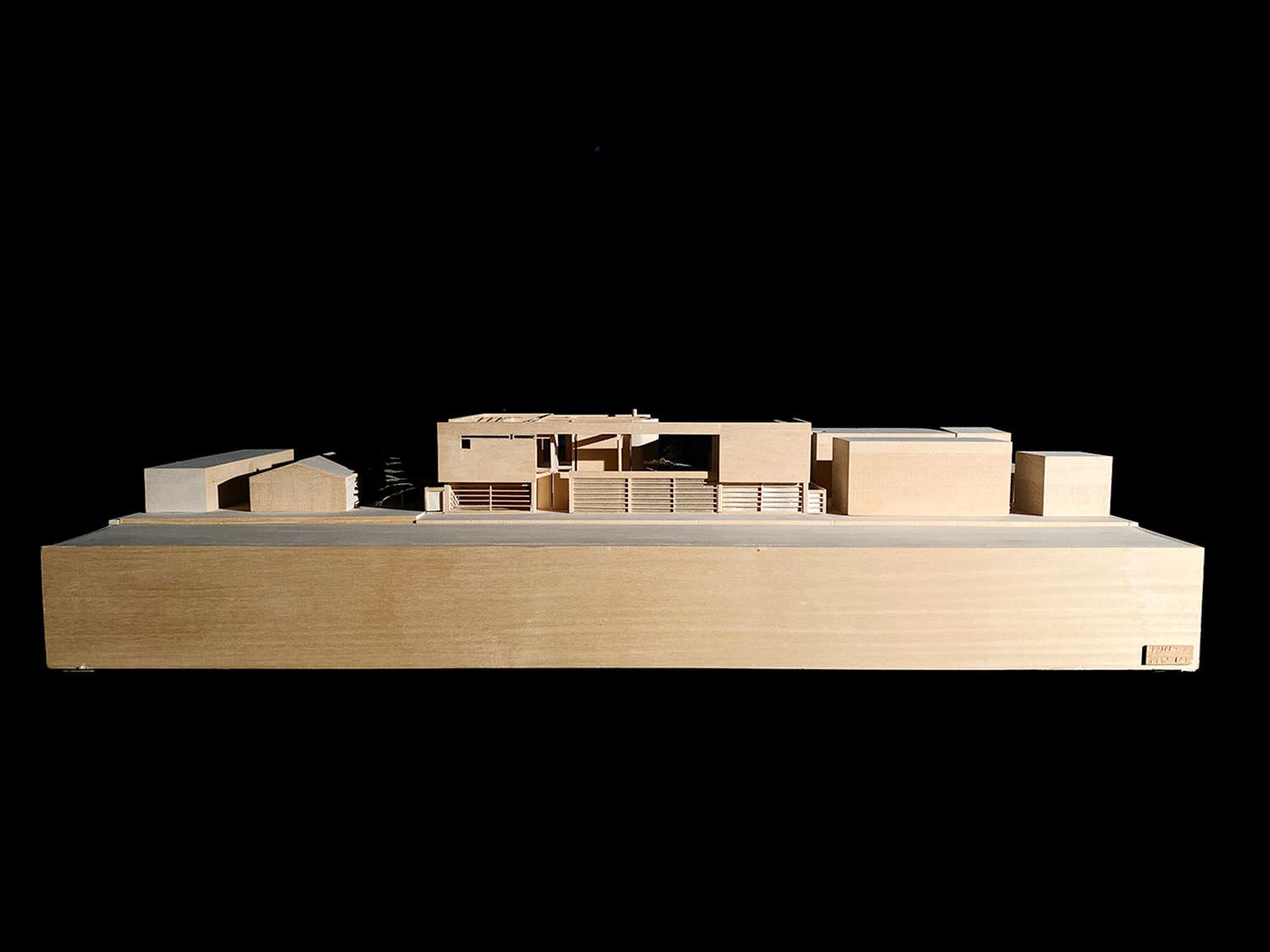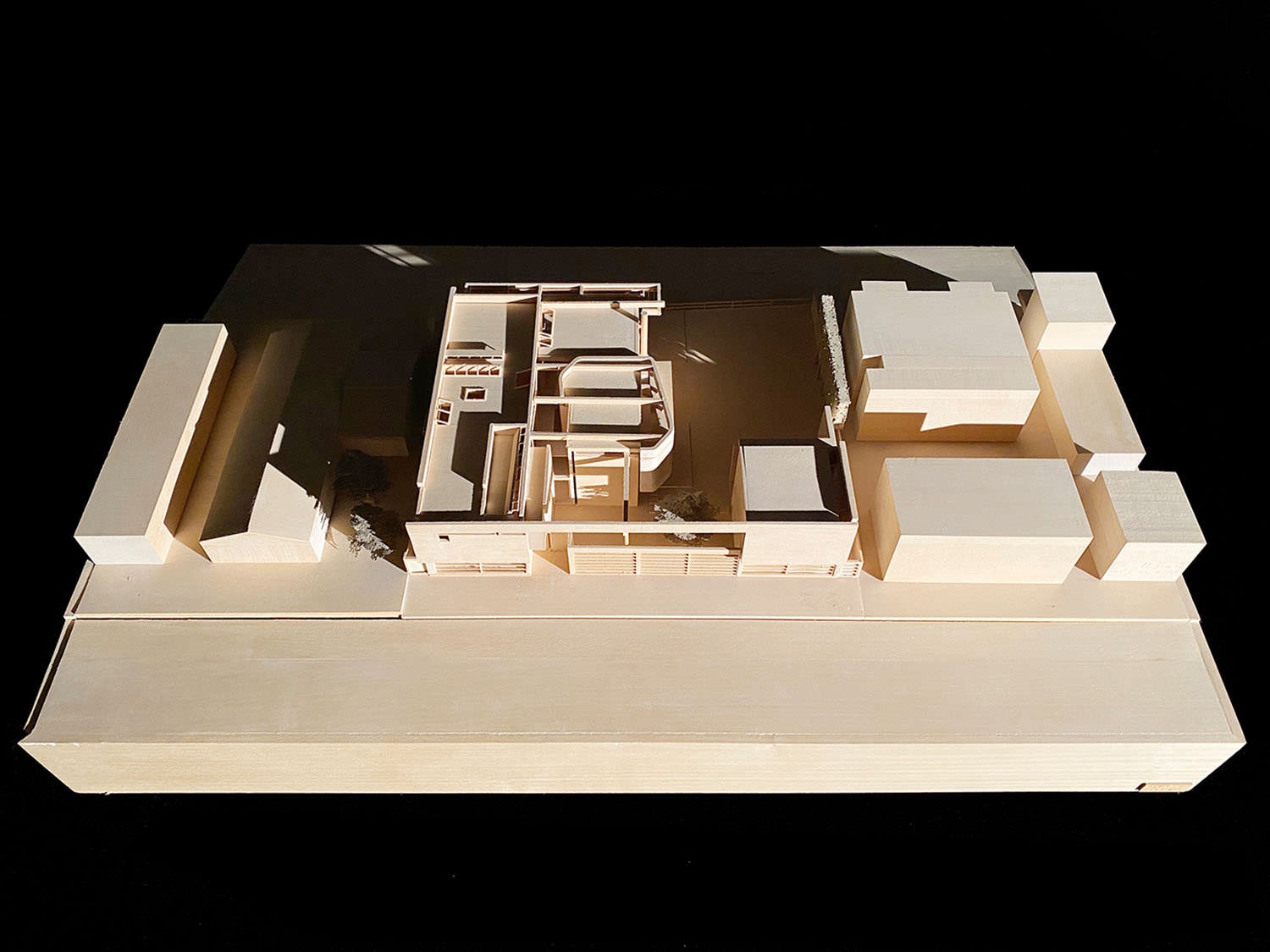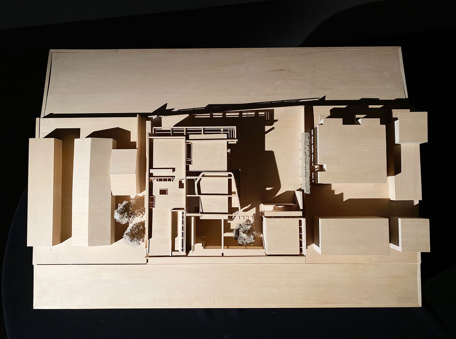 The beams at the roof, located above the horizontal framing, express the structural rhythm and layering of components. This cadence is repeated with the joinery of the painted aluminum exterior wall panels and modular windows. The mass of the exterior plaster walls is juxtaposed to the transparent glazed facades, creating a mosaic of layers and materials. It is through this use of layering of materials and the enclosure walls as planes intersected by transparent surfaces, that the separation between inside and outside is blurred, and the spaces are linked.