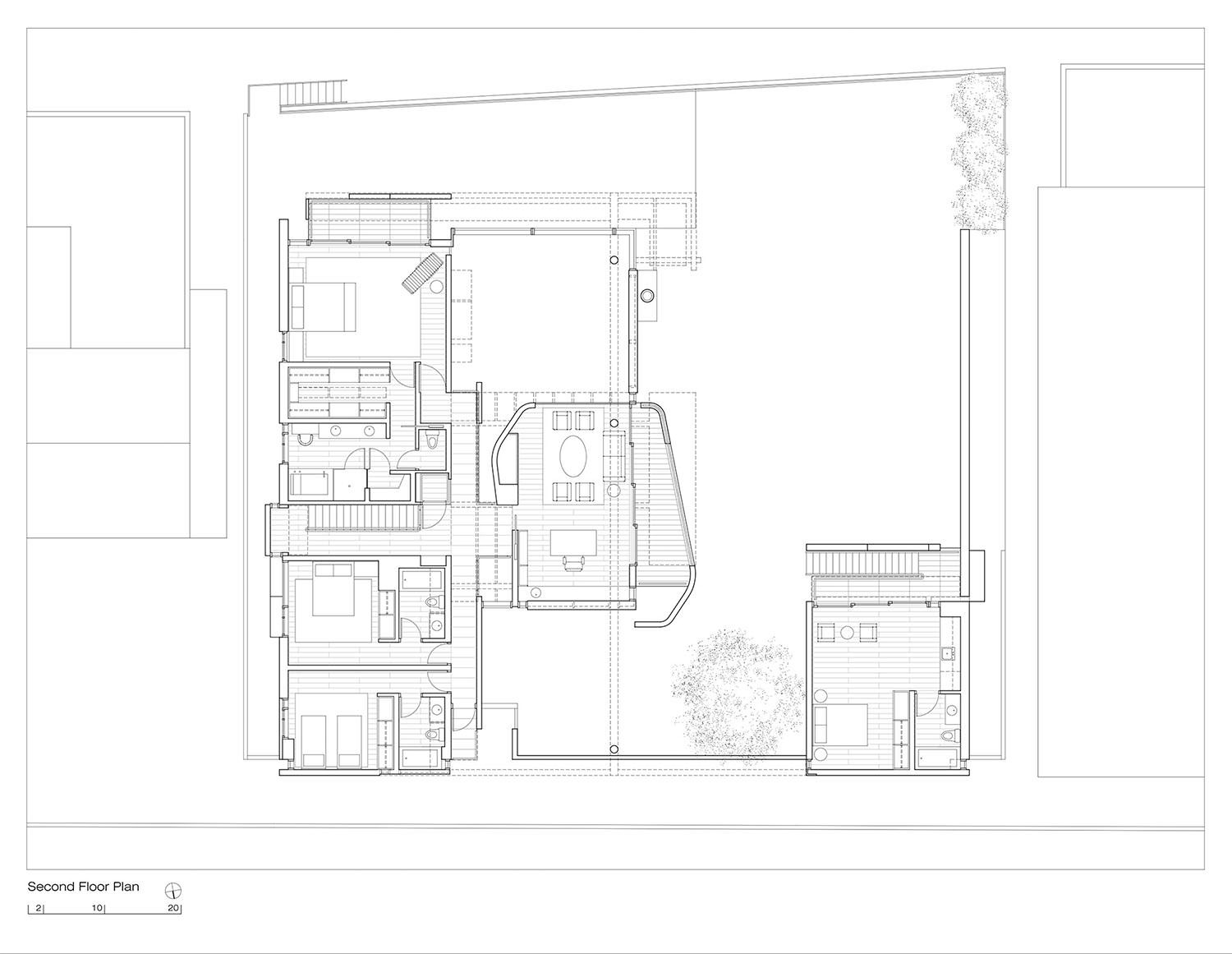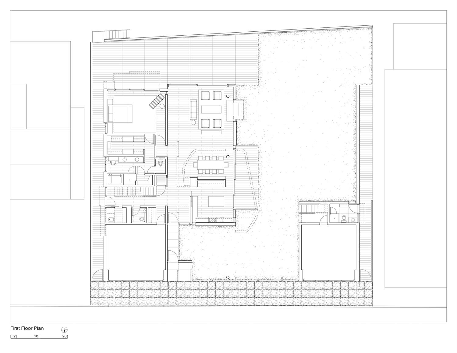 특히 인상적인 것은 2층의 유리 브리지와 보행로가 이 시선을 가로지르며 만들어내는 공간적 층위다. 수평과 수직, 투명과 불투명의 요소들이 교차하며 단순할 수 있는 공간에 복합적인 깊이를 선사한다. 입구와 보행로 동쪽에는 침실과 서재 등 사적 생활공간들이 자리하고, 서쪽에는 중정으로 열리는 공용 영역들이 배치되어 공간의 성격에 따른 명확한 구분을 보여준다.