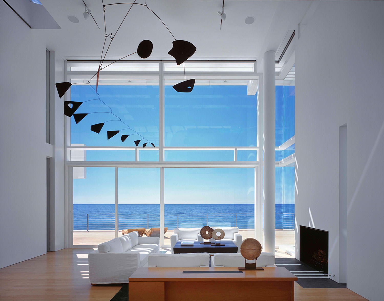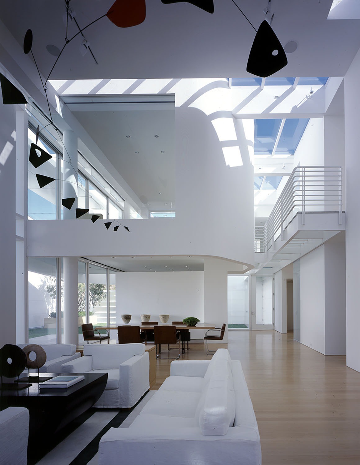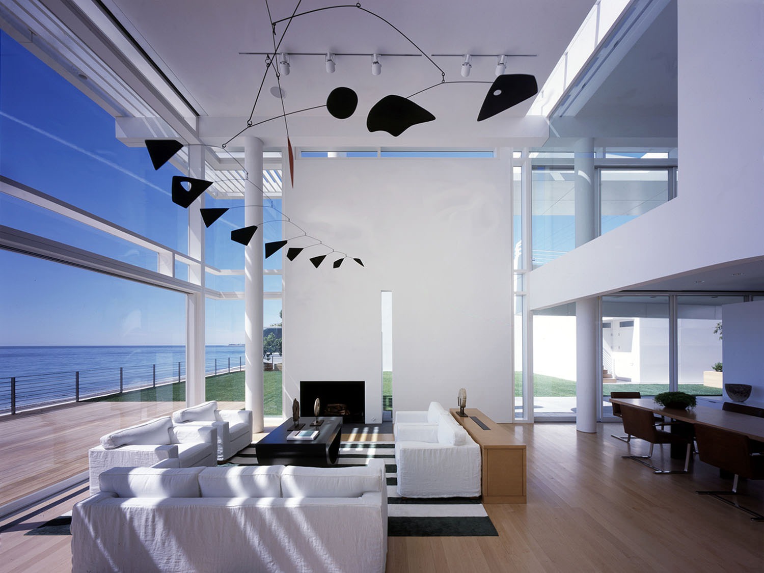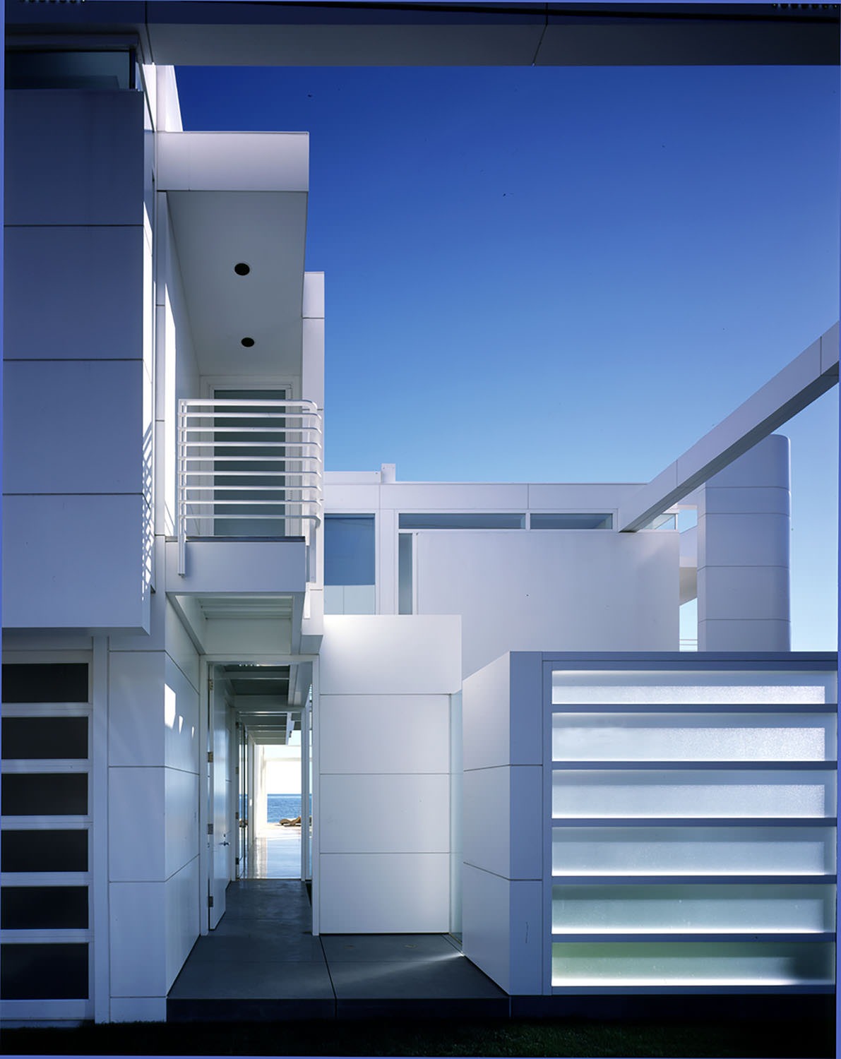 The path through the house begins at the glazed translucent north entry wall and into the courtyard between the Main House and Guest House. The two-story entrance provides a framed view through the living room to the ocean beyond and is transected by a second level glazed bridge and walkway.