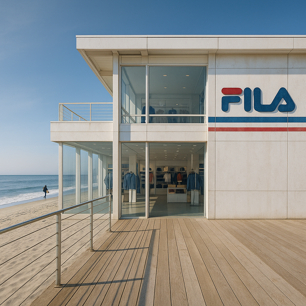 - One-line (EN) : “Salt-patina FILA coastal flagship facade under bright Pacific sun, teak deck foreground, surfer silhouette for scale.”