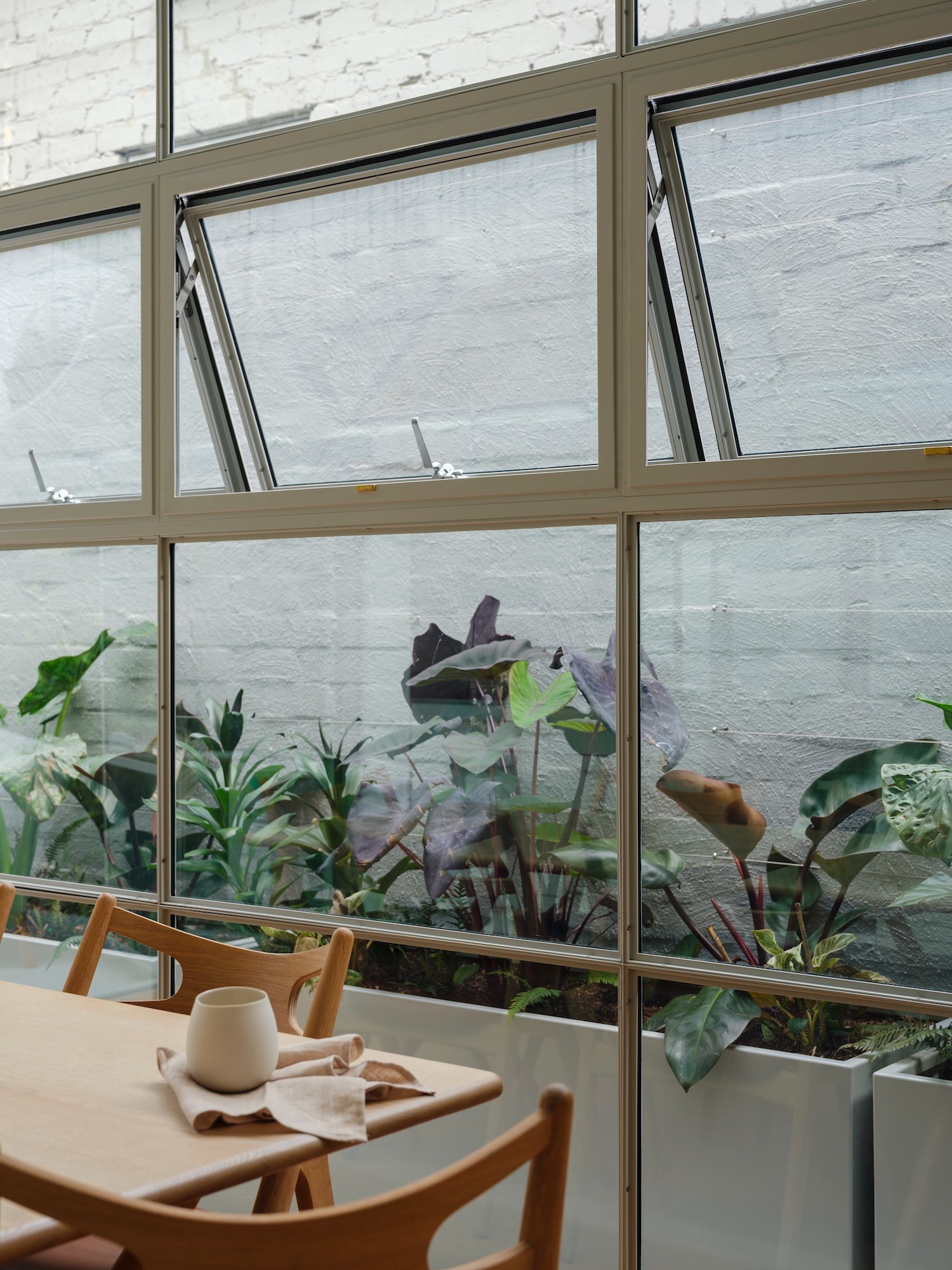 특히 주목할 만한 것은 거울 백스플래시의 활용이다. 이 요소는 단순한 기능적 필요를 공간적 시(詩)로 승화시킨 탁월한 사례다. 측면 중정에 심어진 식물들의 모습을 실내로 끌어들여, 제약된 도시 부지에서도 자연을 효과적으로 차용하는 공간적 마술을 선보인다. 거울에 비친 녹음은 실제 식물과 어우러져 실내외의 경계를 모호하게 만들며, 작은 공간에서도 풍부한 공간감을 연출한다.