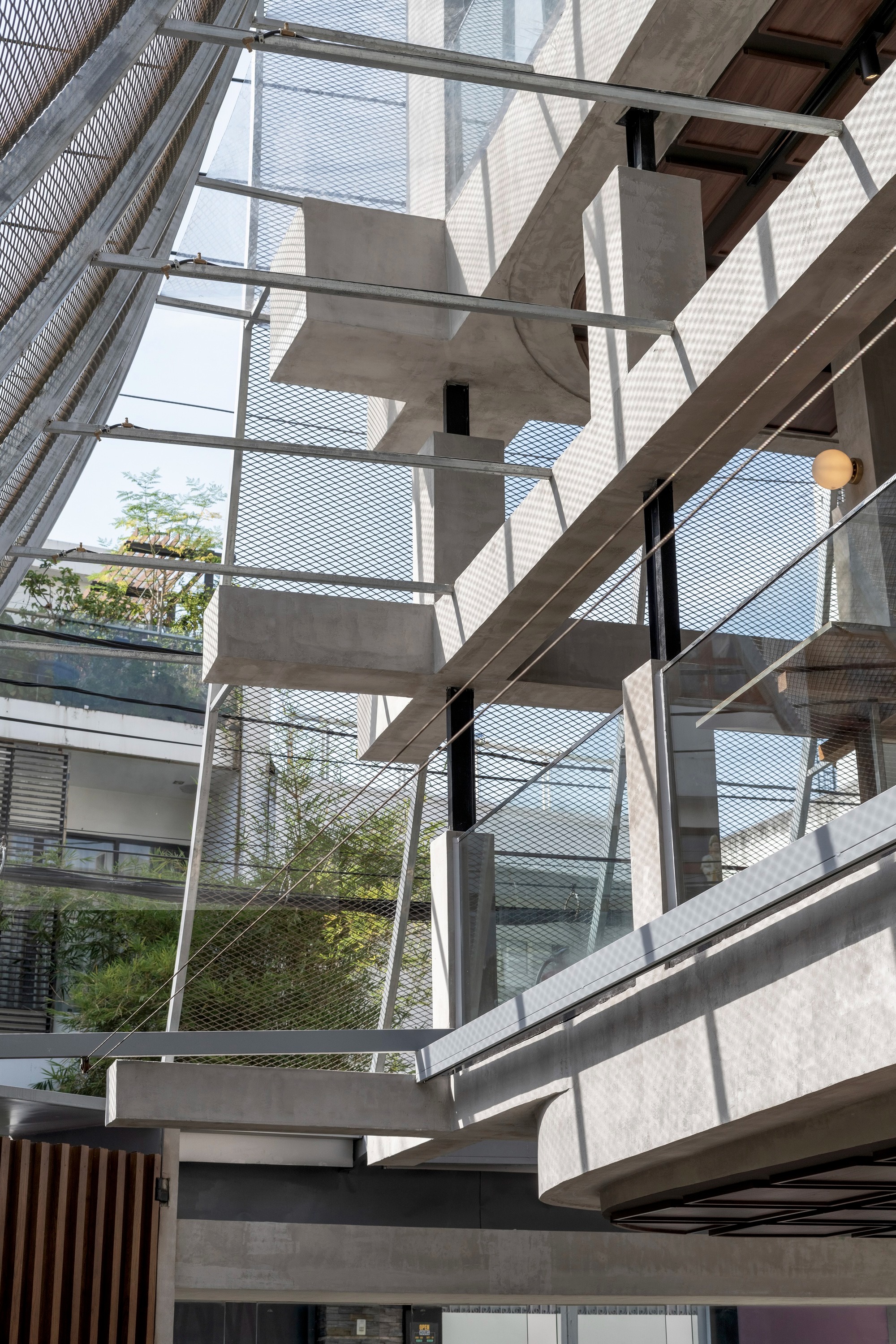 Beyond its formal expression, the veil also performs as a passive and active environmental device. Its perforated surface promotes cross ventilation throughout the building, while an integrated misting system embedded in the screen delivers cooling microclimates during Saigon's peak summer heat. Together, the mesh and mist act as a climatic buffer, creating comfort while minimizing the need for mechanical cooling.