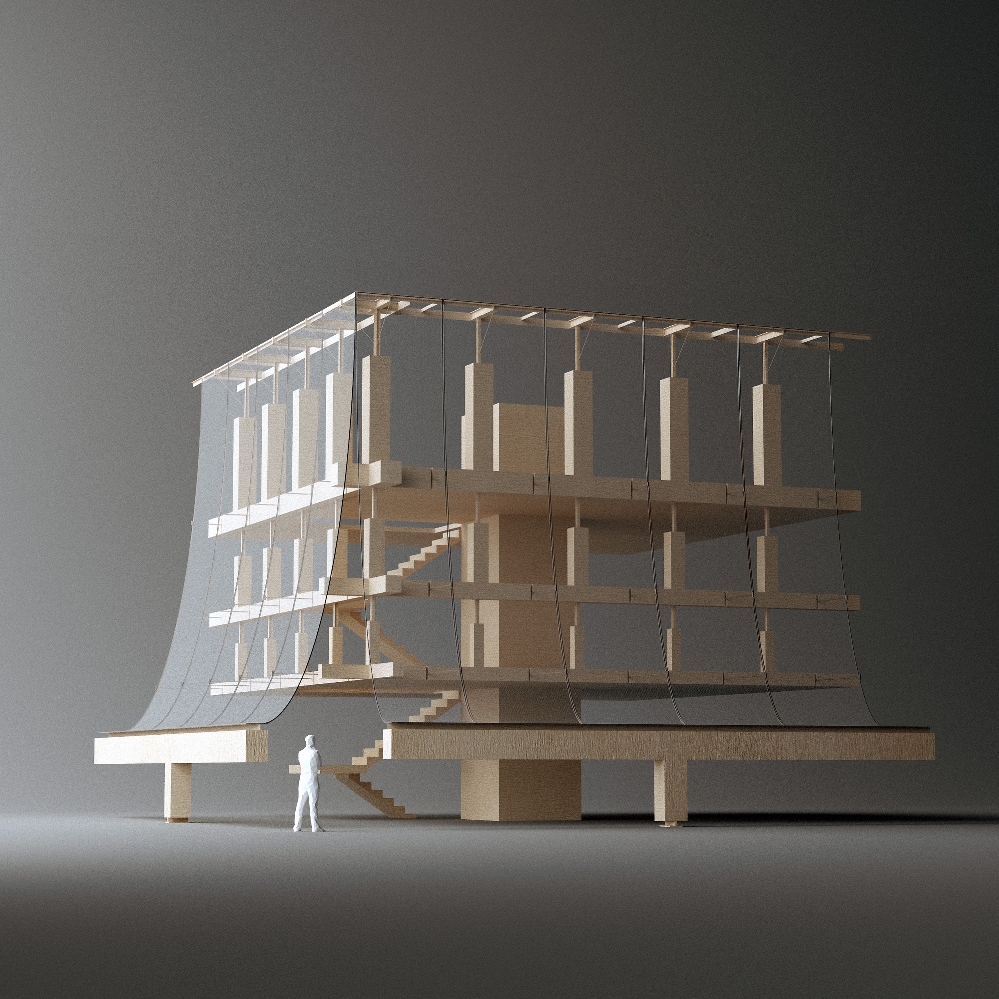 대지의 좁은 모서리 지점에서 베일은 펼쳐지며 부드러운 도시적 제스처를 만들어낸다. 그늘지고 사람을 끌어들이는 문턱으로서, 이러한 제스처는 건물을 부드러운 도시적 굴절점으로 변화시킨다. 조밀하고 활력 넘치는 근린 환경 속에서 호흡할 수 있는 반응적 코너를 제안하는 것이다.