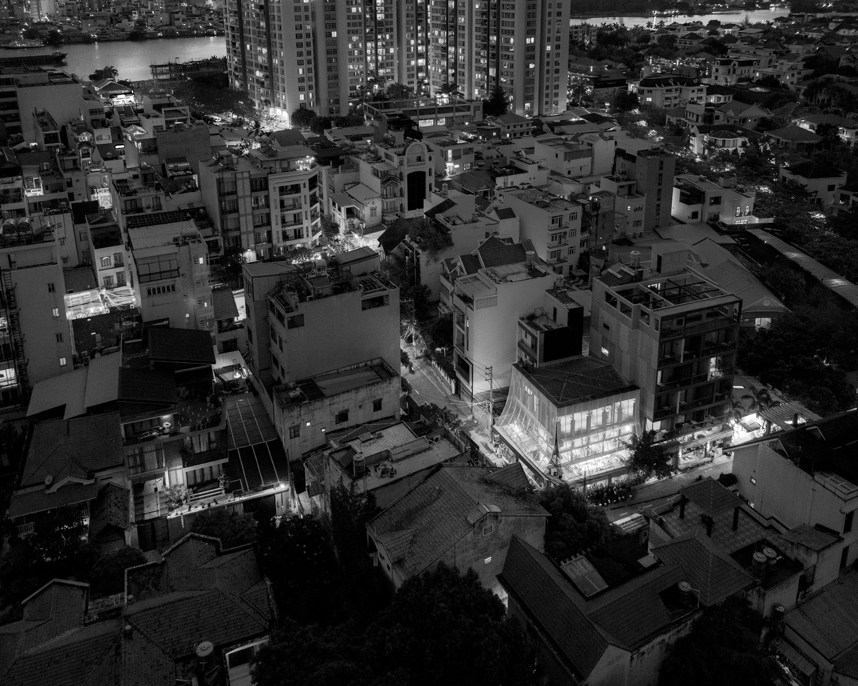 Ts VEIL은 호치민시 2구 중심부에 자리한 300제곱미터 규모의 3층 빌라를 재탄생시킨 프로젝트다. 주거와 상업시설, 로컬 식당들이 조밀하게 혼재하며 급속도로 변화하는 이 지역에서, 건축가는 철거와 신축이라는 관례적 접근법을 거부했다. 대신 기존 건물의 구조적 골격—콘크리트 프레임, 계단, 슬래브, 지붕—을 온전히 보존하면서, 이중의 새로운 표피 시스템을 통해 건축적 현존감과 공간적 성능을 근본적으로 재구상했다.