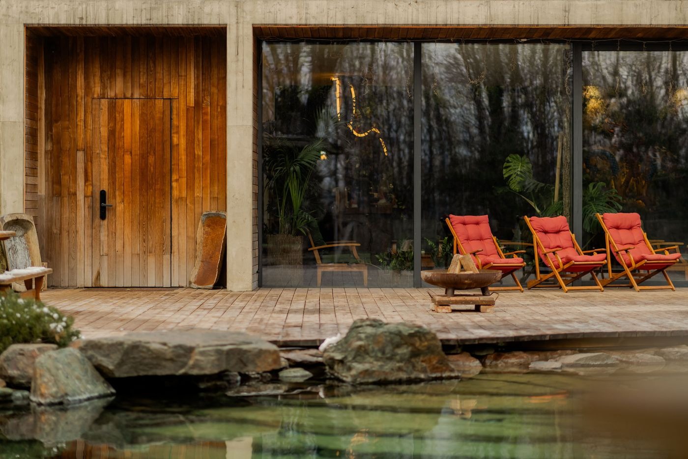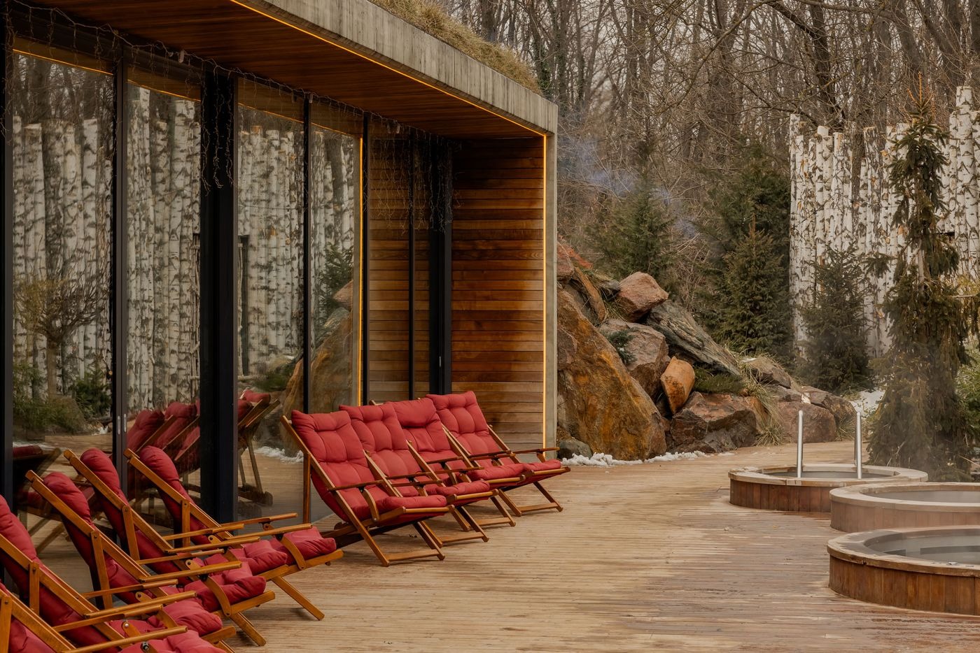 공동 공간들이 목재 데크 테라스로 자연스럽게 이어진다. 이곳에서 라운지 체어들이 호수처럼 맑고 잔잔한 수영장과 갈대와 바위 사이에 자리한 온수 욕조 옆에서의 휴식을 권한다.