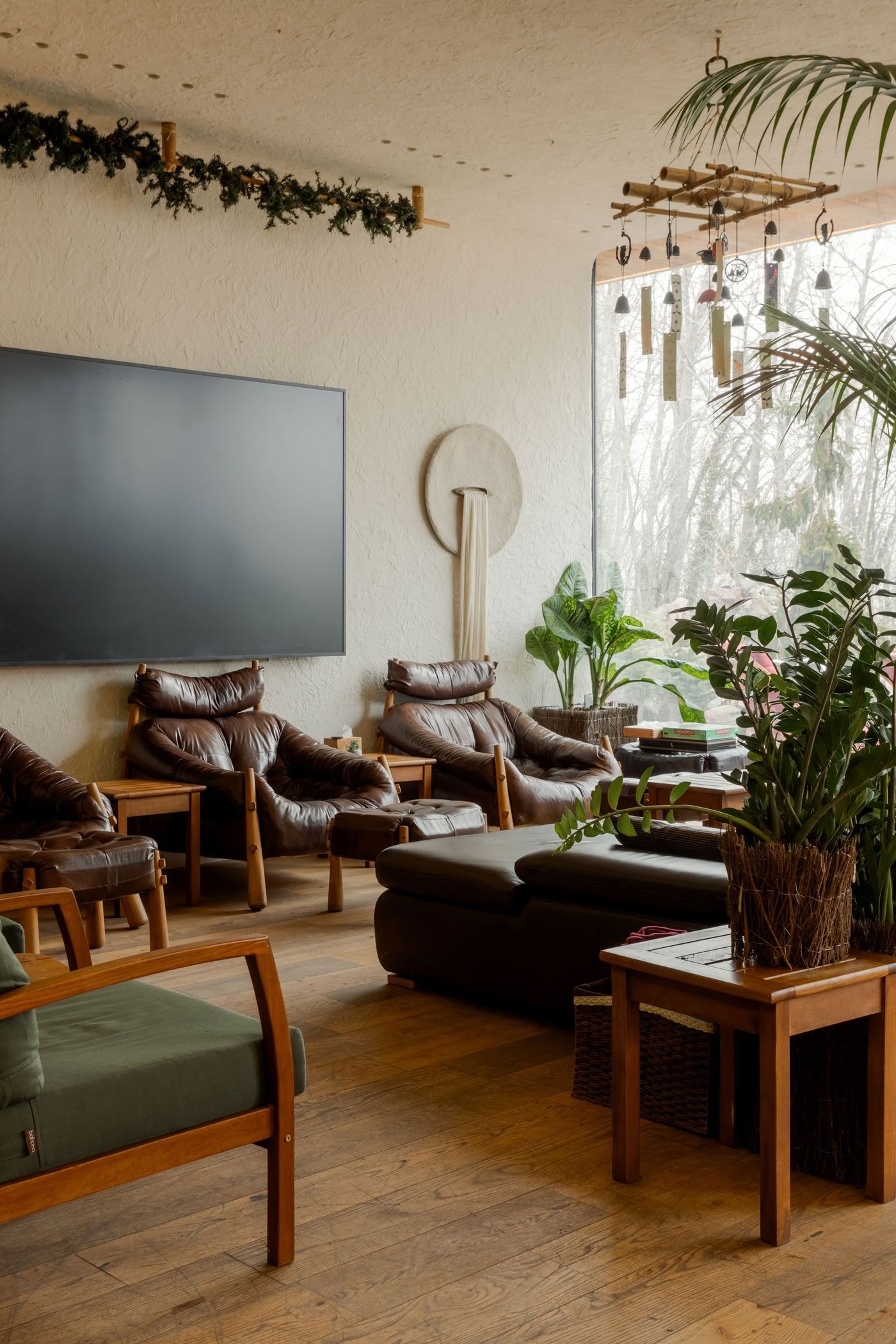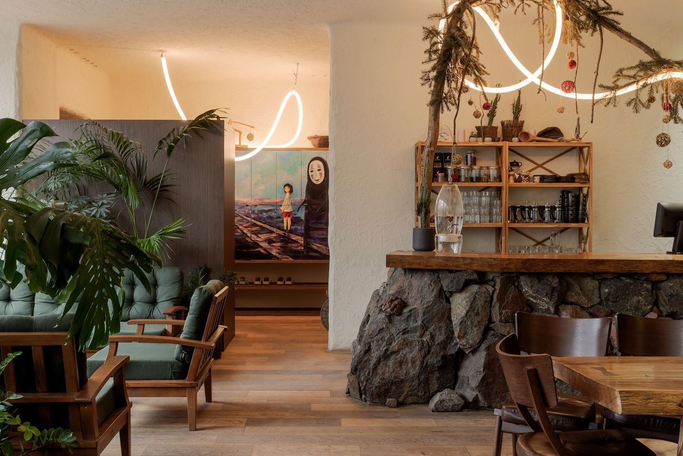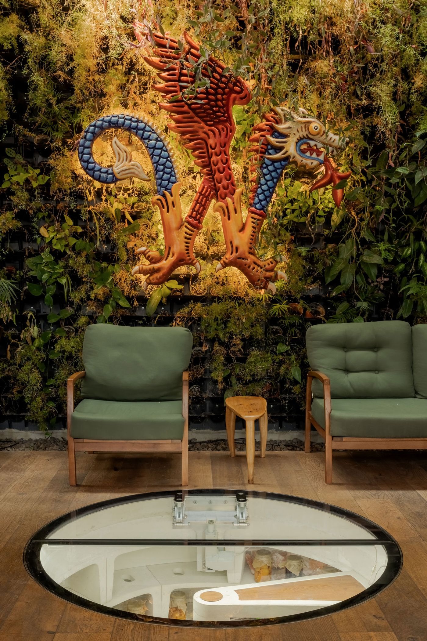 주 파사드를 가로지르는 통창(전면 유리창)이 자연광으로 공간을 가득 채우며, 안과 밖의 경계를 허문다. 마치 한옥의 대청마루에서 마당을 바라보는 것처럼, 내부와 외부가 하나의 연속된 공간으로 느껴진다. 반대편 벽면을 따라 푸르게 이어진 벽면 녹화 시스템이 자연에 품인 듯한 느낌을 더욱 강화한다. 곳곳에 자리한 풍성한 화분들, 나무 기둥들, 그리고 바위 같은 조형적 바 카운터가 이 분위기를 완성한다.