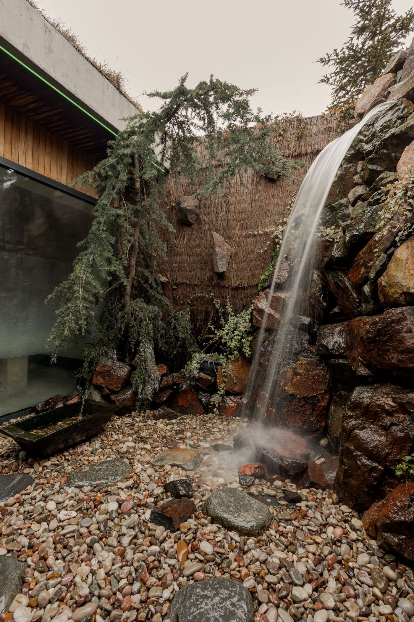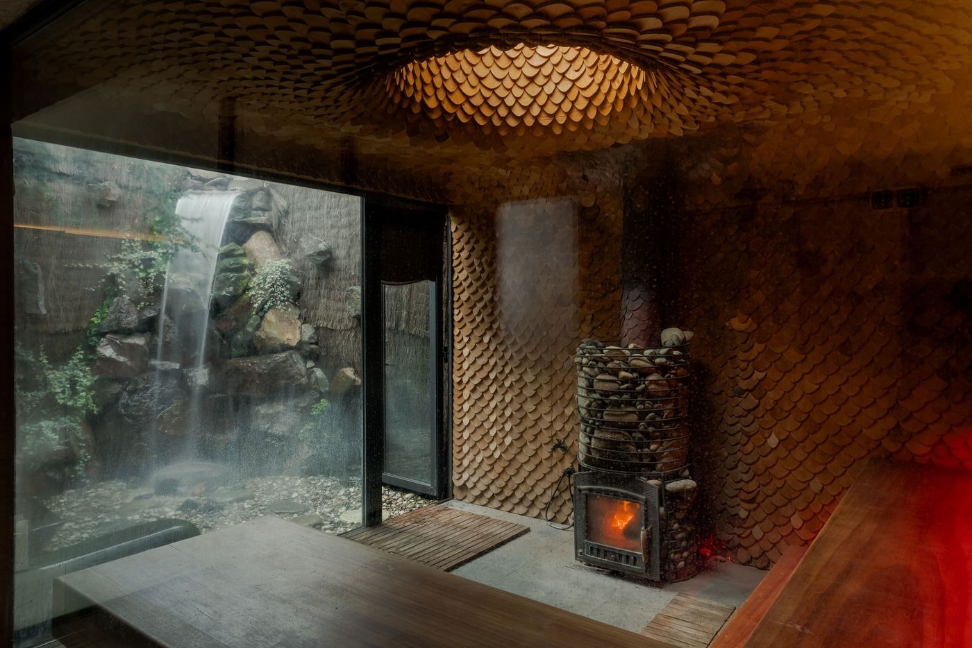 각기 다른 독특한 개성을 지닌 테라피실들은 또 다른 도피의 기회를 제공한다. 미니멀한 크림색 수치료실과 선적인 마사지 팔러에서부터, 용의 비늘을 닮은 목재 싱글로 감싸인 상상력이 풍부한 사우나까지. 사우나 내부의 돌 난로에서 피어오르는 적색 조명은 마치 고대의 의식 공간을 연상시킨다. 바로 옆 자갈 파티오에서는 자연 폭포 아래에서 몸을 식히는 특별한 경험이 기다린다.