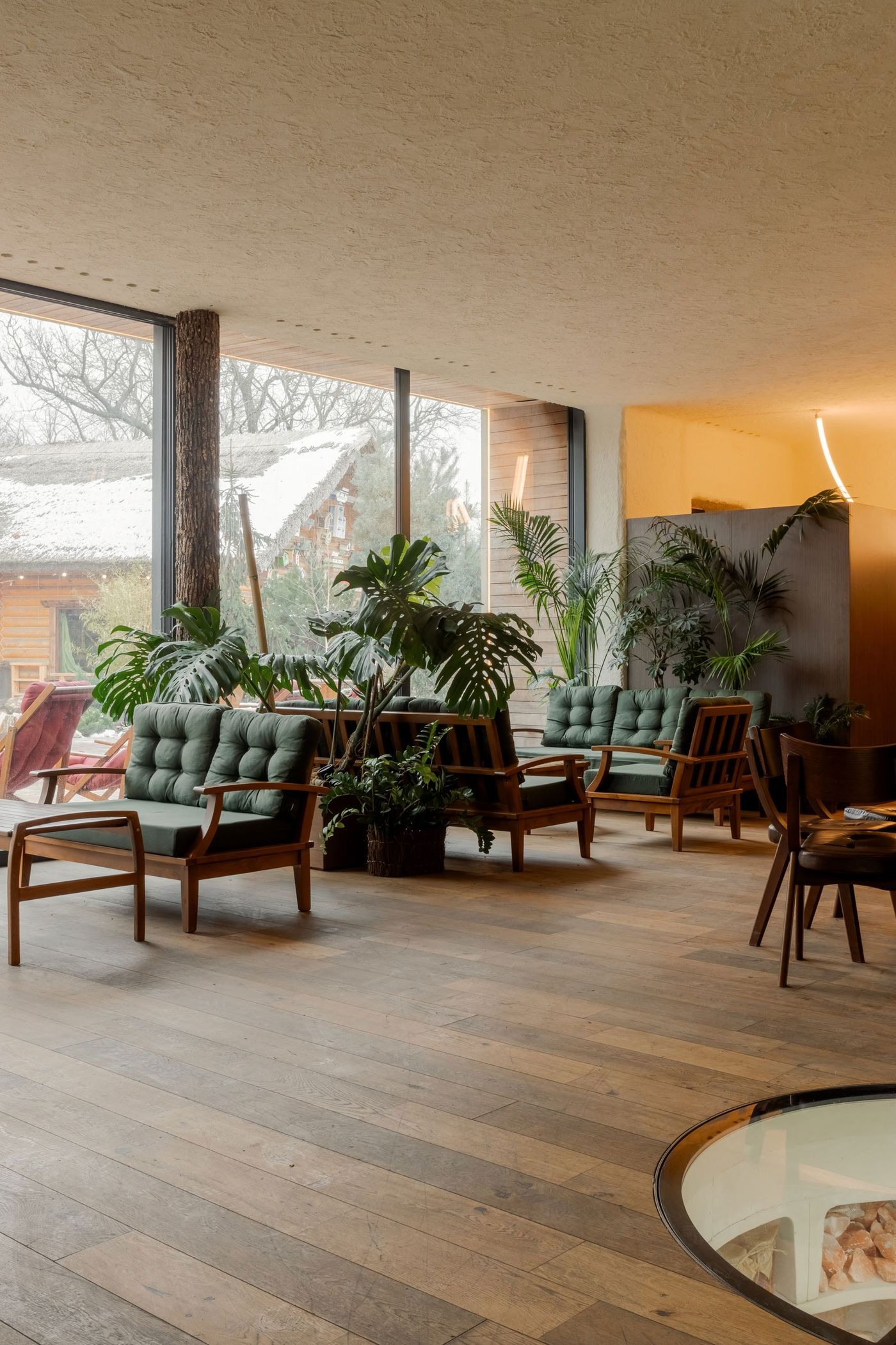 Stepping inside, the atmosphere is at once nostalgic and otherworldly. The heart of the bathhouse is a spacious, multi-functional social area—an inviting expanse punctuated by sitting areas and communal dining tables. Expansive, full-height glazing stretching across the main façade, floods the space with natural light, dissolving the boundary between interior and exterior. A living green wall running the length of the opposite side further reinforces the sense of being enveloped by nature, as do abundant potted plants, tree trunk columns, and a boulder-like sculptural bar counter.