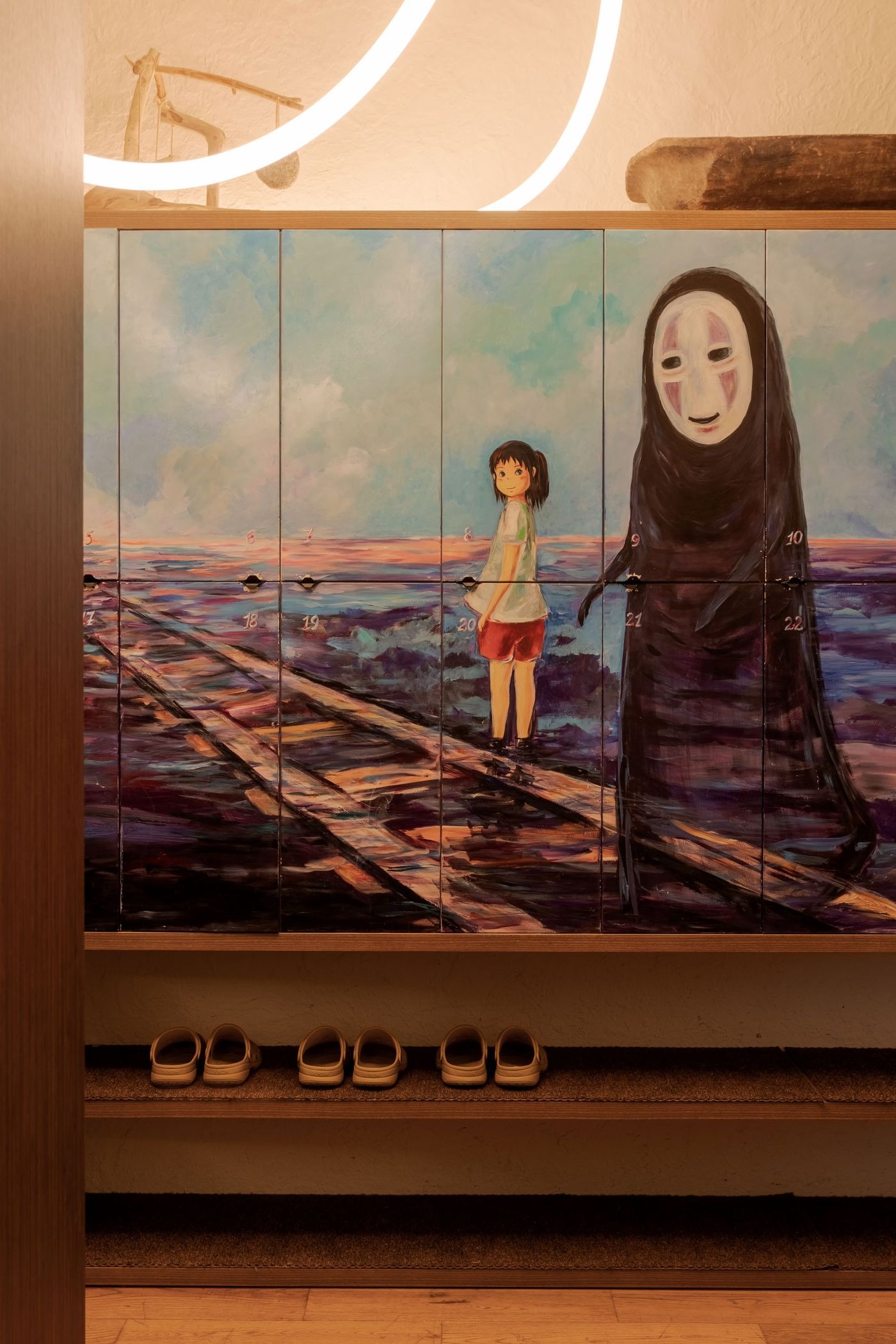 탈의실조차 다른 세계로의 관문이 된다. 로커들이 스튜디오 지브리의 '센과 치히로의 행방불명'에서 영감을 받은 벽화로 장식되어 있다. 이는 이 목욕시설의 궁극적 목표에 대한 시적 오마주다. 그 유명한 애니메이션 영화 속 환상적인 목욕탕처럼, 방문객들에게 몸과 영혼의 몰입적 정화를 제공하겠다는 건축가의 의지가 담겨 있다.