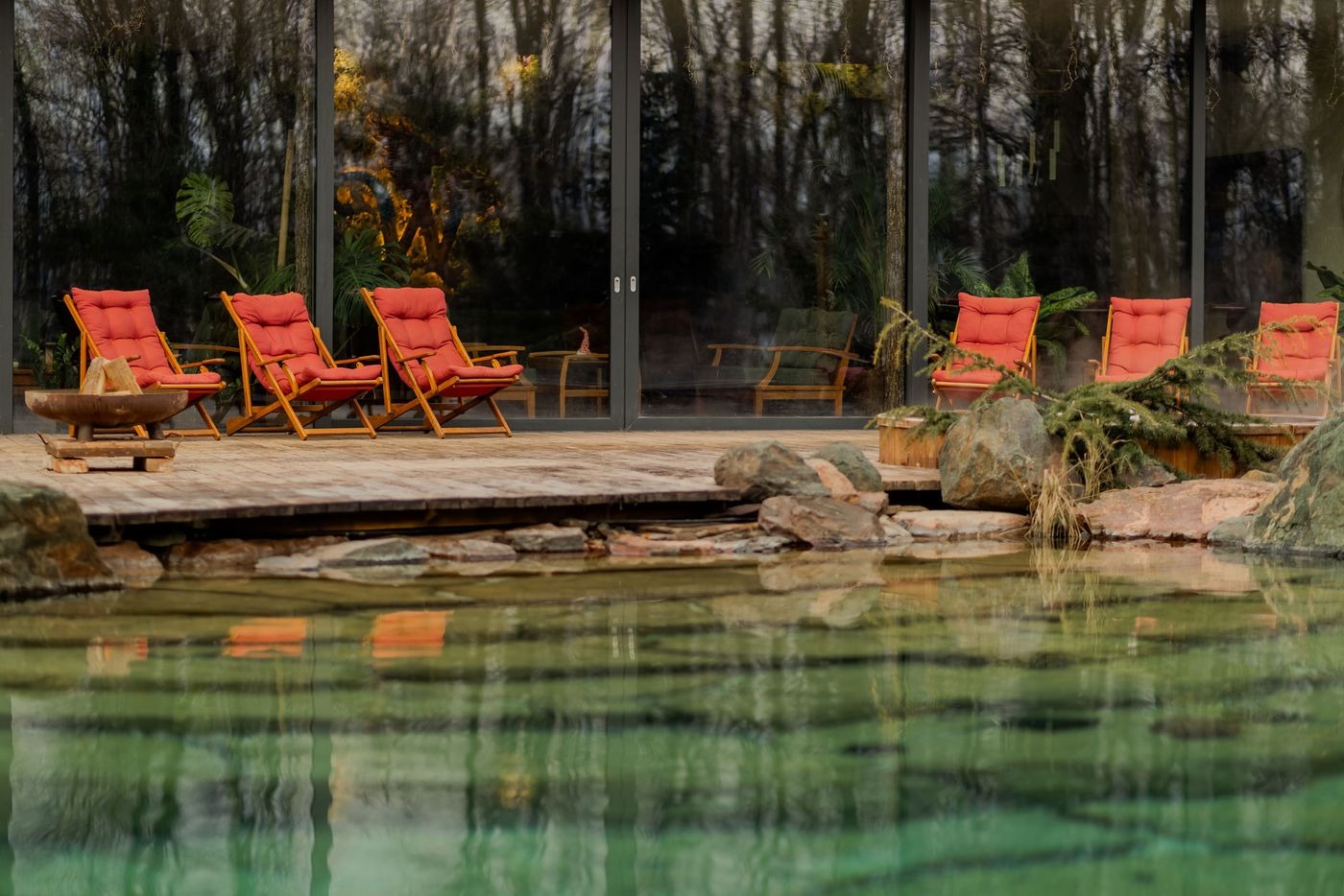 The communal spaces flow effortlessly onto a decked terrace, where lounge chairs invite relaxation beside the crystalline waters of the lake like swimming pool and hot tubs nestled amongst reeds and boulders. Treatment rooms, each with its own distinct character, offer further opportunities for escape: from the minimalist, cream-hued hydrotherapy room and zen-like massage parlour to the imaginative sauna enveloped in timber shingles reminiscent of dragon scales through to the adjacent pebbled patio where guests can cool down under a waterfall.