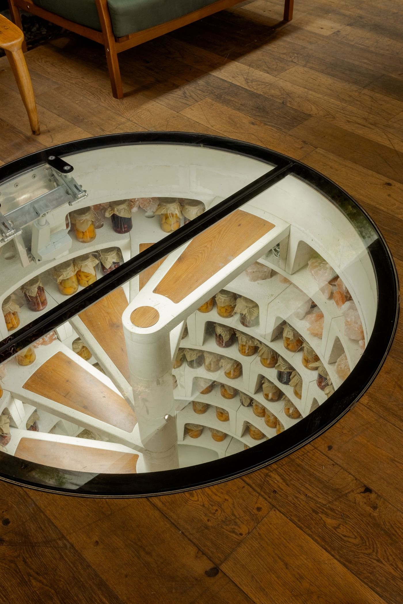 바닥에 뚫린 원형 유리 개구부는 지하 저장고를 엿보는 기발한 창문 역할을 한다. 절임 식품들이 저장된 이 공간은 몰도바 지역 전통과 건물의 몰입적이고 거의 마법 같은 분위기에 대한 유쾌한 오마주다.