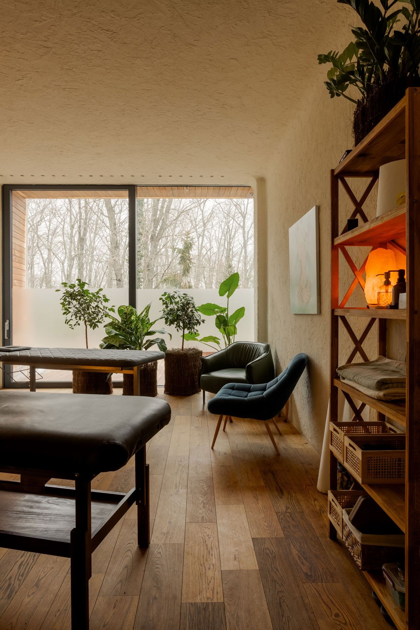 Hardwood floors, textured plastered walls and hand carved wooden furnishings evoke vernacular craftsmanship, while mid-century-inspired armchairs and sofas add a layer of understated elegance. A circular glass opening in the floor offers a whimsical glimpse into an underground cellar stocked with pickled goods in a playful nod to both local tradition and the building’s immersive, almost enchanted ambience.