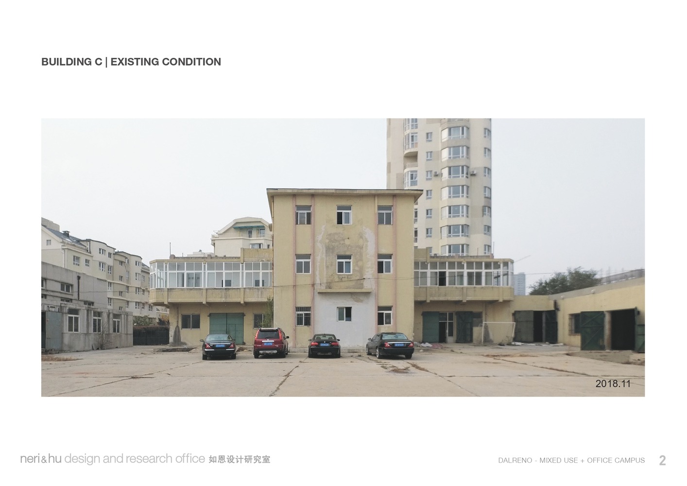 Our design for a new mixed use creative development is located in the heart of Dalian in close proximity to university campuses and software parks. The existing compound comprises 6 buildings dating back 40 years, which formerly served as offices, warehouses, and dormitories for a chemical research institute. Our design challenge was to find an architectural language that could unify the buildings which all have varying heights and distinct facades which have undergone previous renovation efforts. The most prominent building within the site is a former workers dormitory featuring a series of wooden gates and garage stalls used for repairs in the past.