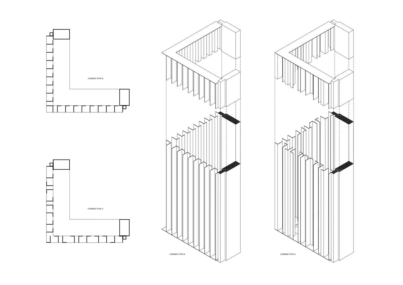 기존 건물들은 U자형으로 배치되어 있었지만, 중앙의 넓은 주차장을 향해 등을 돌리고 있는 듯 내향적인 성격이 강했다. 네리앤후는 이 U자형 구성을 완성하여 온전한 중정을 만들어냈다. 새로운 벽과 스크린, 캐노피들이 하나의 연속적인 공간 체계를 이루며 플라자를 감싸 안는다. 이렇게 형성된 위요된 공간은 사적이면서도 친밀한 영역감을 조성한다.