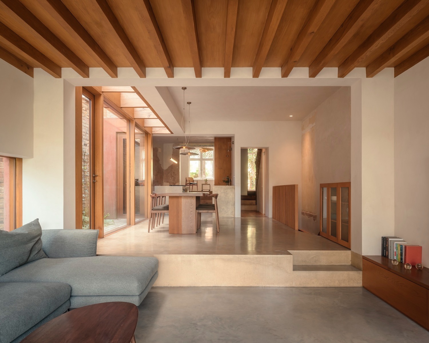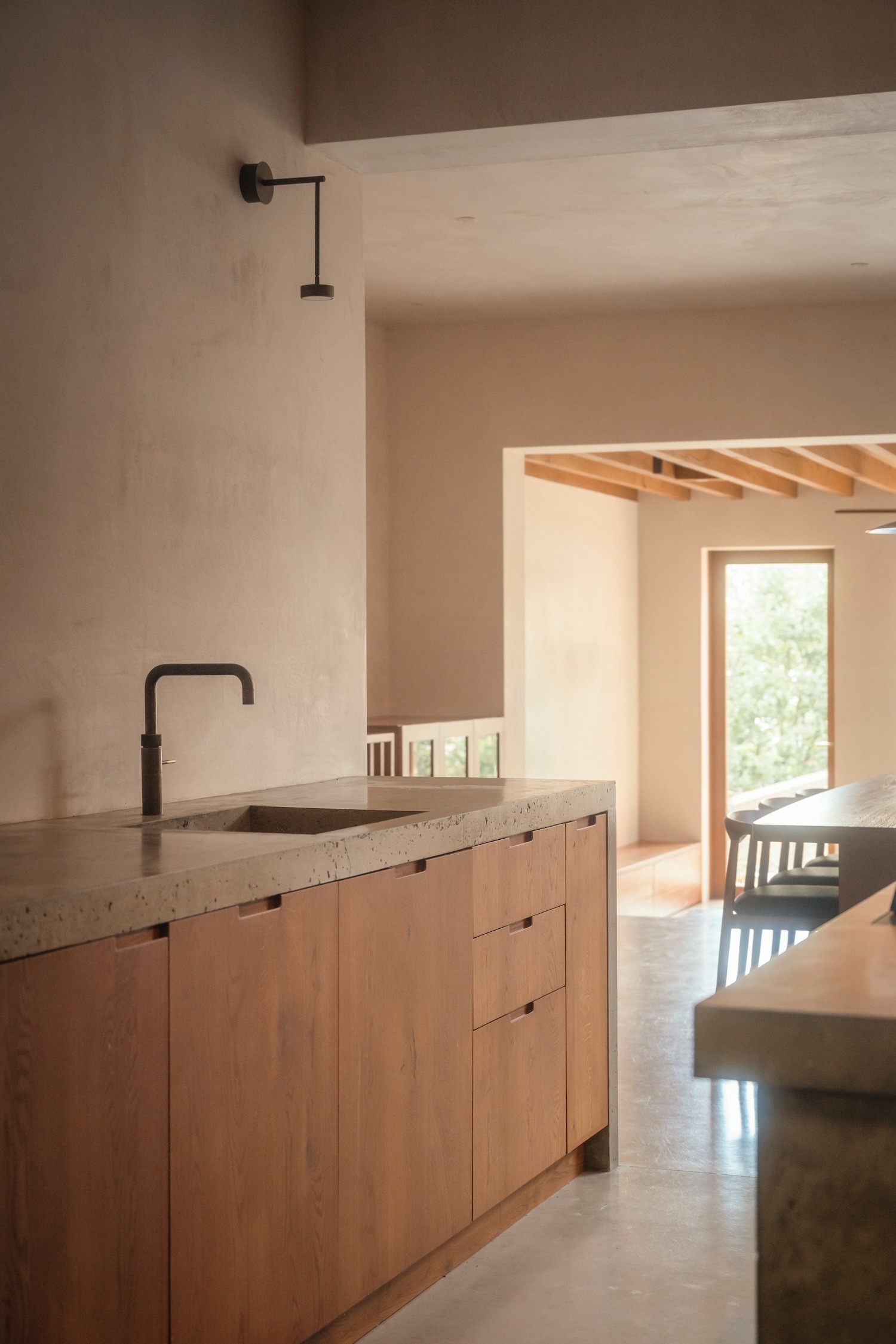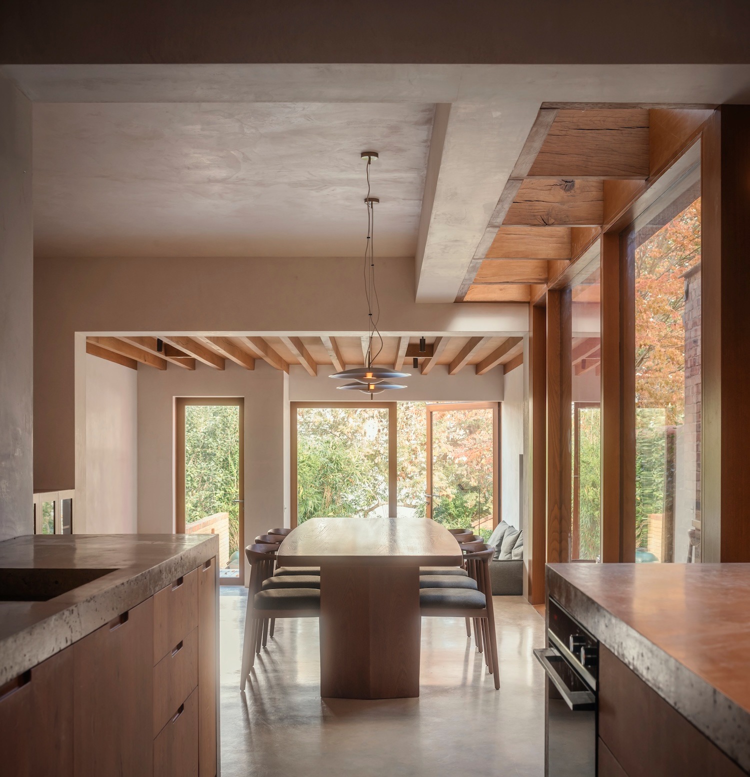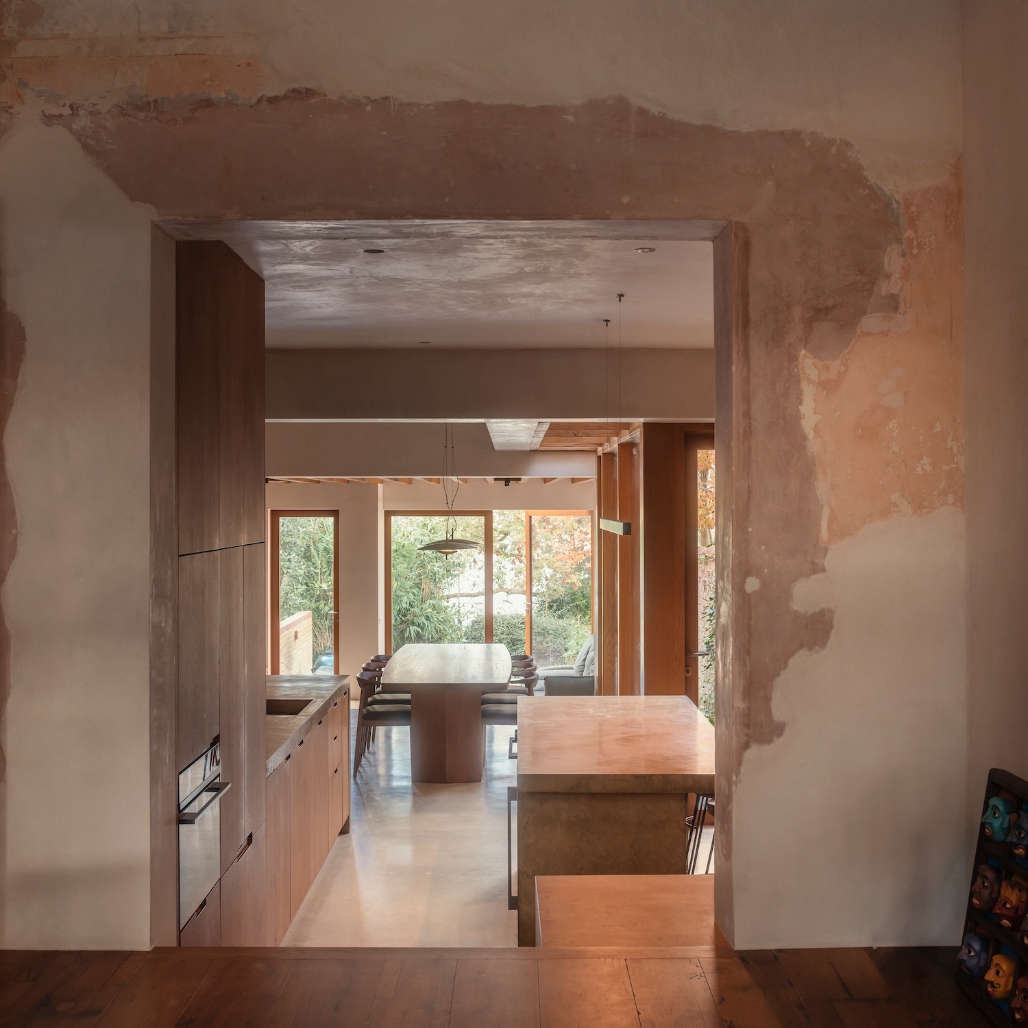 겉보기에 단순한 이 색채 선택은 프로젝트의 깊은 철학을 드러낸다. 건물의 영국적 뼈대를 존중하면서도 거주자의 문화적 정체성을 자연스럽게 품어내겠다는 의지다. 오크와 콘크리트, 라임 플라스터가 어우러져 만들어내는 재료적 대화는 뿌리 깊으면서도 세계적인 감성을 자아낸다.