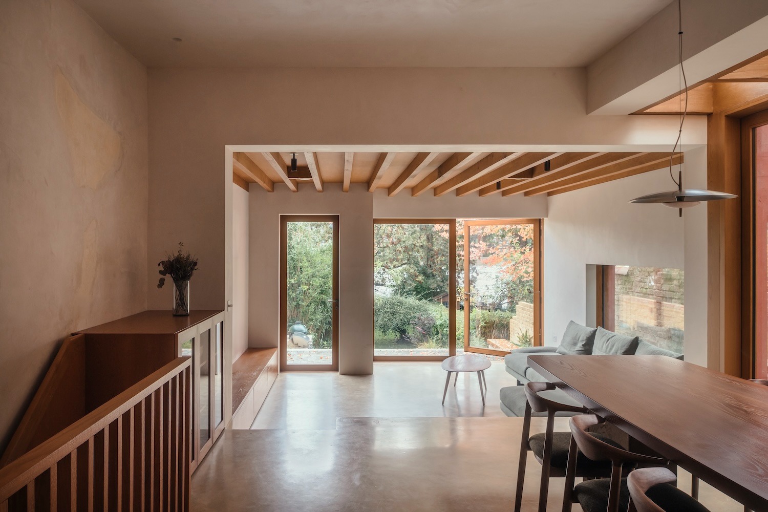 특히 주목할 만한 것은 완전히 열렸을 때 발코니 난간으로 변모하는 대형 새시 창이다. 이는 단순한 복원을 넘어선 창의적 해석의 결과물이다. 1층의 프렌치 도어들은 실내와 템스강변 풍경 사이의 경계를 완전히 해체한다. 건축가들의 표현을 빌리면 "정원을 집 중심부로 초대하는" 마법 같은 장치다.
