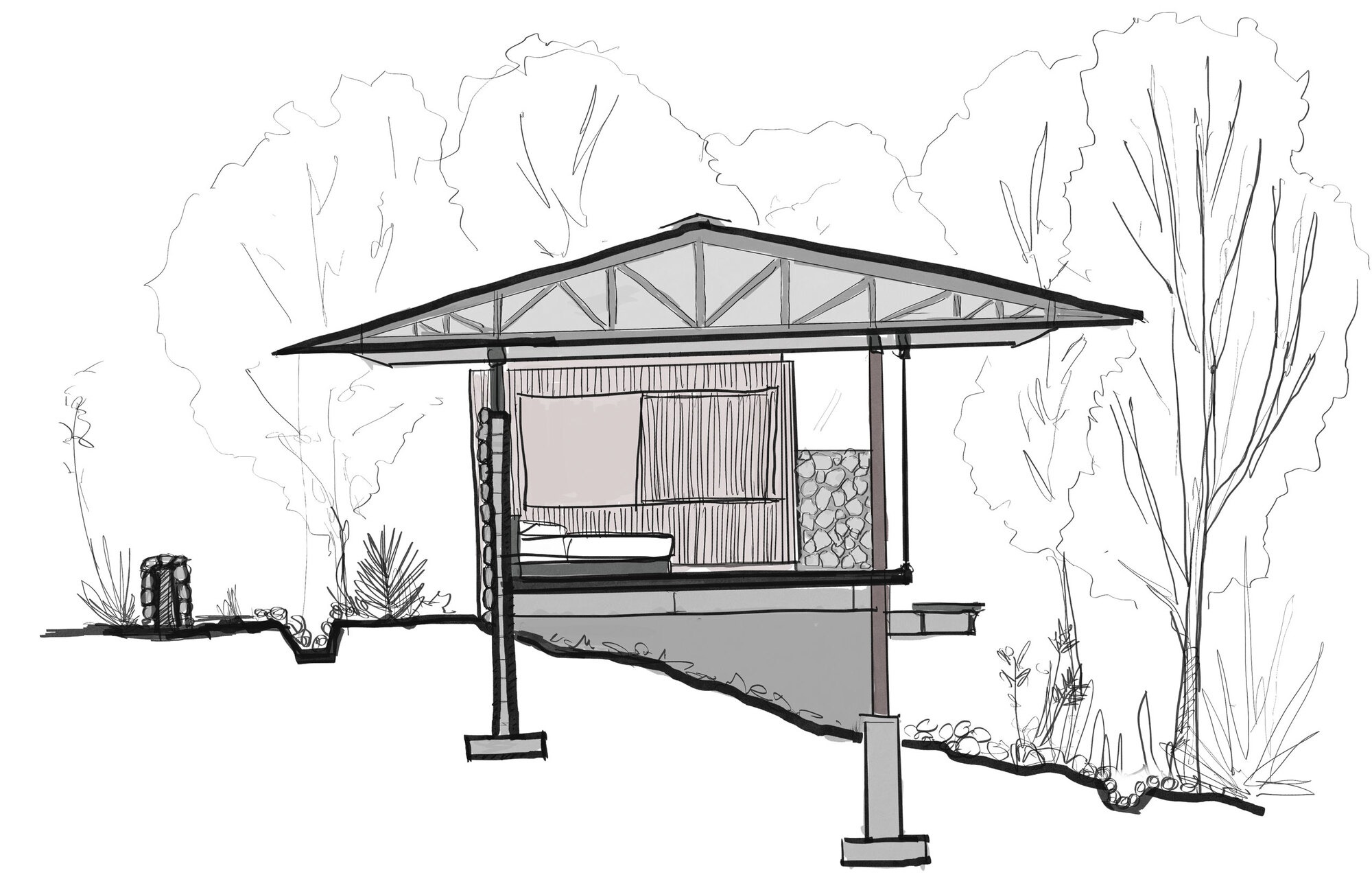 A carefully positioned stone wall functions as a visual barrier offering privacy while simultaneously revealing the canyon and anchoring the building to the ground. This design intention articulates the transition between shared and private spaces, reflecting both the site’s topography and the region’s cultural heritage.