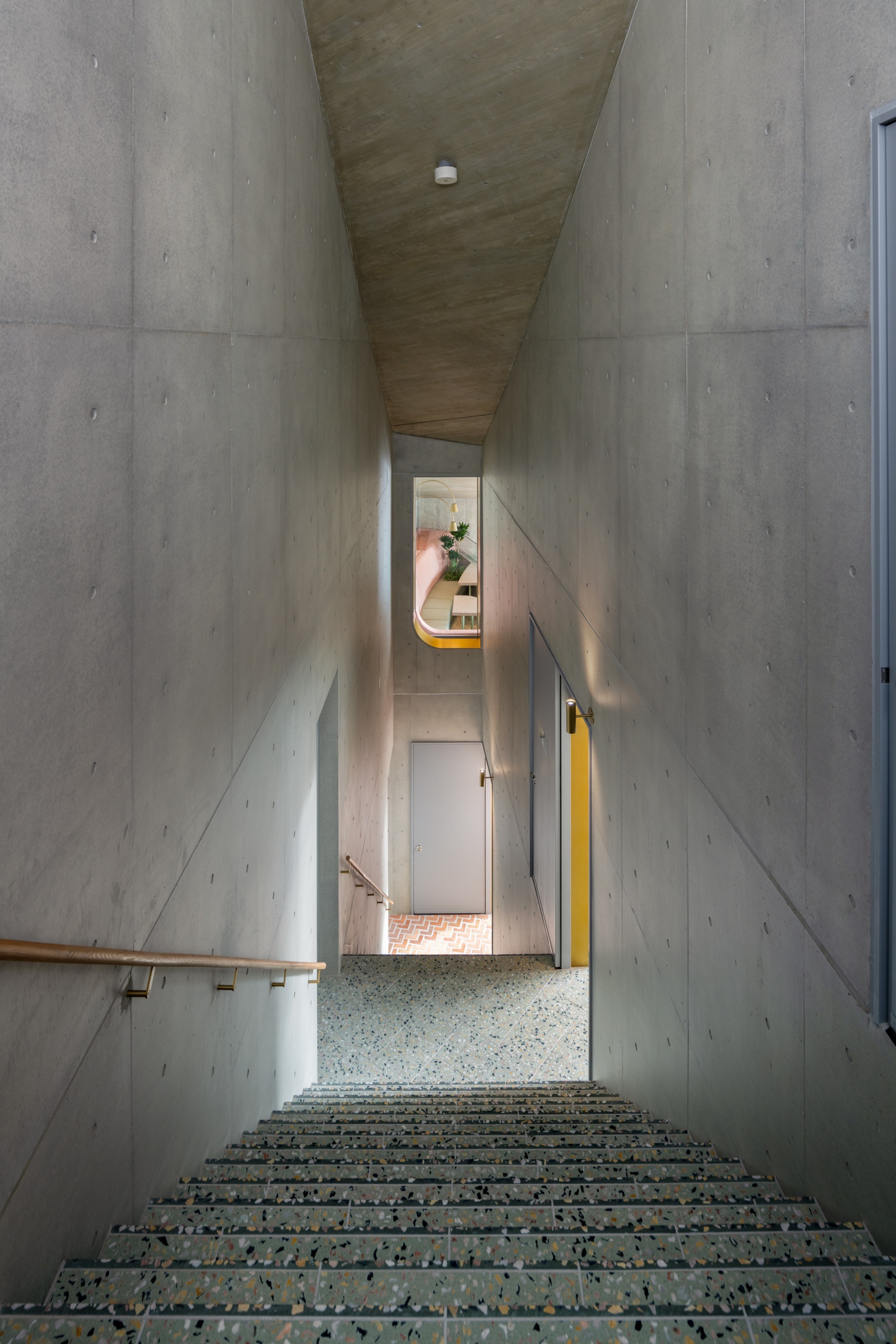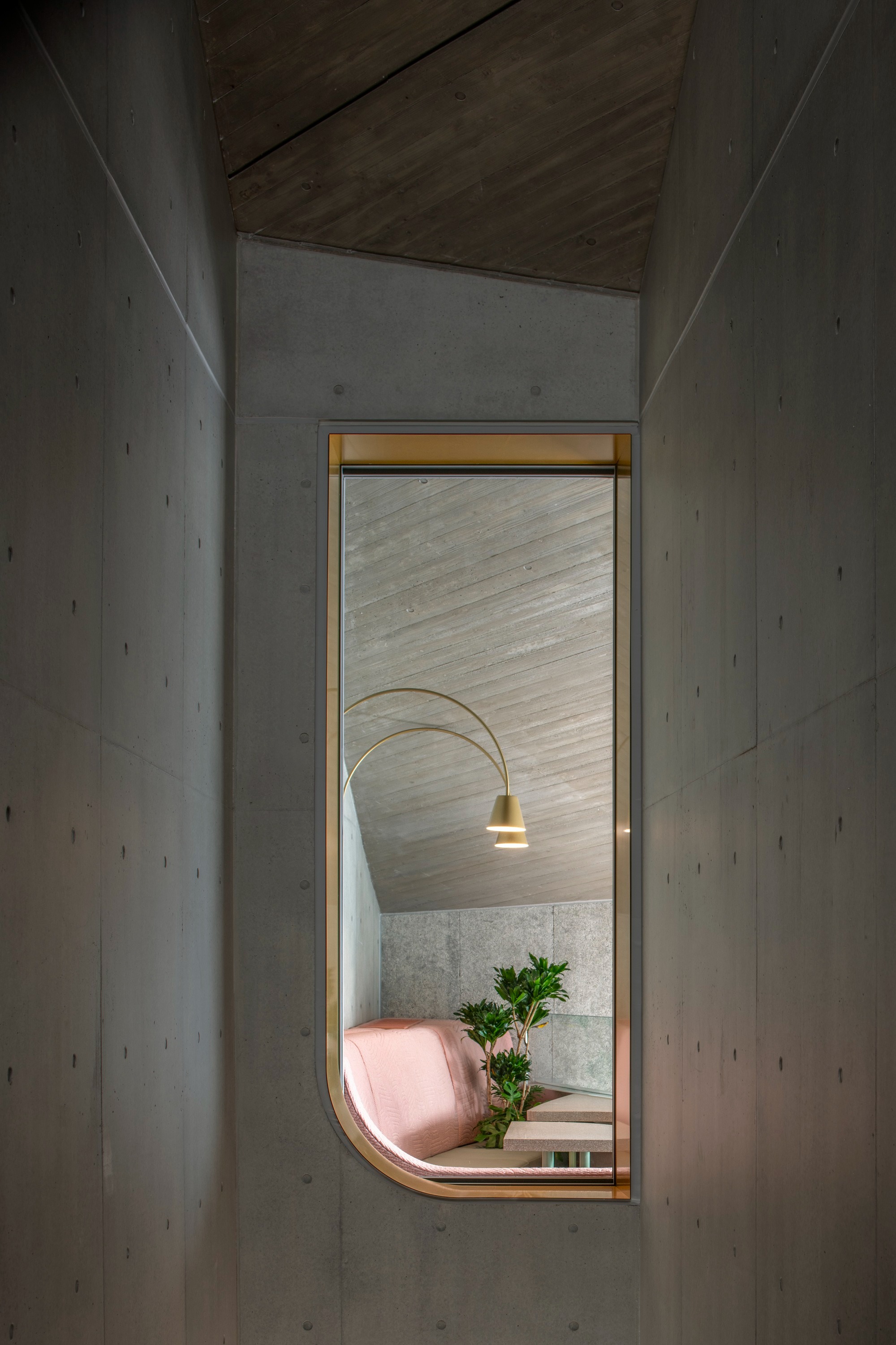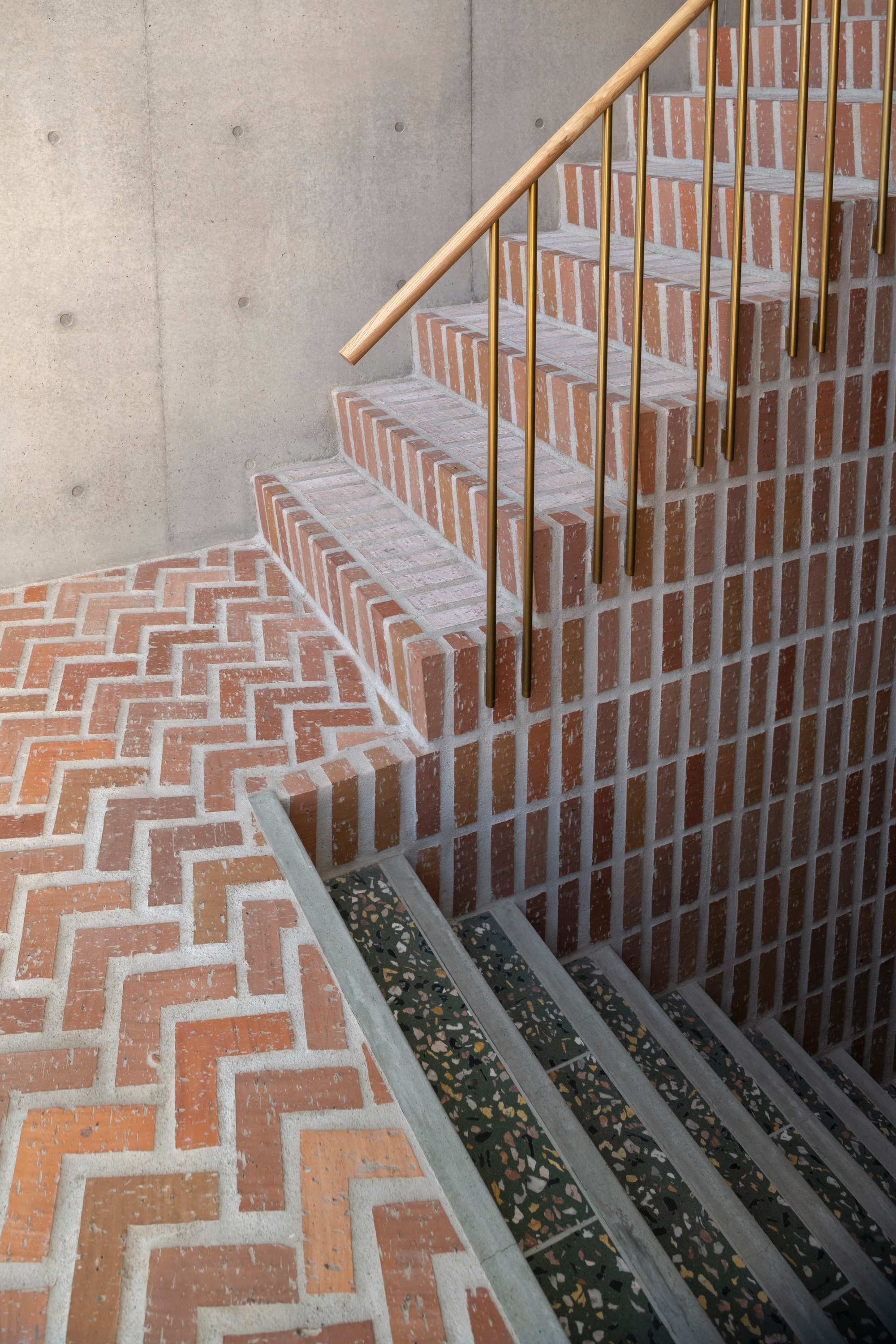 높은 용적률의 대로변, 고층 아파트들 사이에 자리한 이 부지는 도시의 압박감이 고스란히 느껴지는 곳이다. 하지만 건축가는 이러한 제약을 오히려 기회로 전환한다. 지하 다목적 이벤트홀 위에 조성된 중정은 자연광을 지하까지 끌어들이는 하이사이드 창을 위해 가장자리를 섬세하게 높여 처리했다.