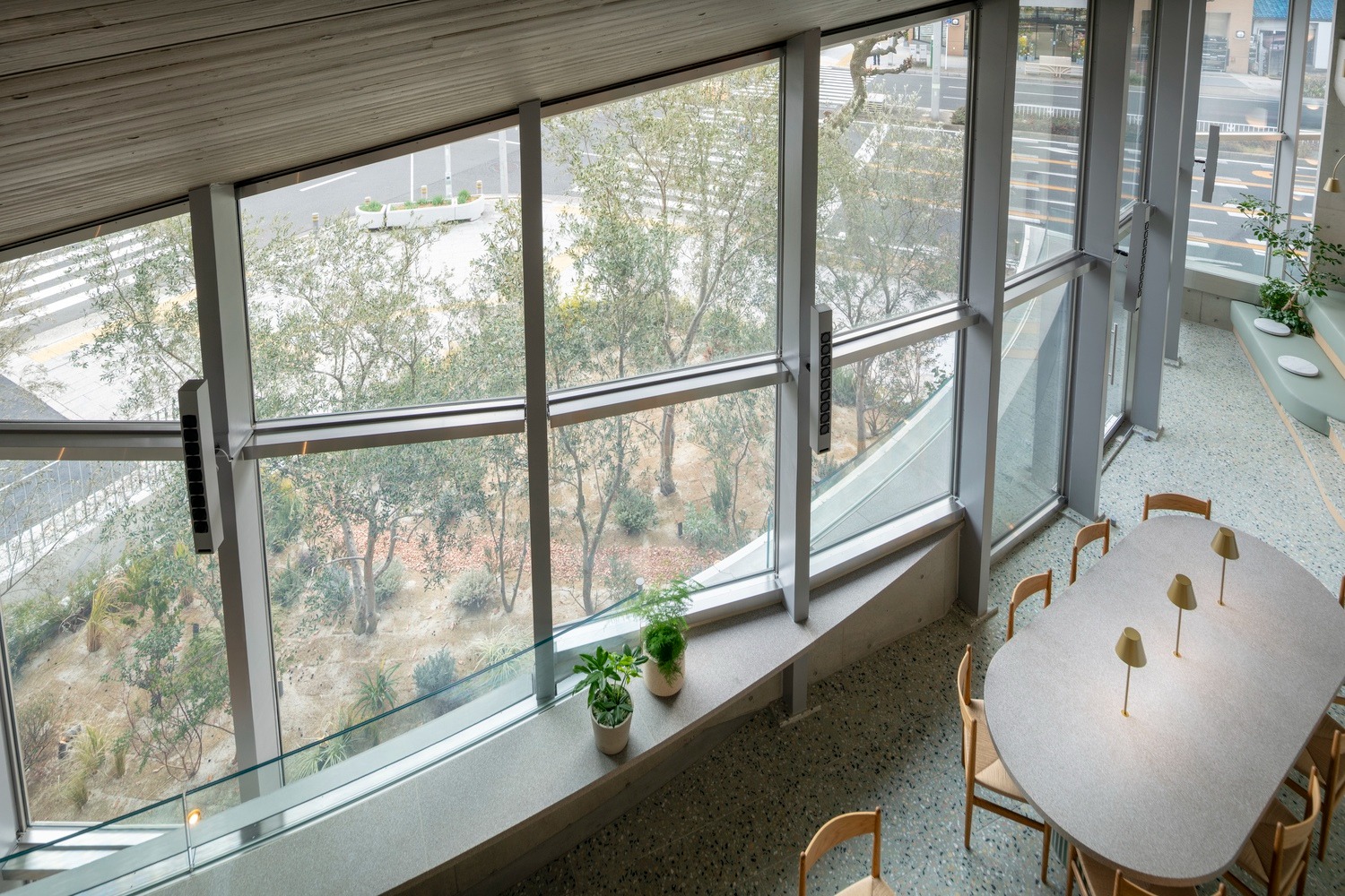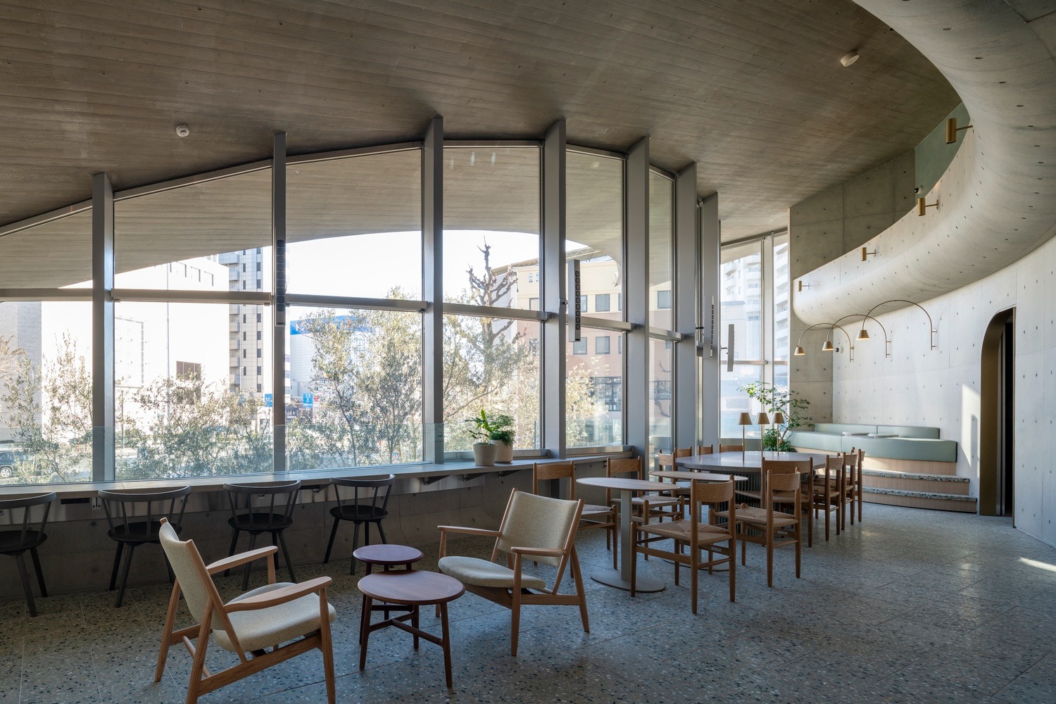 2층은 온전히 좌석 공간으로 구성된다. 고객들 앞으로 중정의 올리브 숲이 펼쳐지며, 도시의 번잡함으로부터 평온한 휴식을 선사한다. 3층 바 공간에서는 카페 내부와 중정, 그리고 아래로 내려다보이는 분주한 대로의 풍경까지 한눈에 담을 수 있다.