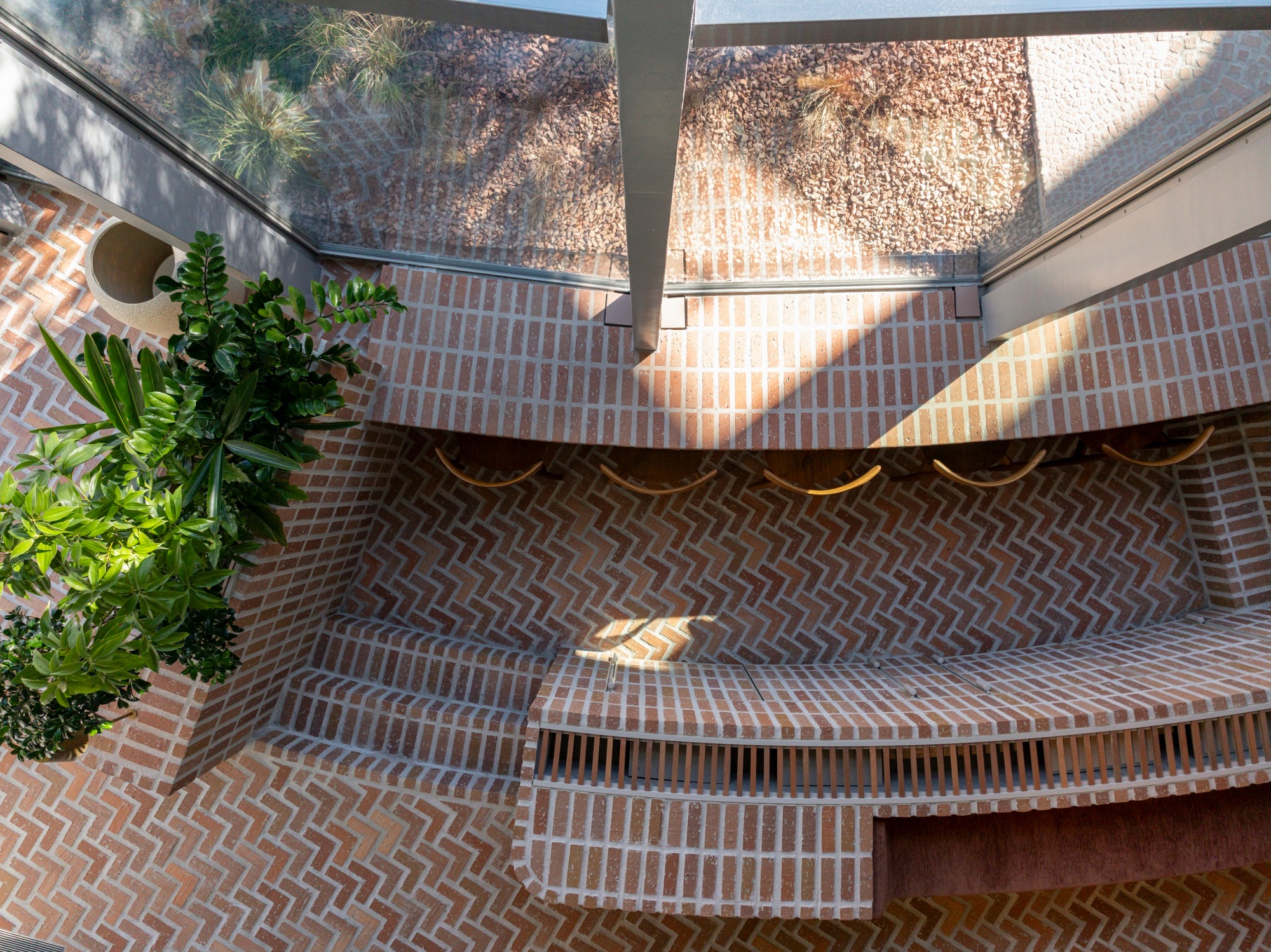 The courtyard, positioned above the event hall, features a partially raised edge to accommodate a high-side window that lets natural light into the basement. Beneath the expansive roof lies the café, spanning three floors with an atrium. The first floor houses the serving counter, the kitchen and the roastery. Seats are recessed into the floor along the ground floor windows, drawing the eye outward toward the view. The second floor is dedicated to seating. The olive grove in the courtyard spreads out in front of the customers, offering a peaceful escape from the hustle and bustle of the city.