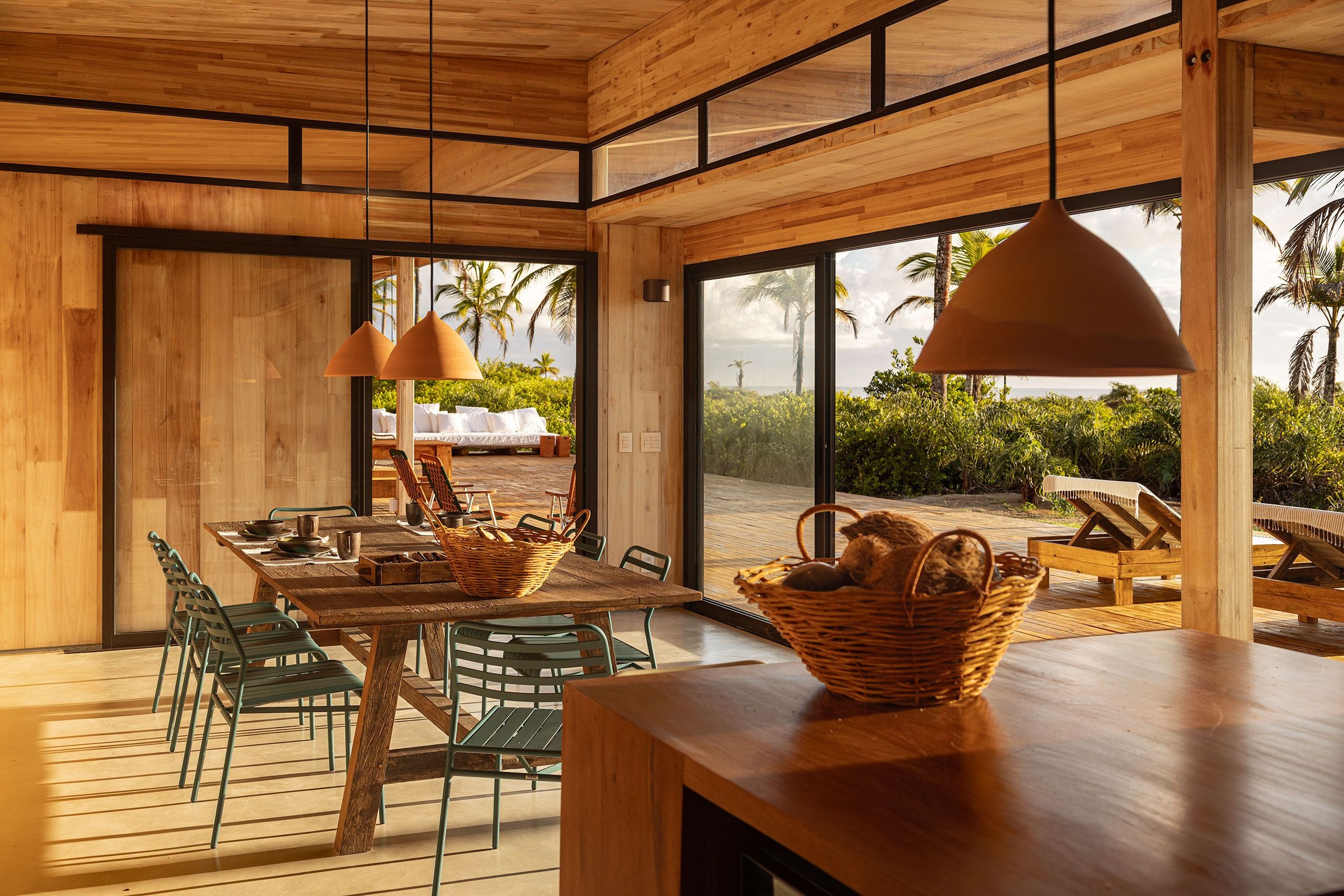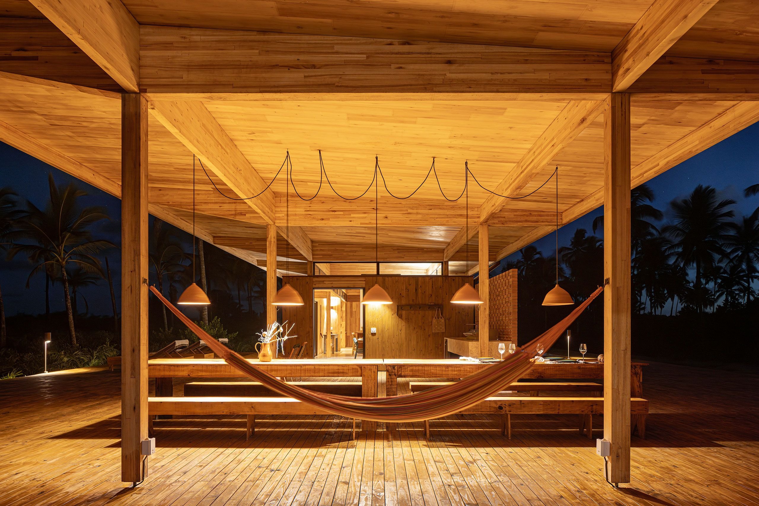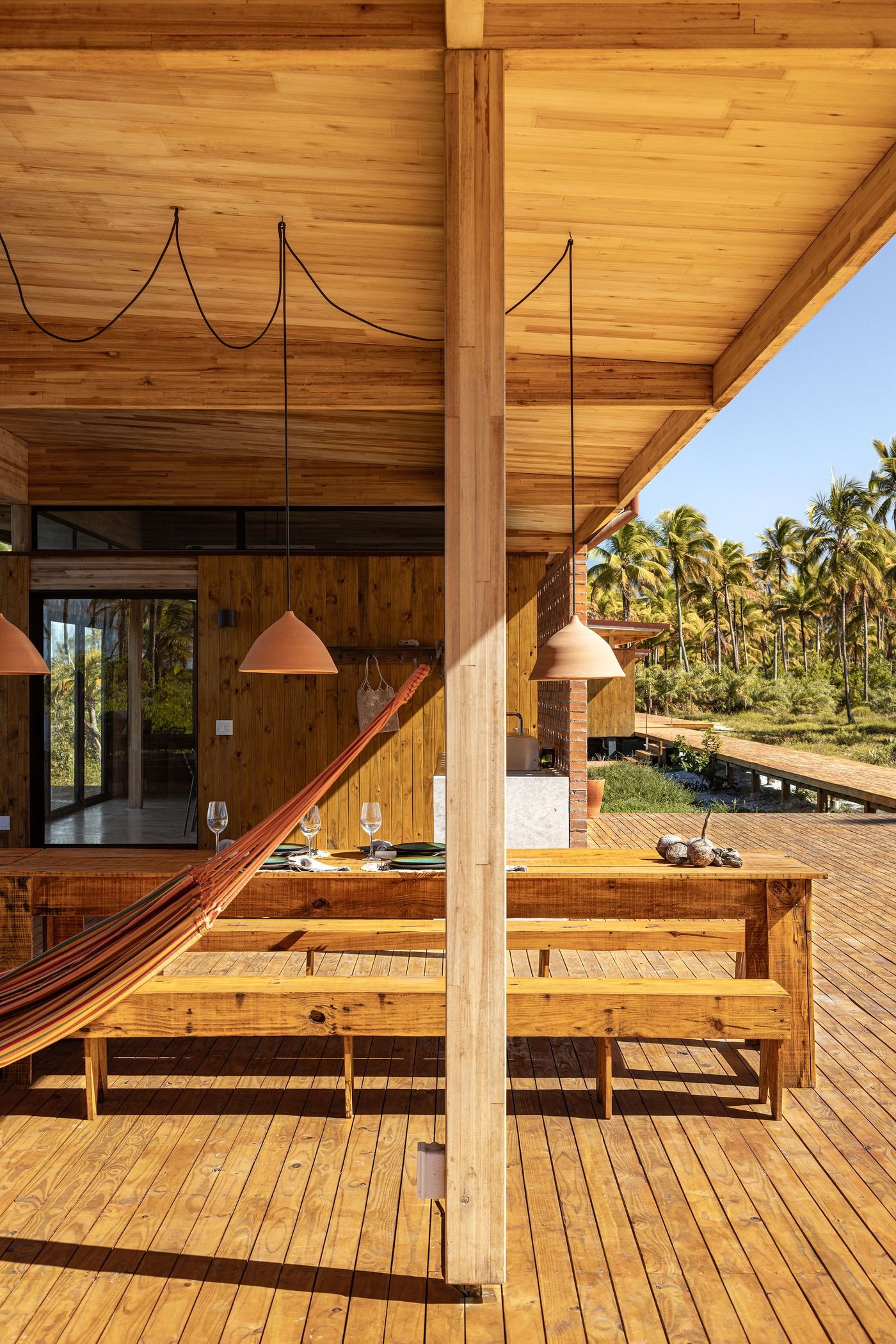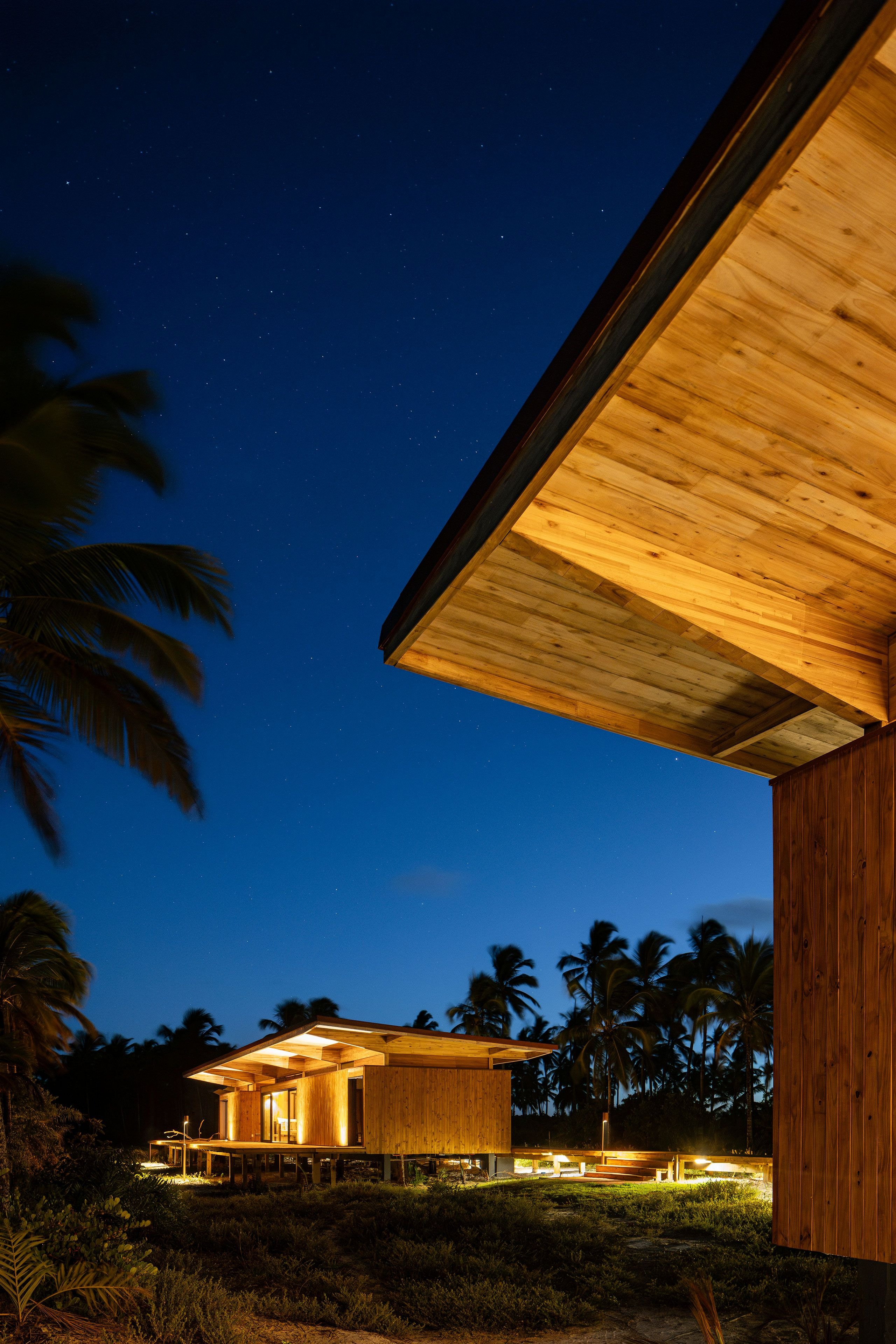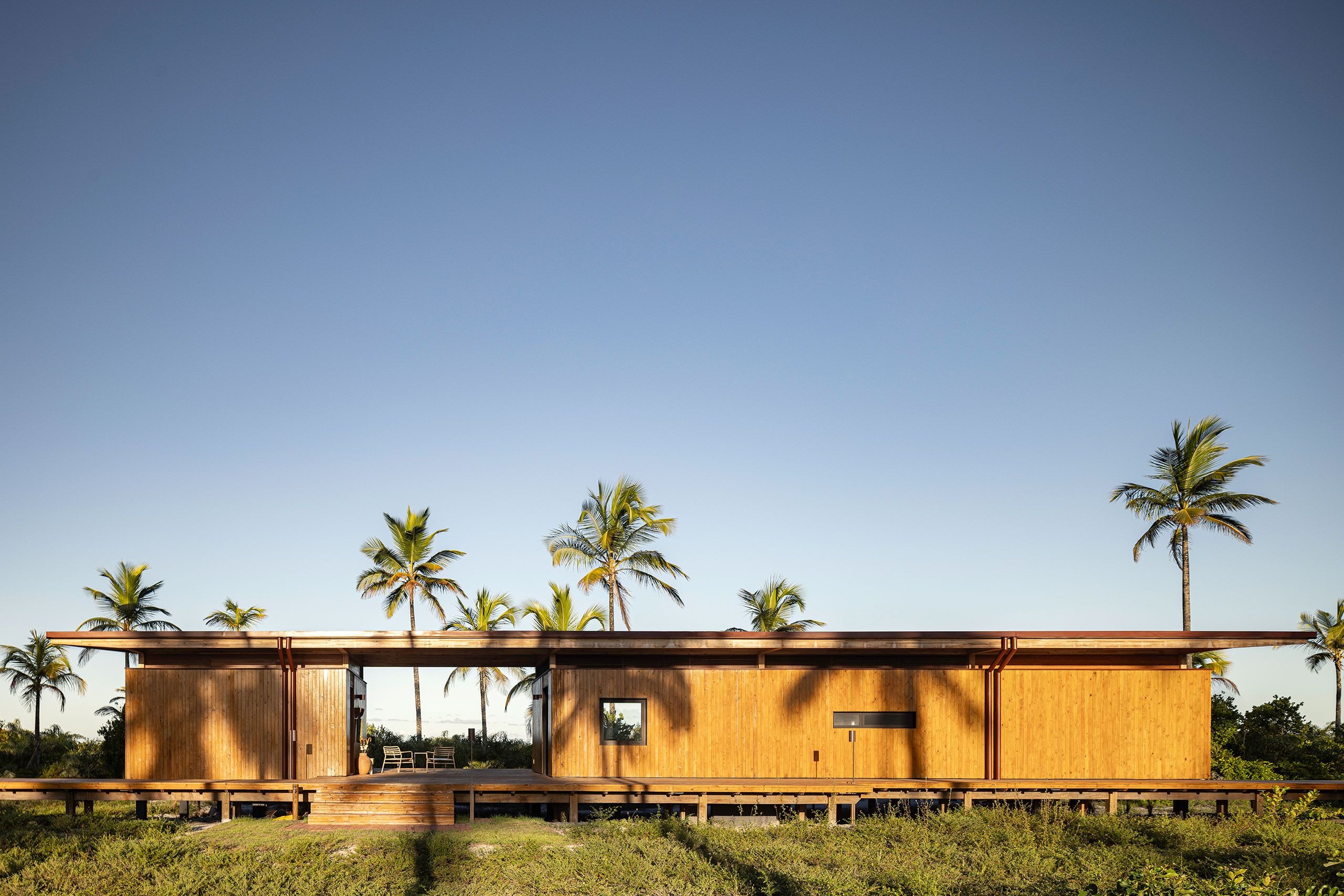 In this project, aptly named Modular Bahia, the prefabricated modules are configured into three distinct structures, two private residences flanking a communal pavilion, connected via wooden walkways. Slightly elevated on wooden stilts to preserve the site’s native vegetation and natural drainage, the buildings appear to float within the coconut grove, their light footprint minimizing disruption while heightening their connection to the landscape. Composed of open frames and wide overhangs that blur the lines between inside and out, the structure’s slender horizontality mirrors the flatness of the terrain, while its timber cladding dissolves into the rhythm of the palms. Seen from the shoreline, the retreat barely announces itself in any way.