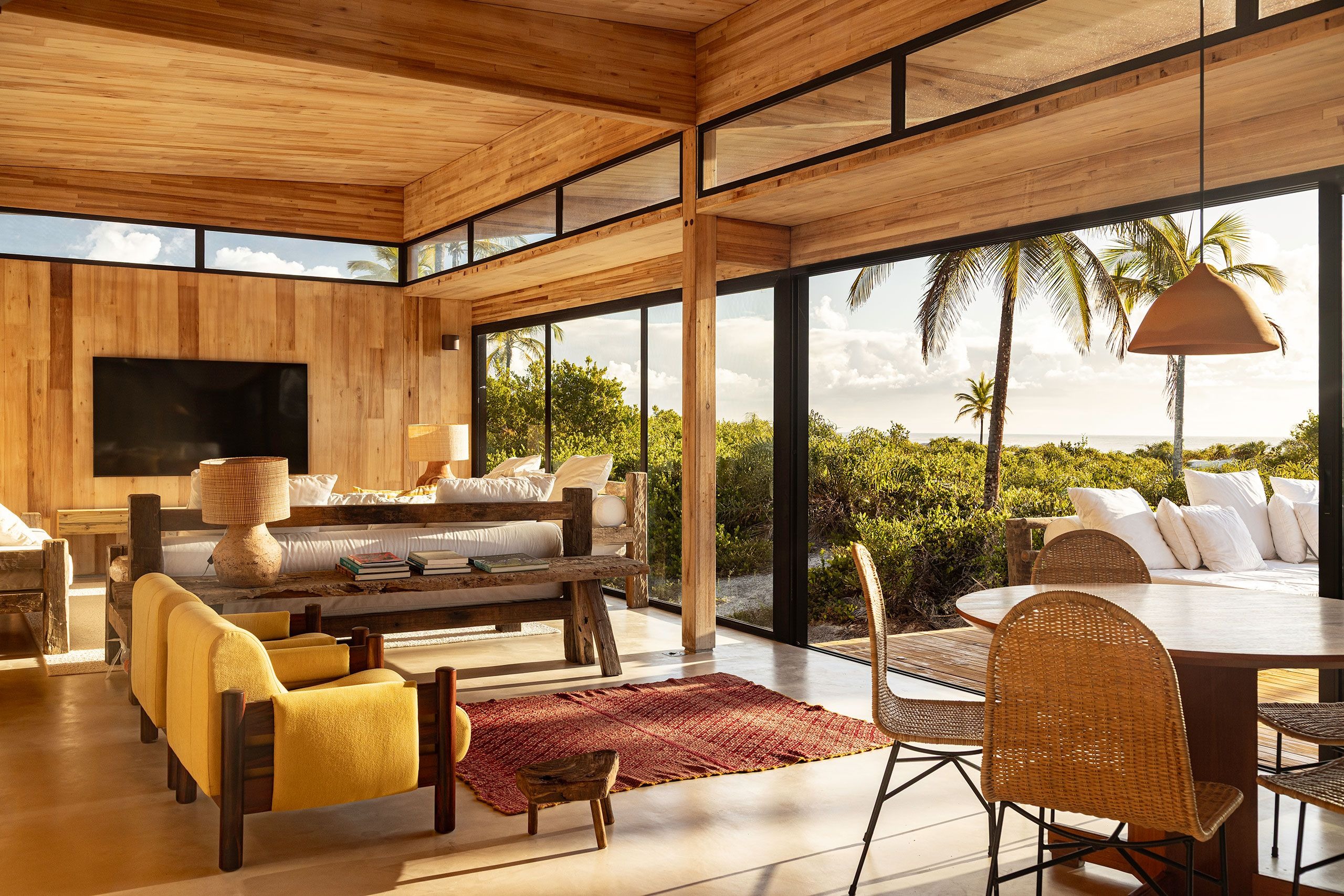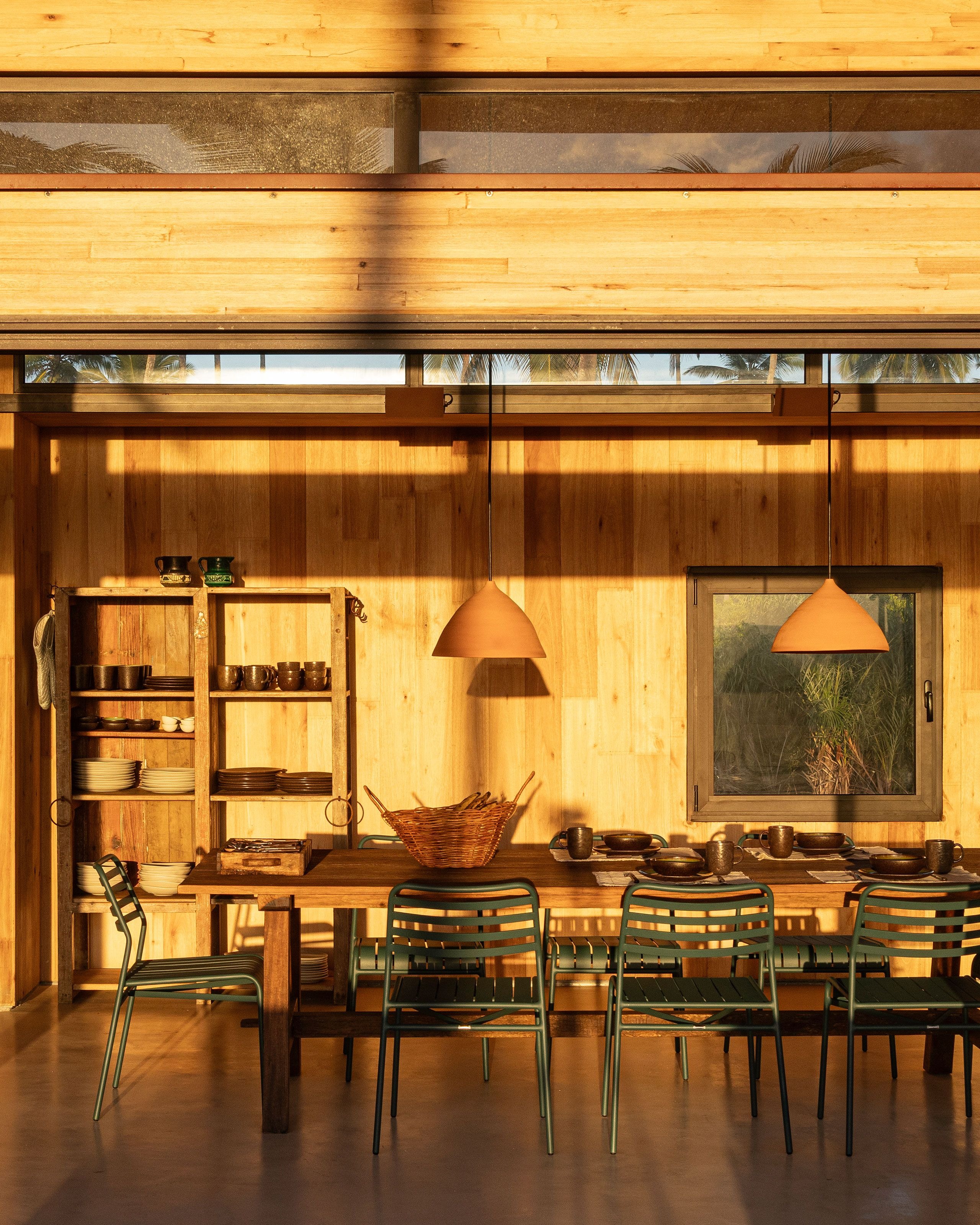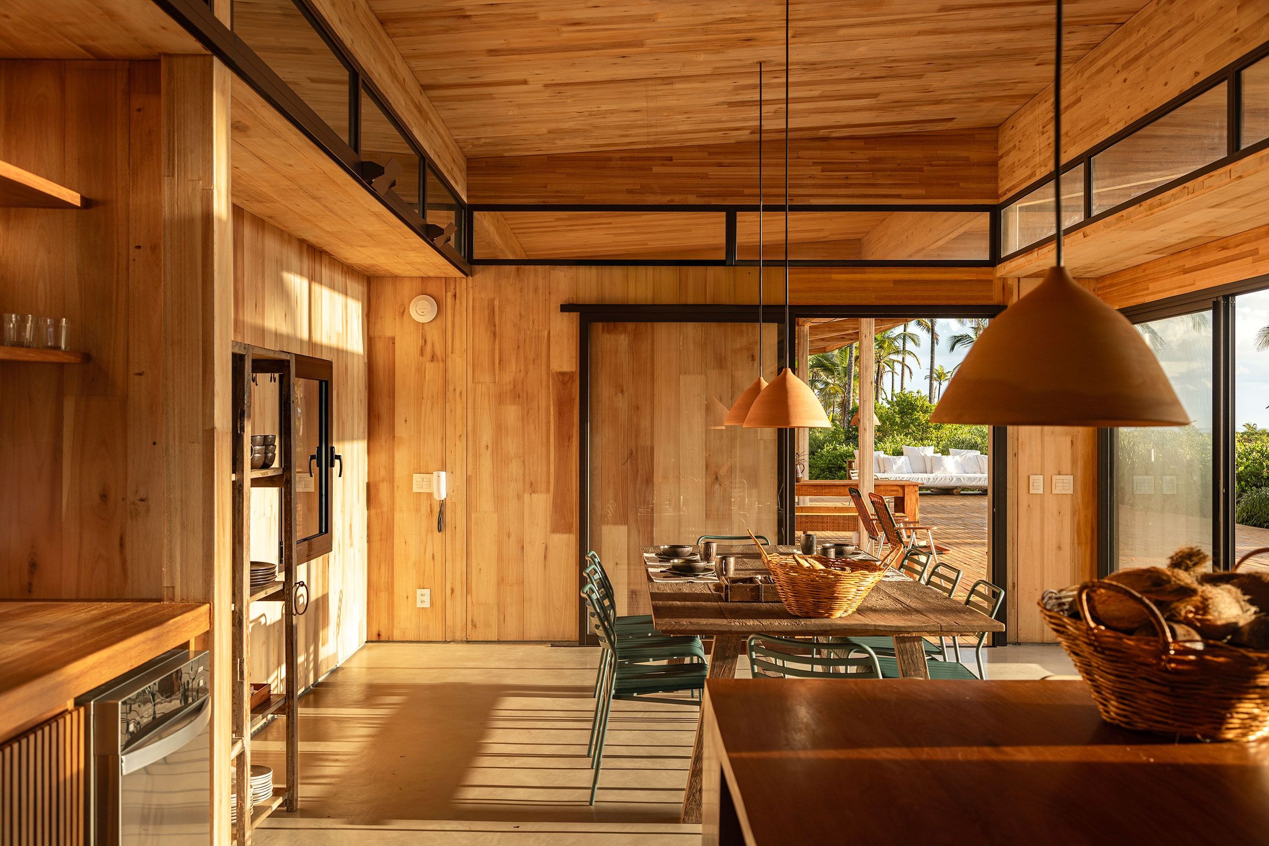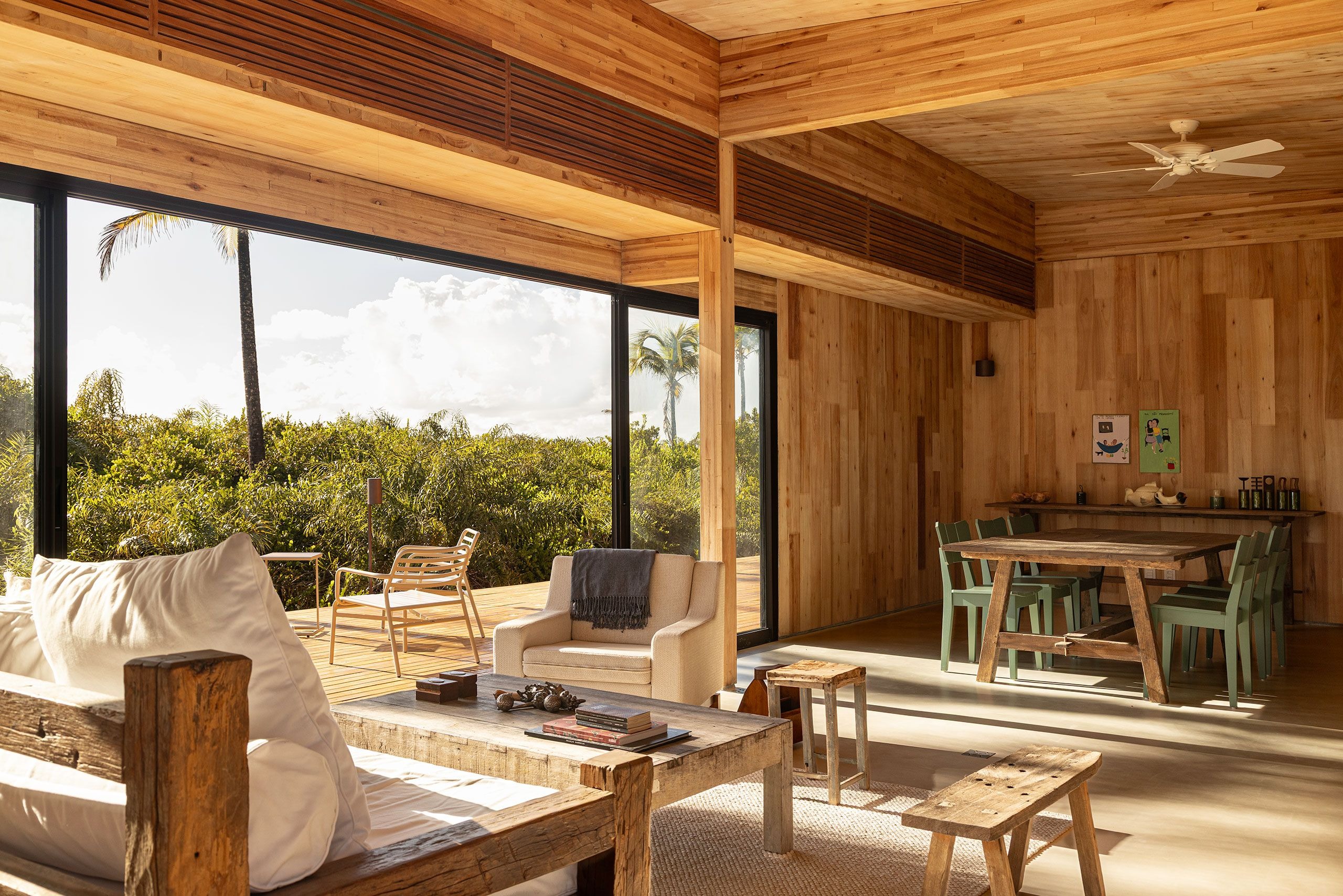 Inside, the spaces are pared back yet tactile, defined by a palette of warm, natural materials and filtered light. Walls and ceilings are lined in honey-toned eucalyptus boards, their subtle variations creating texture without ornamentation. Generous sliding glass doors allow for seamless indoor/outdoor living while framing lush views of the surrounding greenery. Furnishings are understated but soulful: rough-hewn timber furniture, woven lampshades and ceramic pendants are mixed with contemporary and vintage designs giving each space a lived-in warmth. The result is a quietly luxurious sensibility somewhere between a beach cabin and a modernist pavilion..