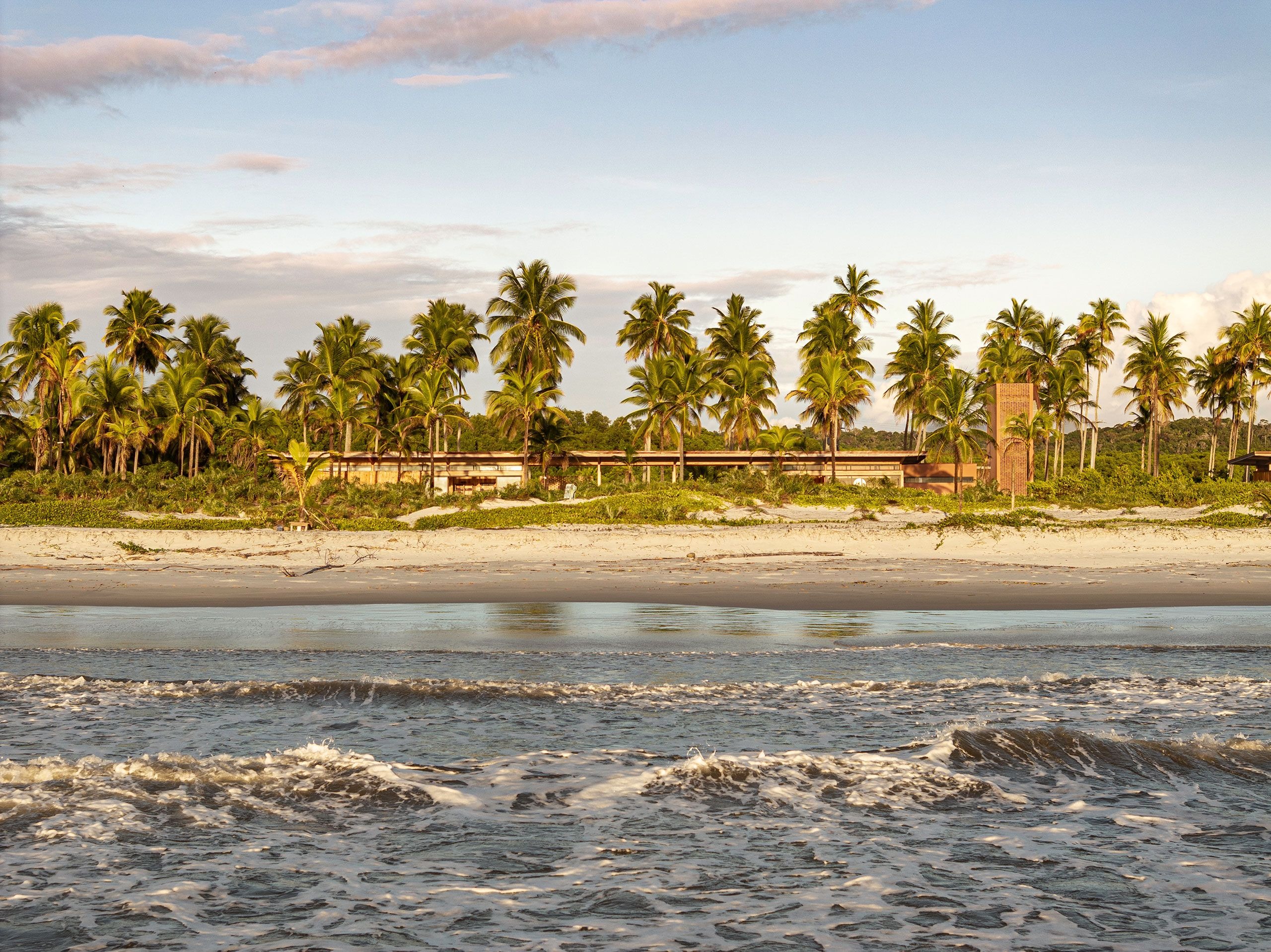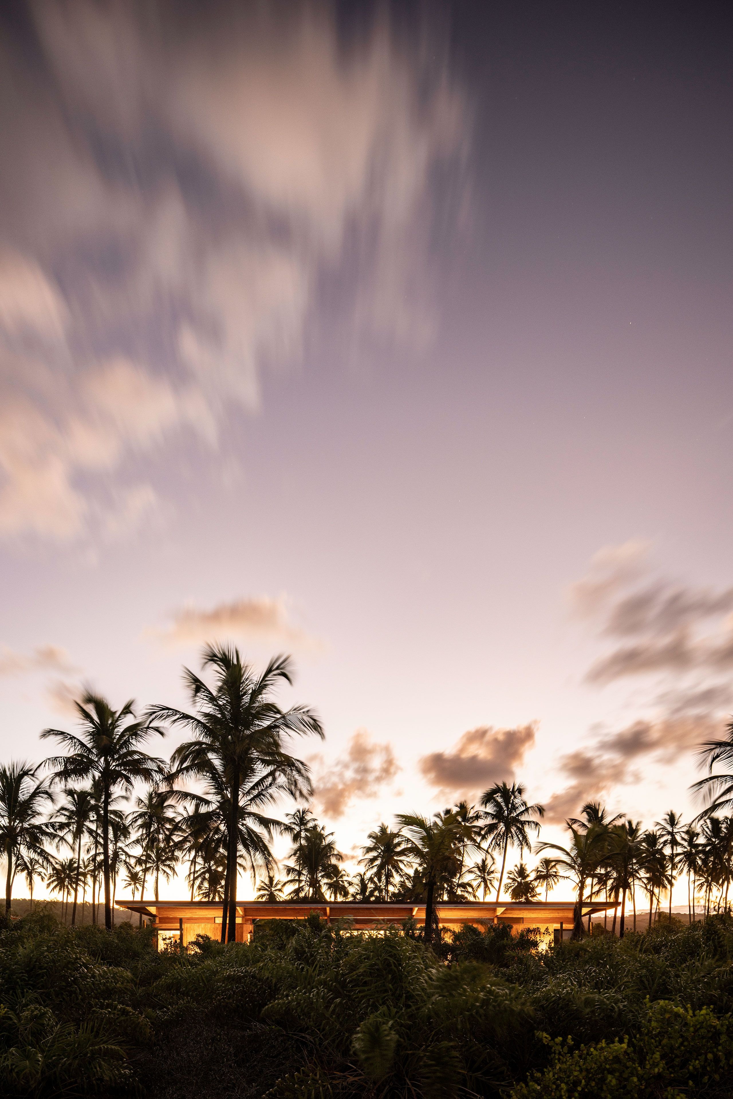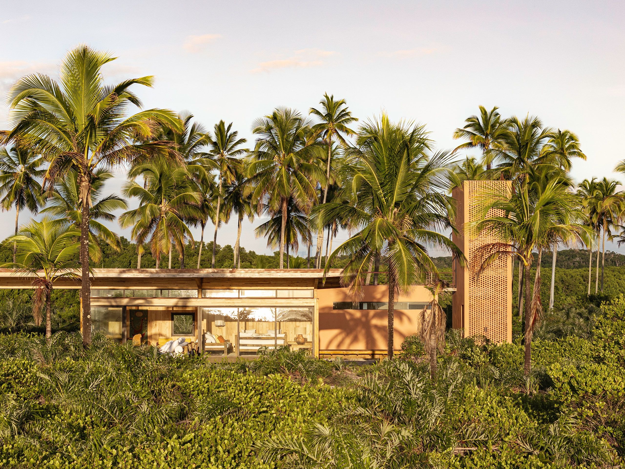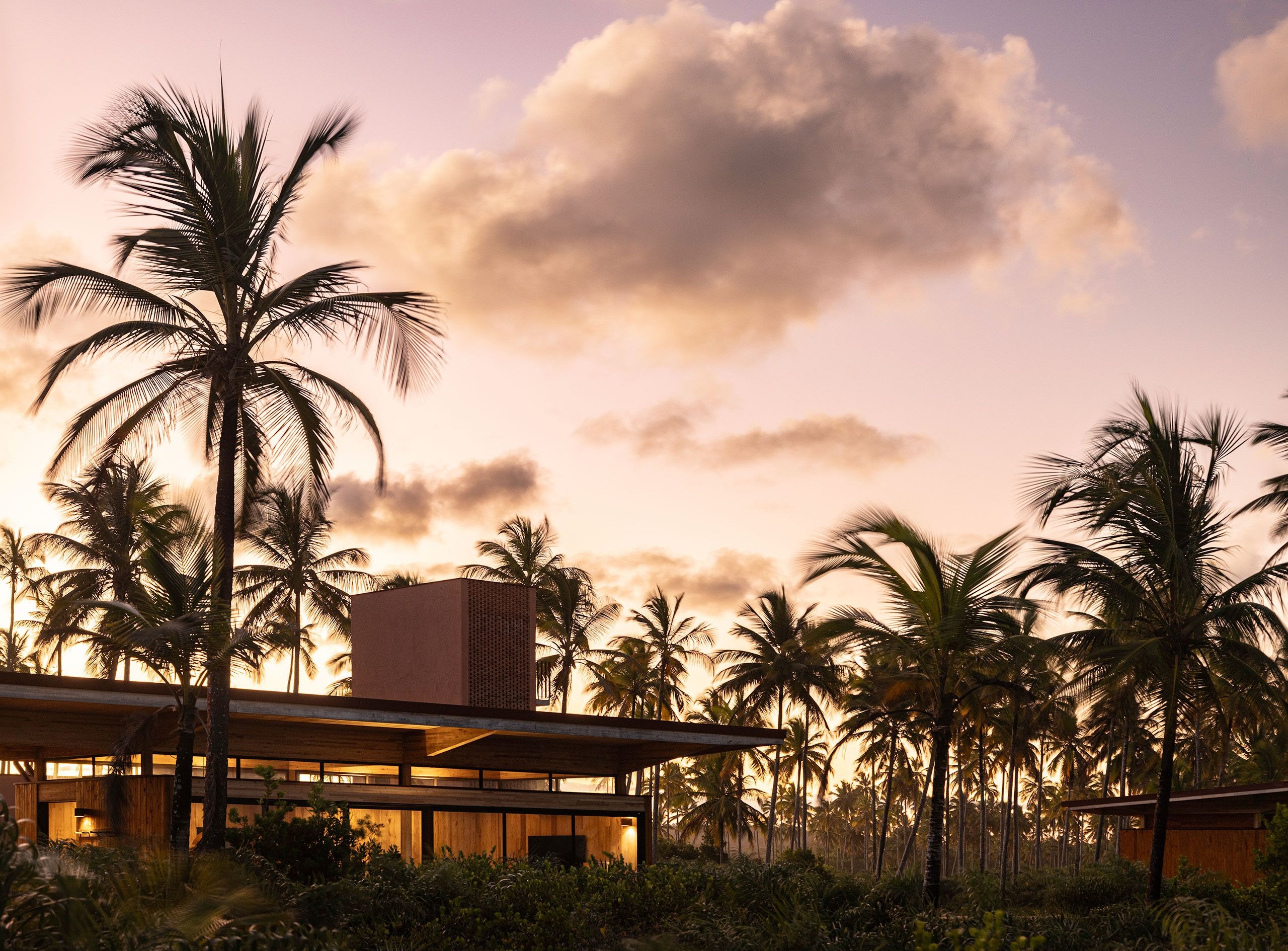 개방형 프레임과 넓은 처마로 구성된 구조물은 내부와 외부의 경계를 흐린다. 가늘고 긴 수평성이 평평한 지형을 반영하고, 목재 외장재는 야자수들의 리듬 속으로 자연스럽게 녹아든다. 해안가에서 바라보면 이 휴양지는 거의 자신의 존재를 드러내지 않는다.