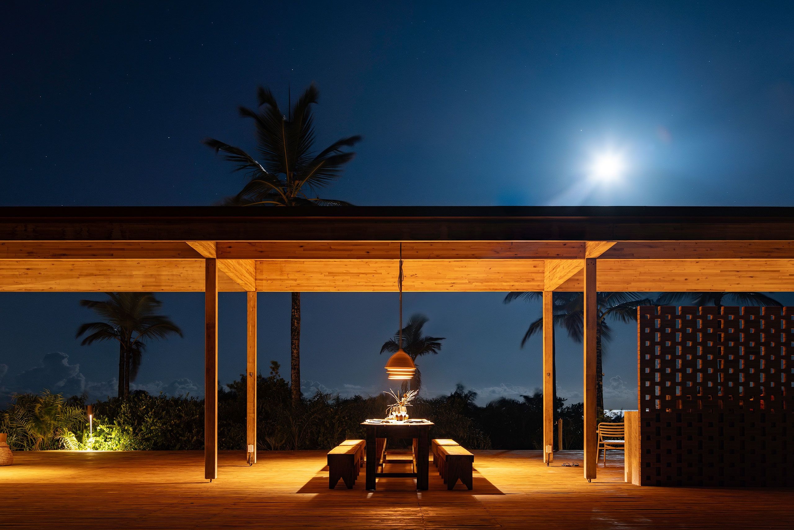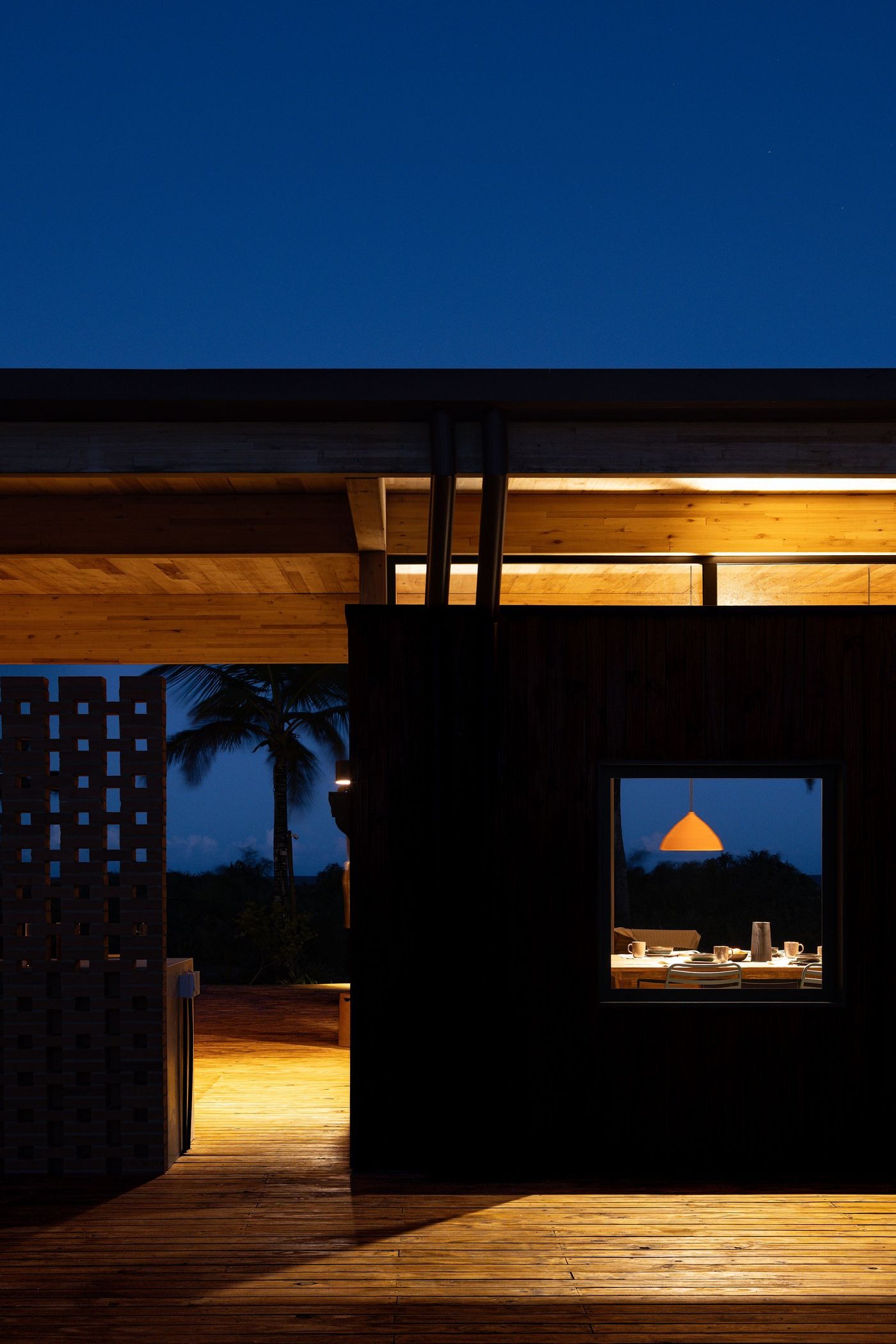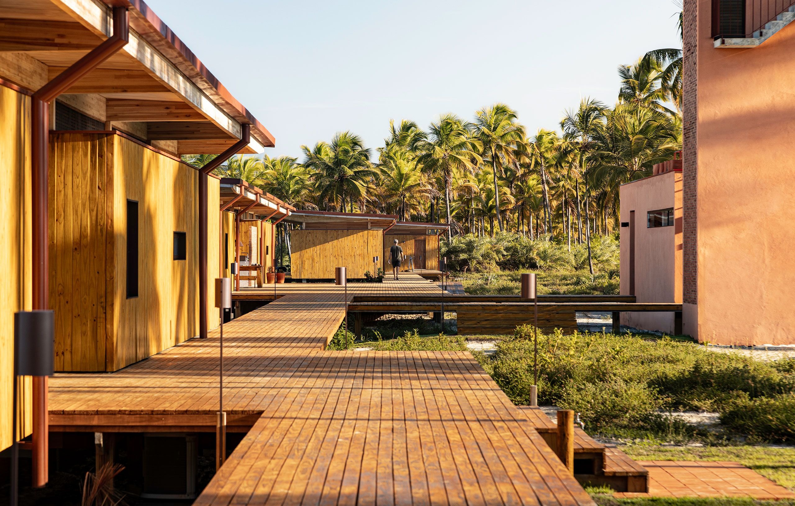 개방형 프레임과 넓은 처마로 구성된 구조물은 내부와 외부의 경계를 흐린다. 가늘고 긴 수평성이 평평한 지형을 반영하고, 목재 외장재는 야자수들의 리듬 속으로 자연스럽게 녹아든다. 해안가에서 바라보면 이 휴양지는 거의 자신의 존재를 드러내지 않는다.