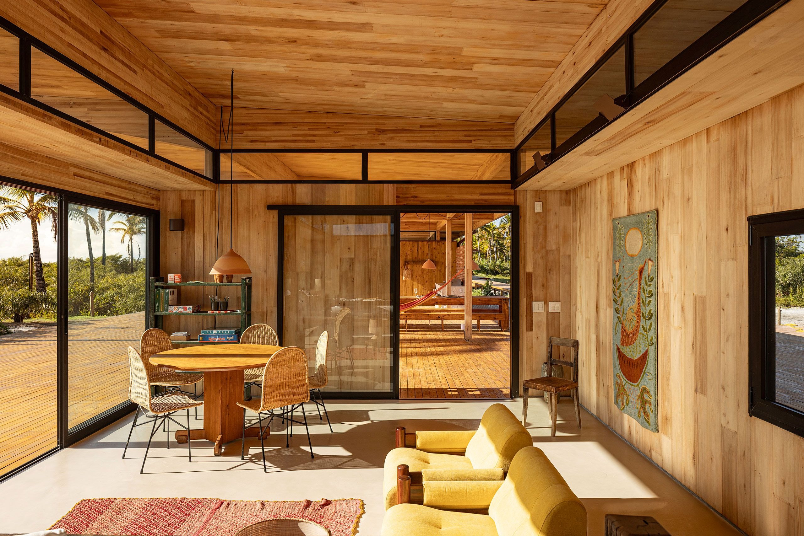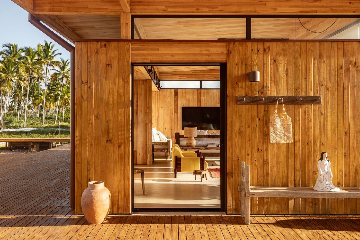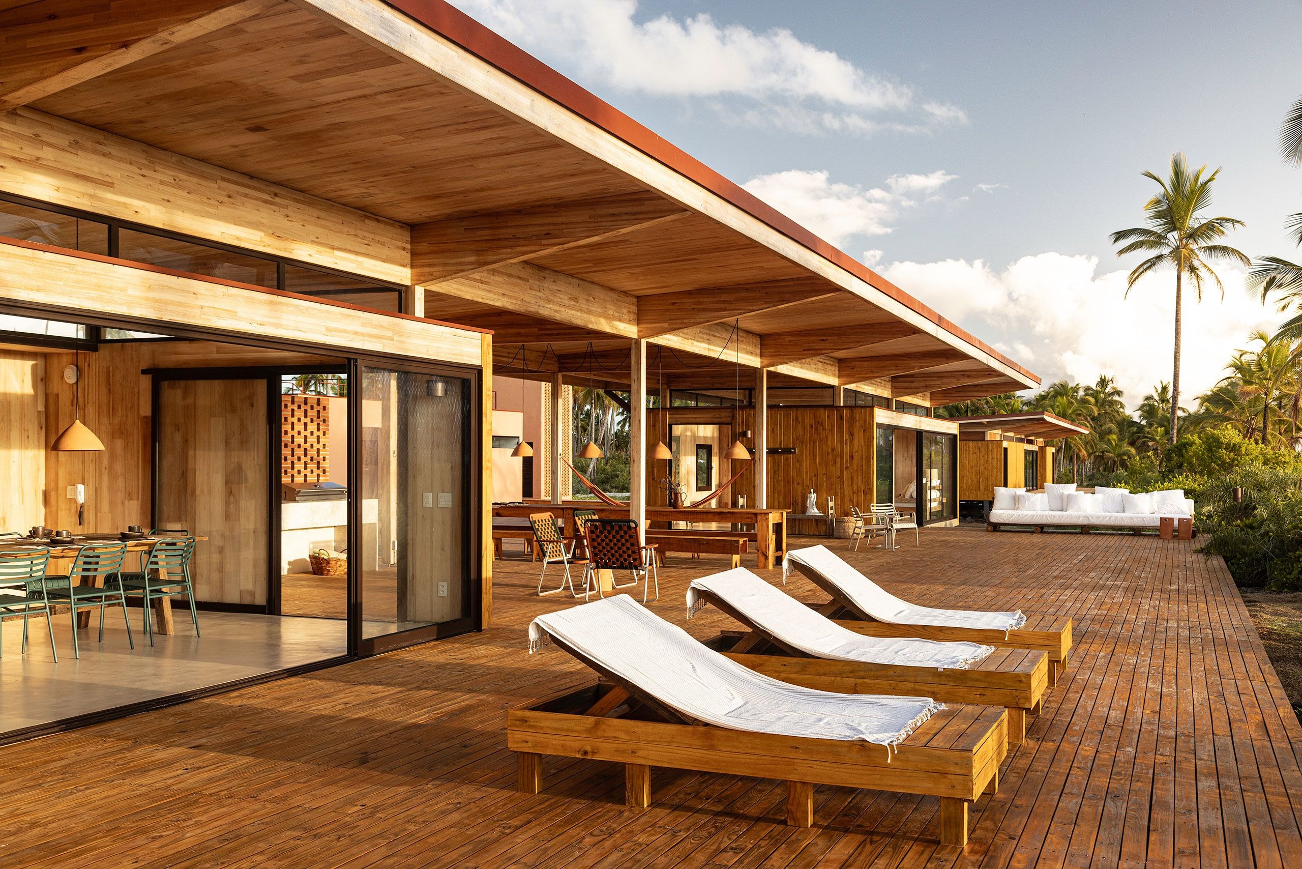 Tucked between the Atlantic Ocean and a meandering river on a palm dense peninsula in southern Bahia, Brazil, this new-built tropical retreat dissolves into its lush surroundings rather than disrupting them. Designed by Brazilian architects UNA barbara e valentim as a trio of low-slung timber volumes housing two private houses and a shared pavilion, the development sits lightly on the terrain, connected by raised walkways and enveloped in coconut groves. At first glance, it’s all openness and ease, but beneath the relaxed exterior lies a rigorously conceived modular system that reimagines how to build sustainably, especially when it comes to more sensitive, off-grid locations.