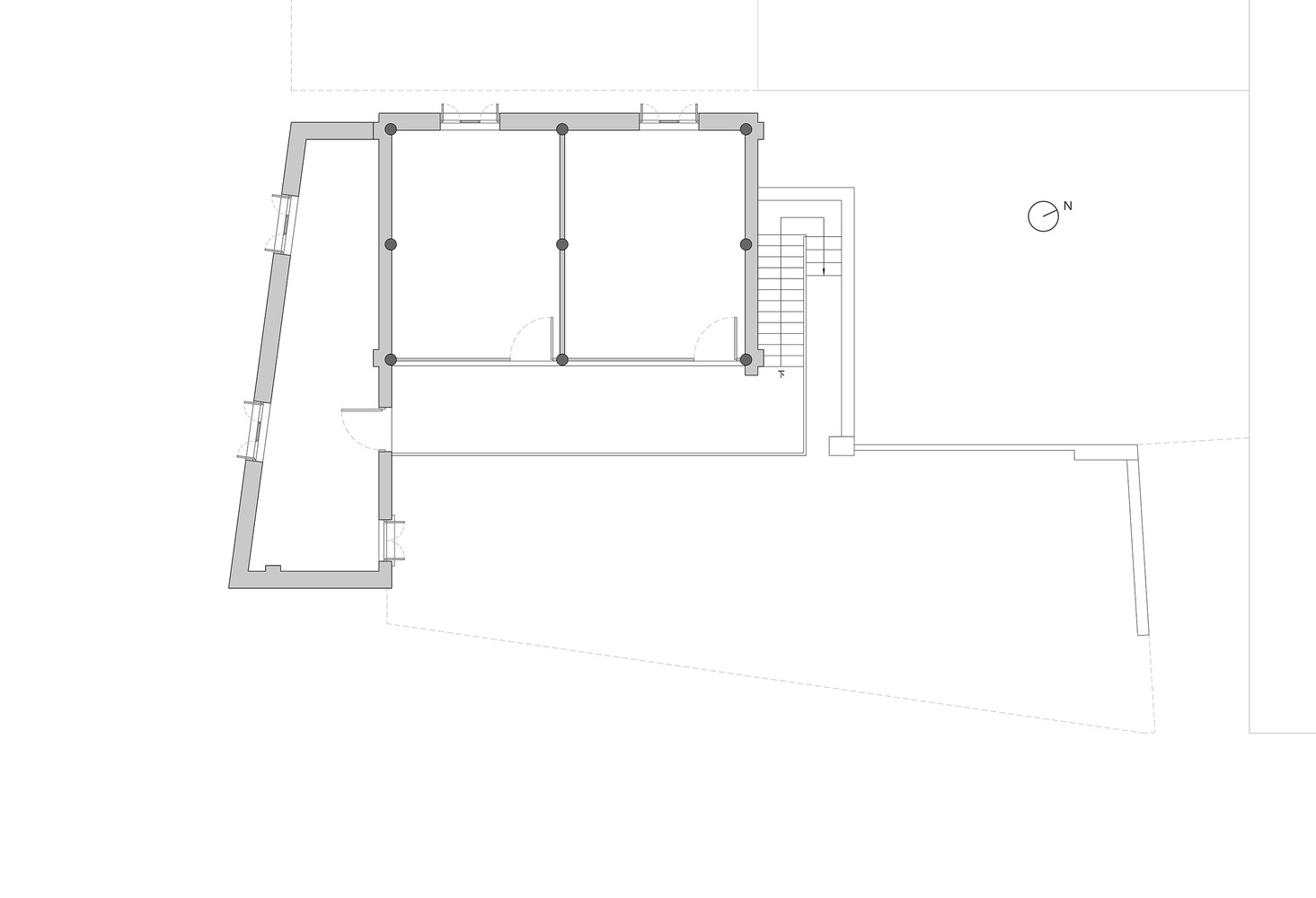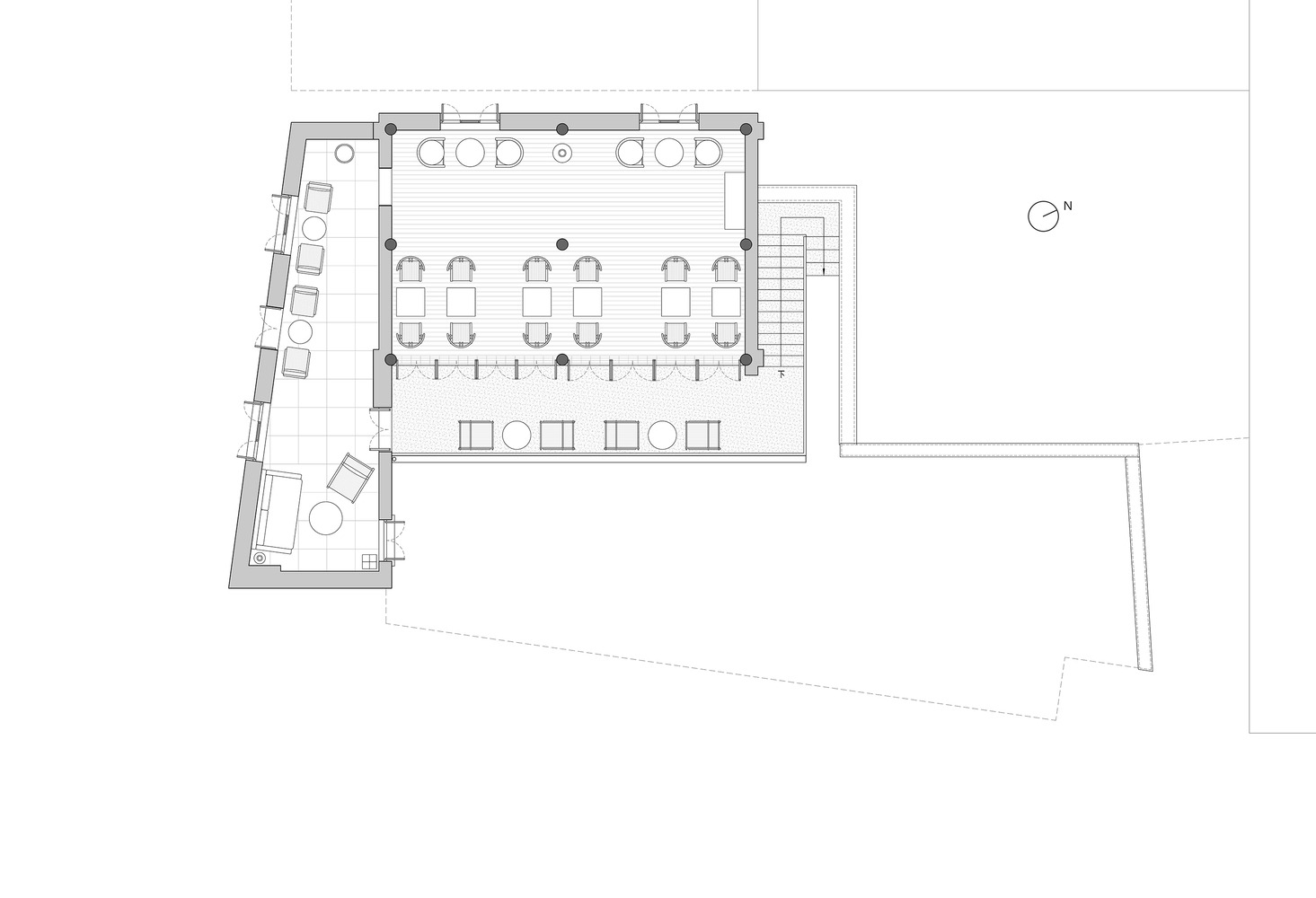 다행히 건물 앞에 서 있는 20미터 높이의 큰 나무들이 자연스러운 보호막 역할을 해주었다. 방문객들이 쾌적한 시간을 보낼 수 있도록 건물과 마당의 고요함을 더욱 강화할 필요가 있었다.