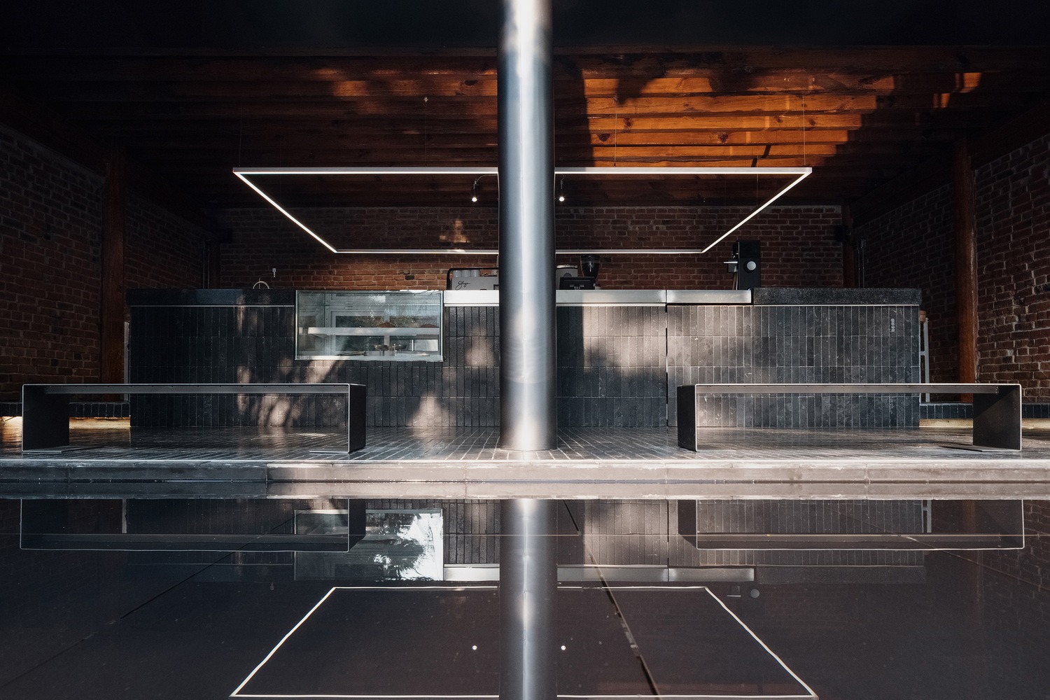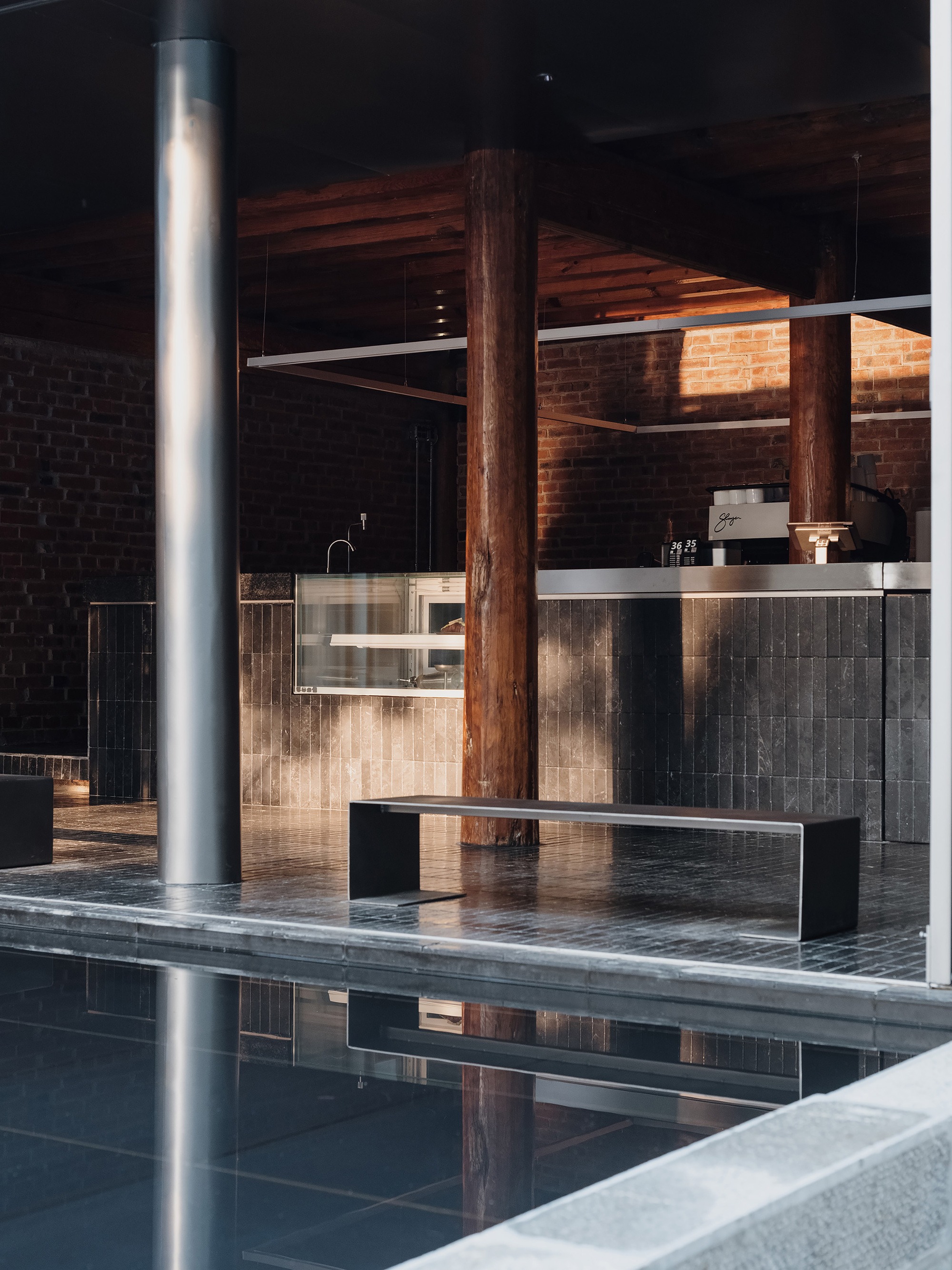 고요한 물의 표면에 비친 벽돌과 목재의 따뜻한 색감은 공간의 온기를 배가시키고, 전통 구조물의 견고한 아름다움과 현대적 세련미가 완벽한 균형을 이룬다.