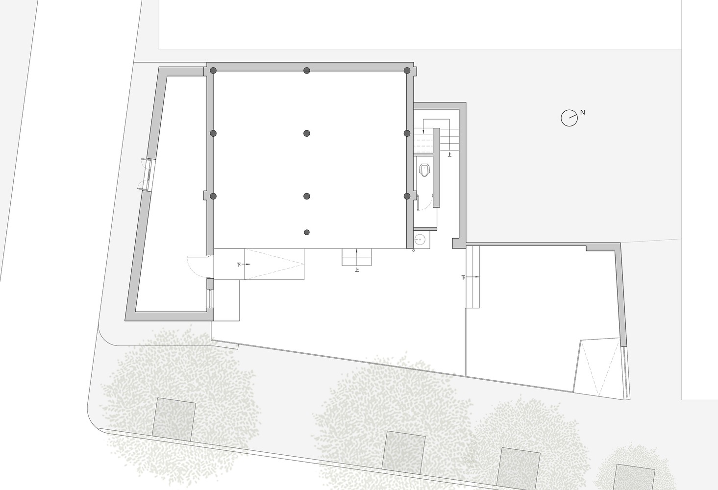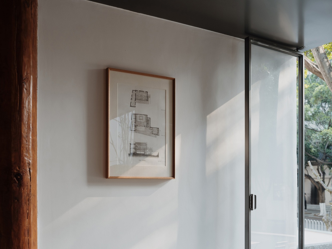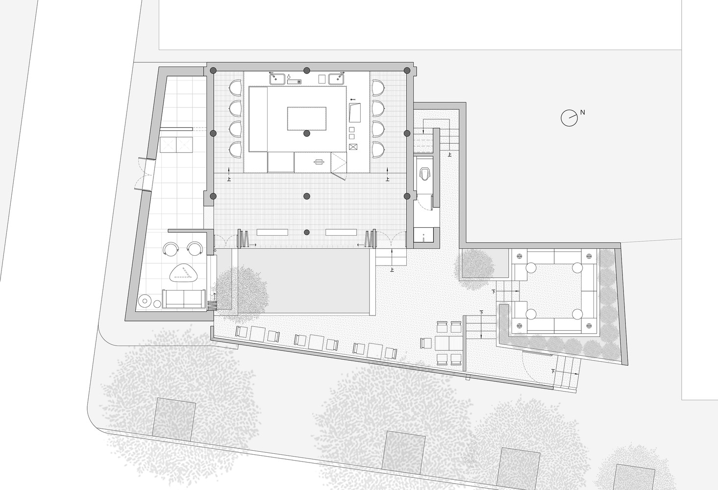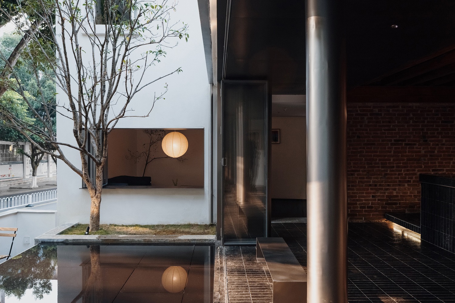 A long, low wall was constructed along the eastern boundary of the site, screening the inner courtyard from direct external views and creating a layered relationship with the north and west walls, as well as the main building. A central water feature and an osmanthus tree were installed in the inner courtyard, harmonizing the relationships between the building, courtyard, and trees, while emphasizing the serene atmosphere of the entire space.