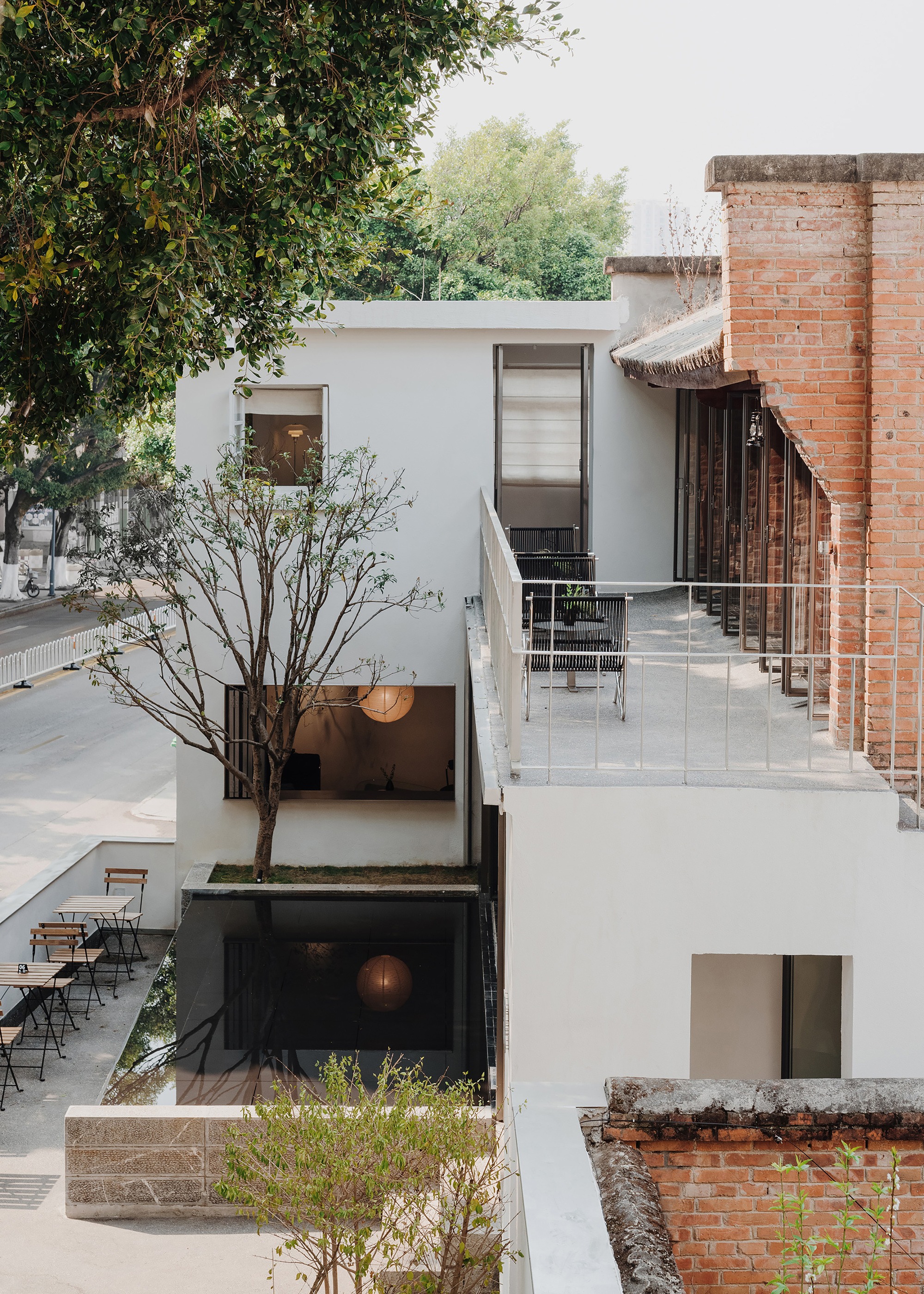 While the restoration of the old residence is managed from an urban perspective, the ambiance of the cafe directly shapes the customer experience. Despite the original site being 1.4 meters above street level, the east facing building and courtyard are still exposed to urban hustle due to heavy traffic and pedestrian flow on the eastern road. Fortunately, several 20-meter-tall trees stand in front of the building, providing a natural sanctuary. It was essential to enhance the tranquility of the building and courtyard to ensure a pleasant visit.