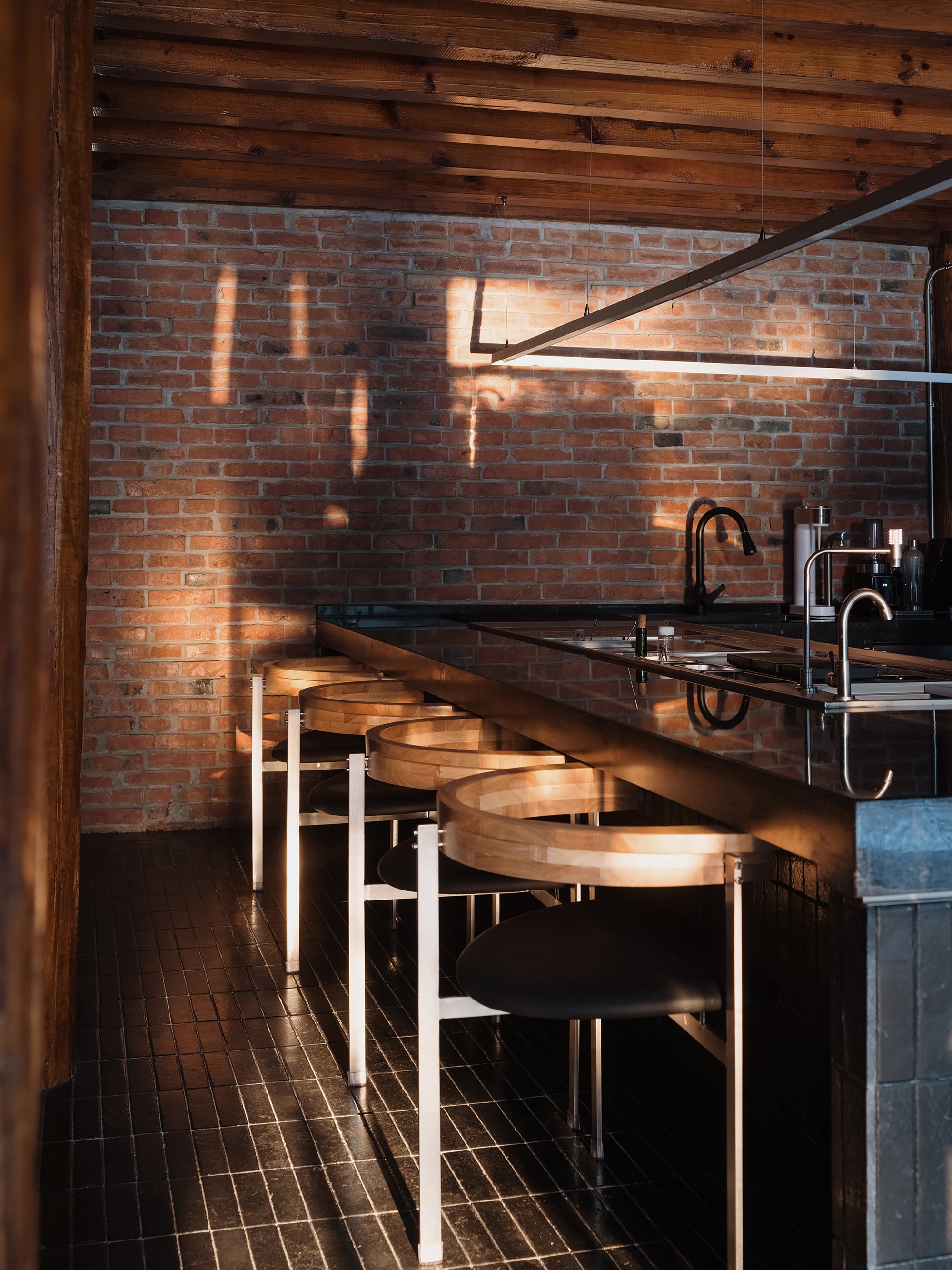 커피 제조 공간은 1층에 마련된 '순환형' 바를 중심으로 전략적으로 배치되었다. 일반적인 에스프레소 기반 음료를 만들기 위한 커피 머신이 바의 중심에 자리하며, 이곳을 중심으로 모든 활동이 자연스럽게 흘러간다.