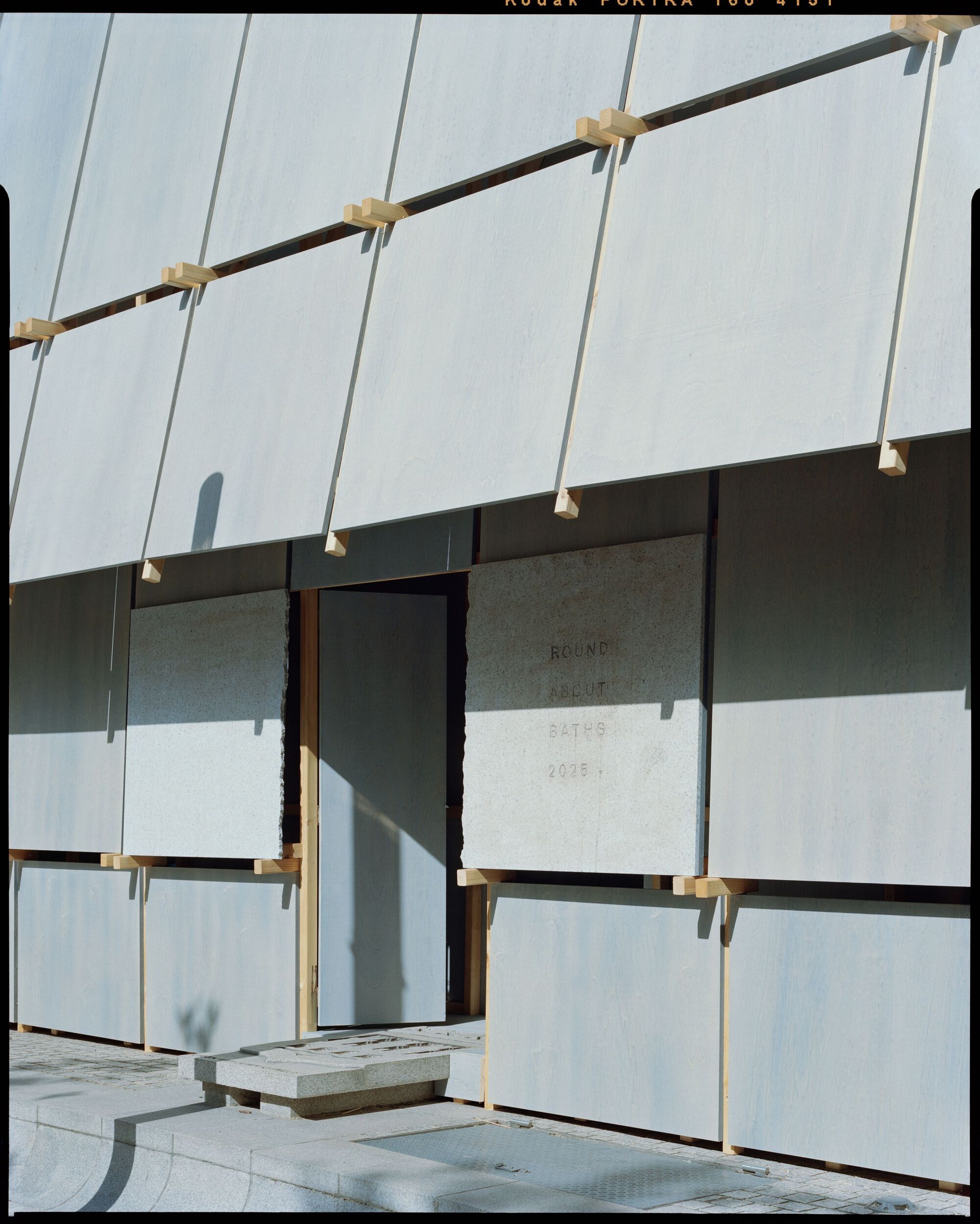 목욕 시설의 높은 벽면은 규칙적인 목재 구조로 이루어져 있다. 설치를 위해 임시로 사용된 가공하지 않은 목재 패널들로 마감되어, 자연스러운 질감과 따뜻함을 선사한다. 이 목재 스크린은 도시의 시선으로부터 보호하면서도 빛과 바람이 스며들 수 있도록 한다.