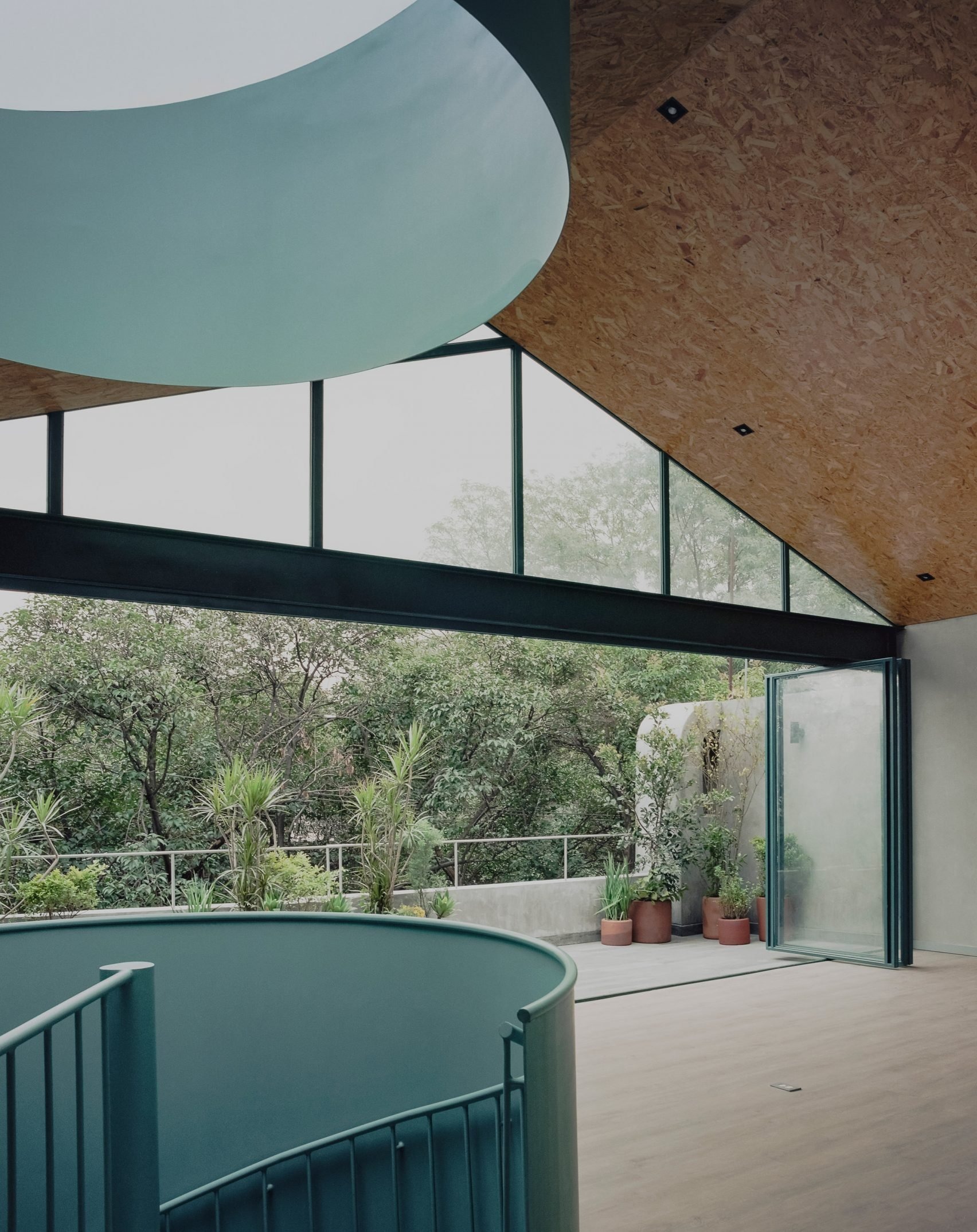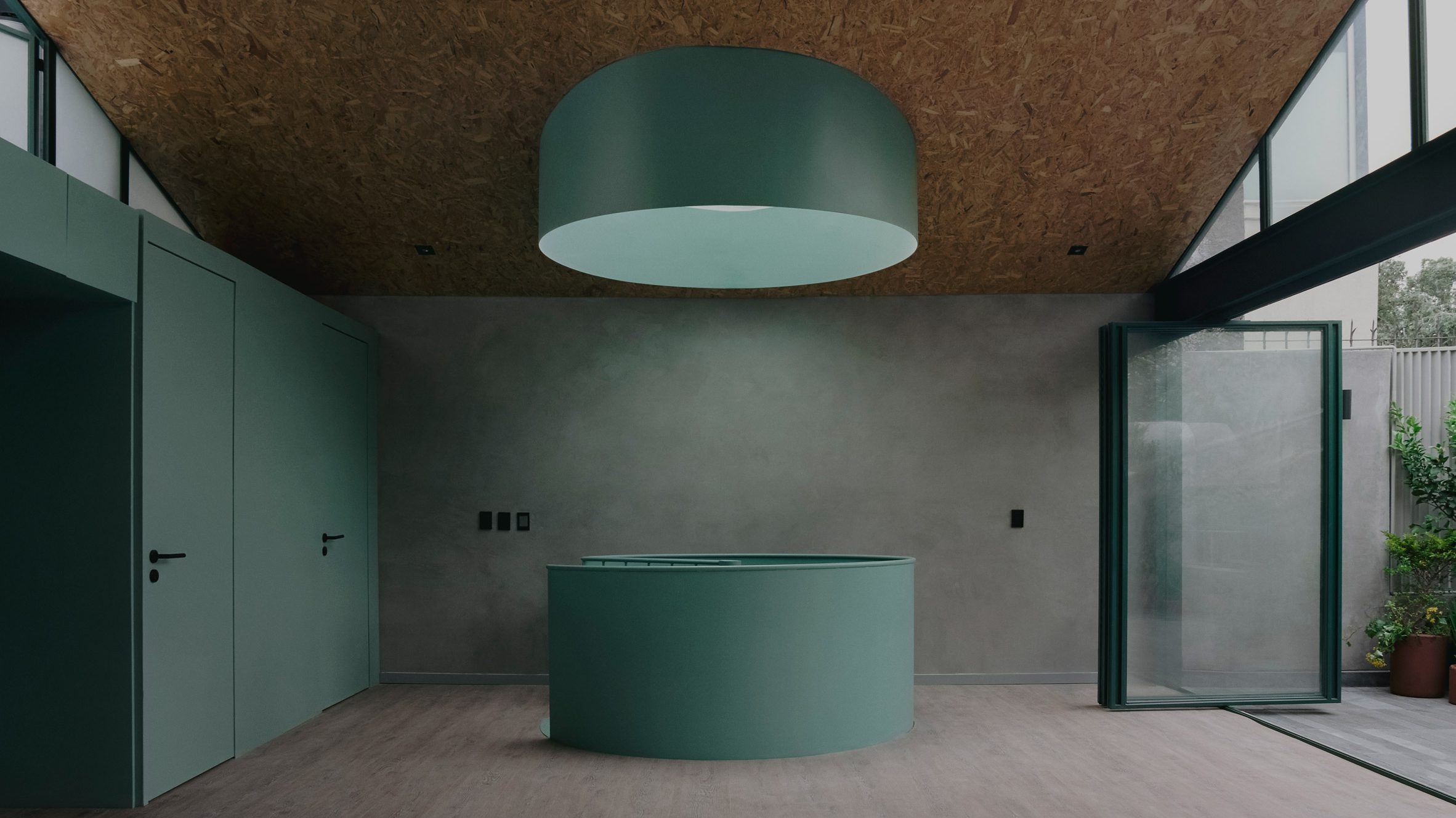 건물의 심장부는 청록색 나선형 계단이다. 직선으로 시작했다가 나선을 그리며 건물 전체를 관통하는 이 계단은 단순한 동선을 넘어 공간의 중심축 역할을 한다. 각 층을 연결하면서도 각각의 독립성을 보장하는 영리한 장치다.