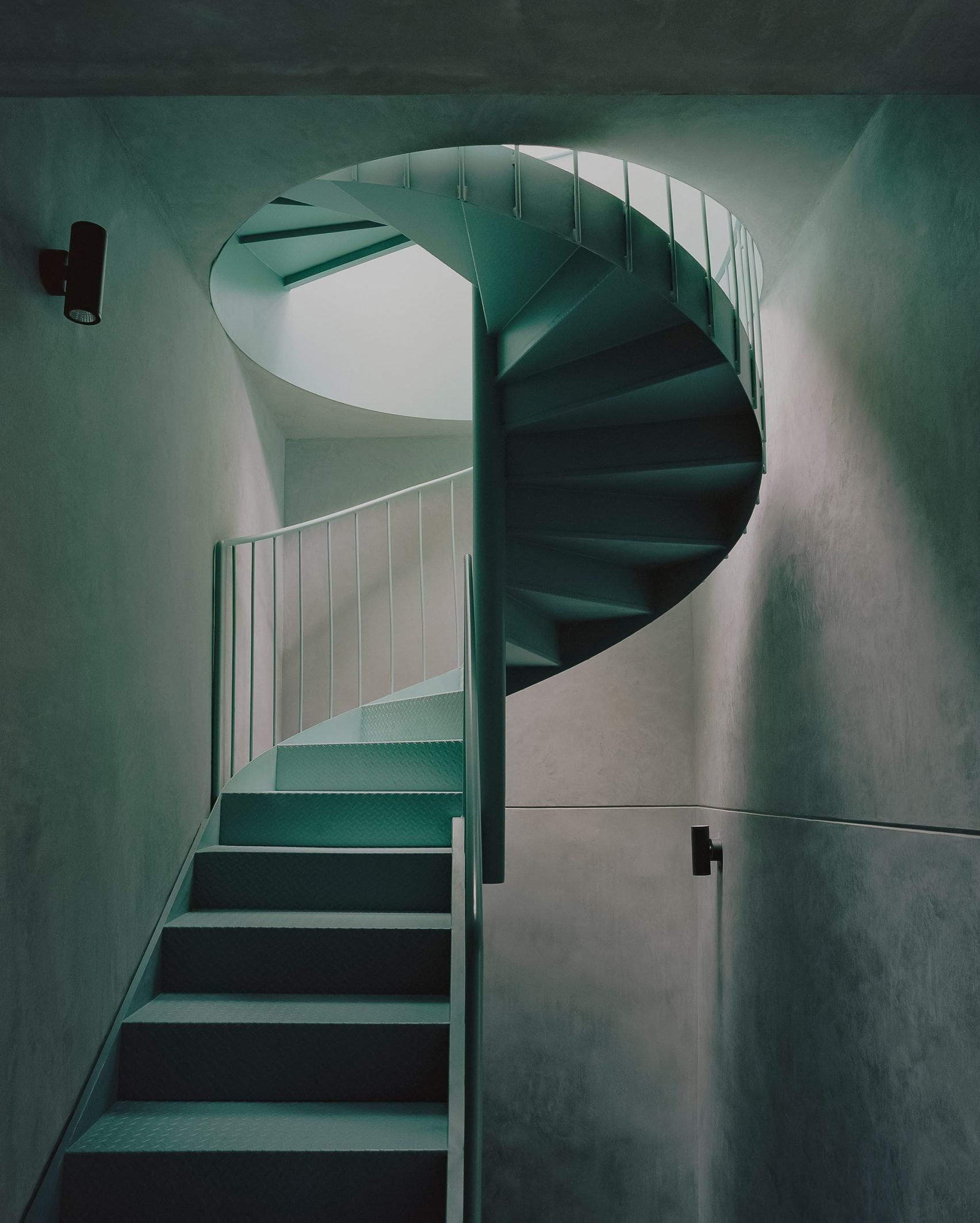 A teal-coloured staircase begins as a straight flight before switching into a spiral shape as it ascends through the building.