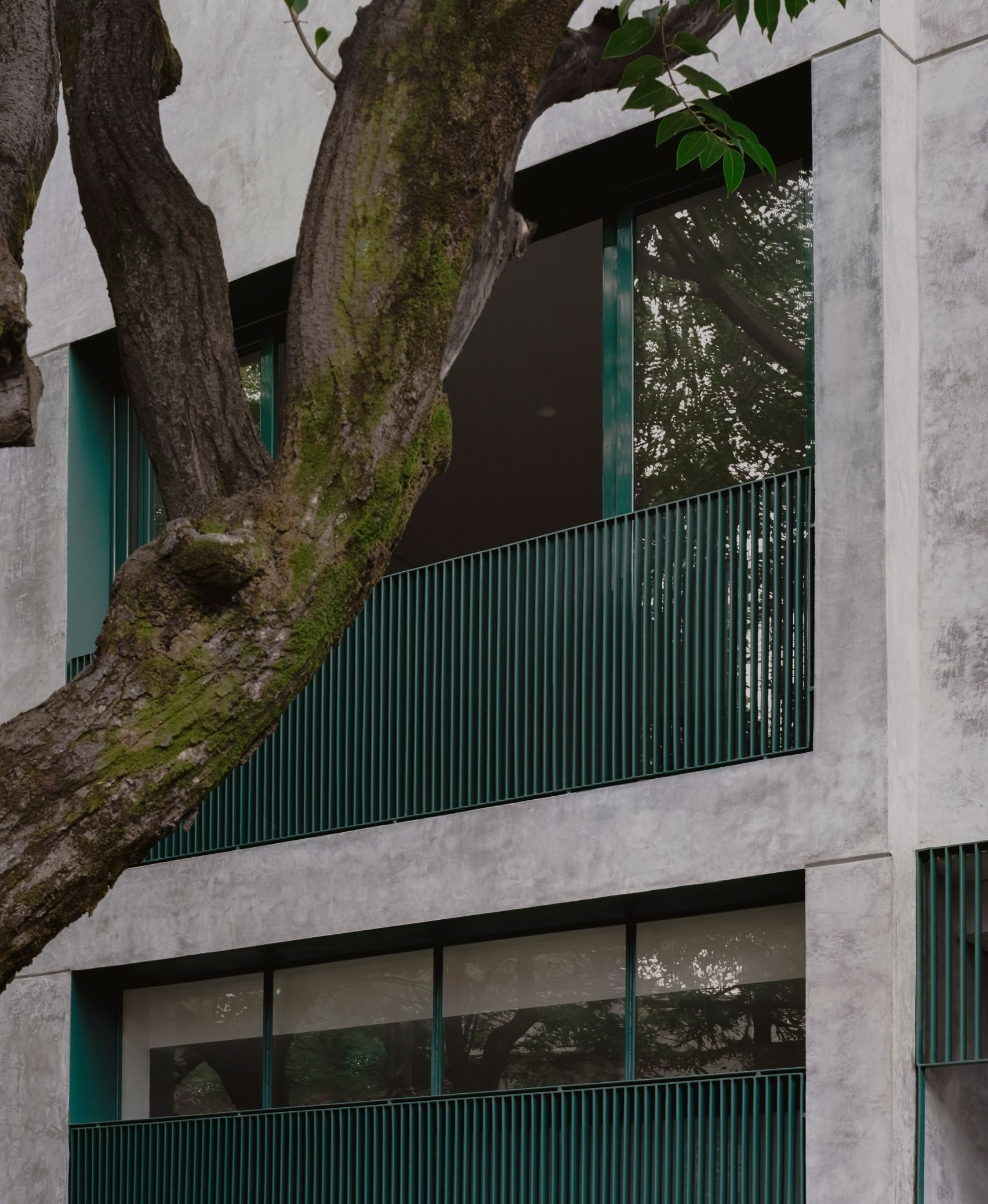 기존 건물의 회색 석고 마감과 새로운 청록색 요소들 사이의 대비는 개조의 흔적을 숨기지 않으면서도 자연스럽게 어우러진다. 이는 과거와 현재가 대화를 나누는 건축적 태도를 보여준다.