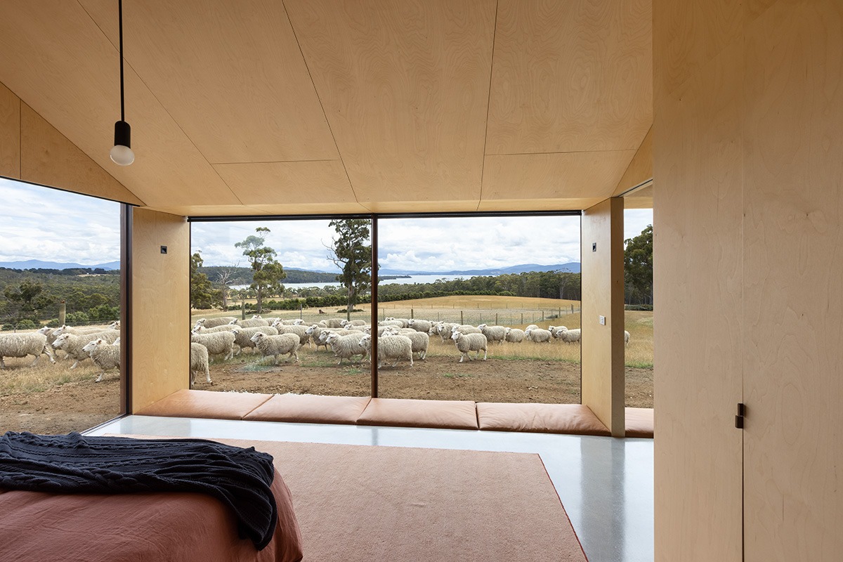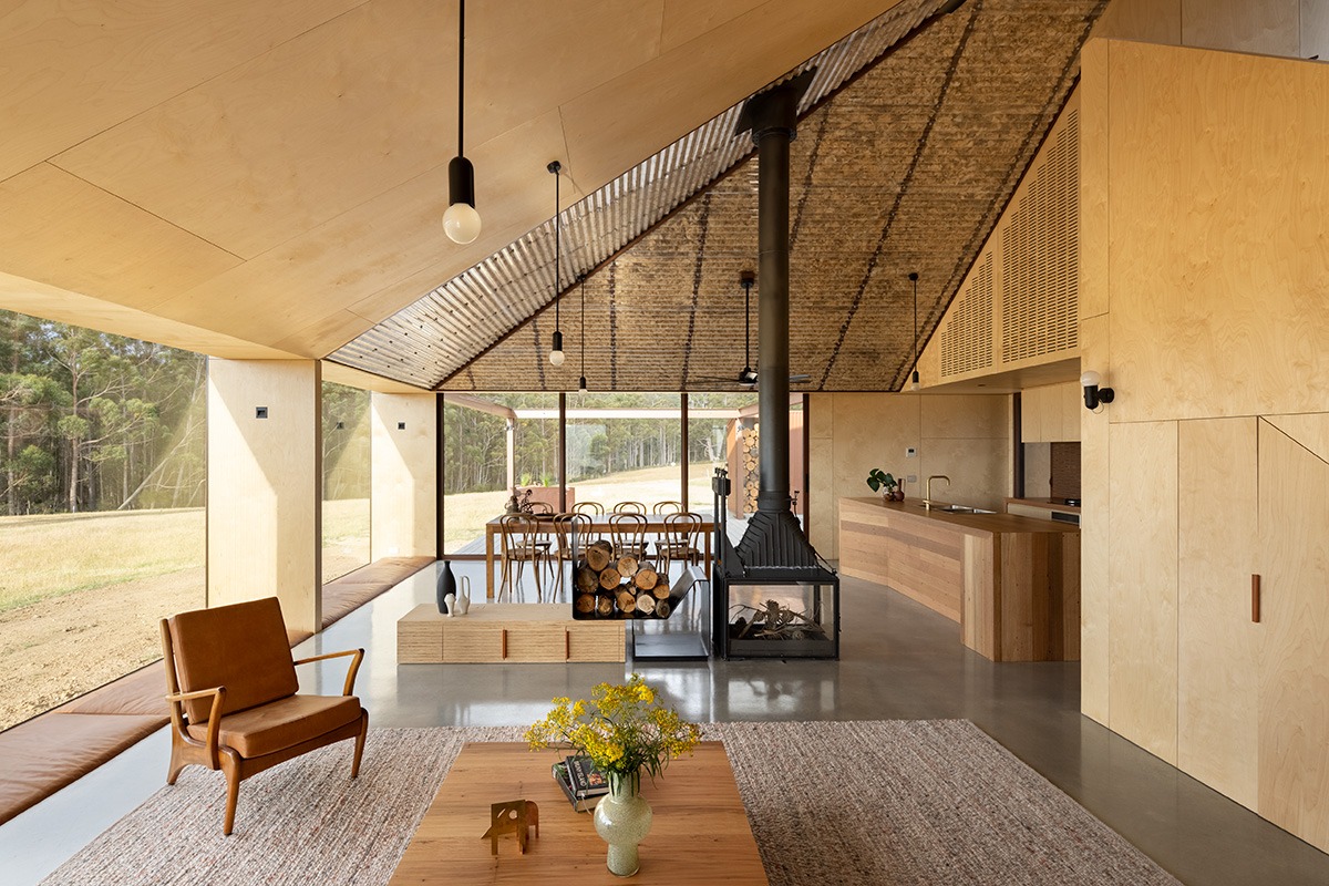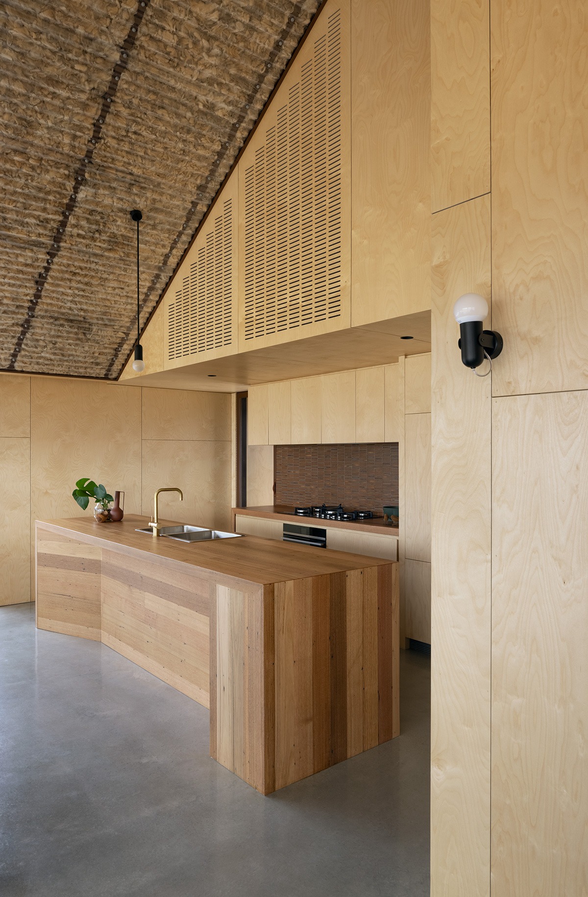 내부로 들어서면 높은 볼륨의 개방적 공간과 아늑한 소규모 공간이 절묘한 대비를 이룬다. 합판 마감재와 콘크리트 바닥이라는 실용적인 재료 팔레트가 공간 전체를 아우르지만, 가장 인상적인 것은 현지 쿠프워스 양털로 마감한 천장이다. 투명한 폴리카보네이트 골판지로 보호된 이 양털은 뛰어난 단열 성능을 제공하는 동시에, 건축주들의 농업적 삶을 기념하는 독특한 미적 경험을 선사한다.
