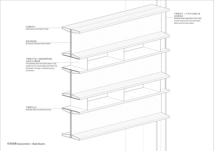 The mezzanine within the book tower breaks the conventional treatment of floor slabs. A grid of steel beams in a crisscross layout is suspended between the concrete columns to form the mezzanine structure. The top surfaces of the I beams are flush with the wooden flooring, allowing them to visually read as horizontal elements that share the same material quality as the timber beams. At the end of the longitudinal space, the beams cascade downward in layered sequences, channeling natural light. Within the book tower, the silhouettes of people are captured by the horizontal timber beams and become a floating scenery.