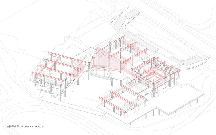 모든 둘러싼 벽을 걷어낸 자리에는 무질서하고 의미를 잃은 콘크리트 프레임 구조들만이 남았다. 여기에 일련의 새로운 구조체들이 개입하면서 원래의 혼란스런 구조에 새로운 질서를 부여하고, 자연과 깊이 연결된 공간의 장들로 변모시켰다.