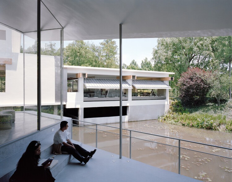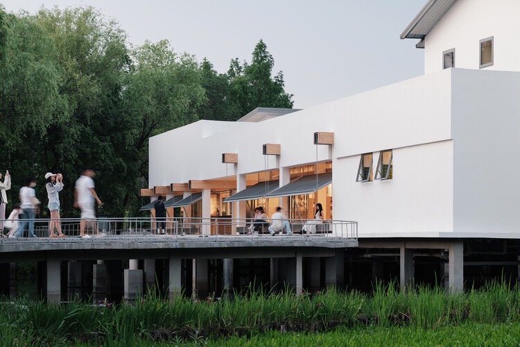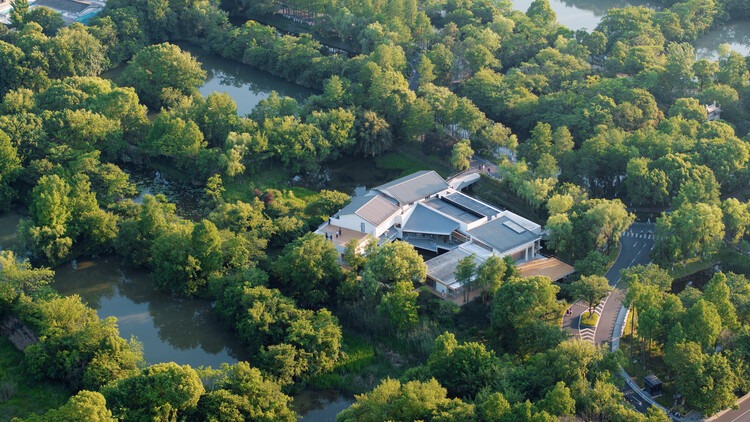 The project is located at the northern starting point of Fudi, Xixi Wetland. The original building was an office building twenty years ago - a U shaped symmetrical layout with a combination of functional spaces in an intricate volume. The building is elevated above the wetland, with a closed and negative water courtyard surrounded by three wings. The design required a façade renovation and interior design to transform it into a bookstore.