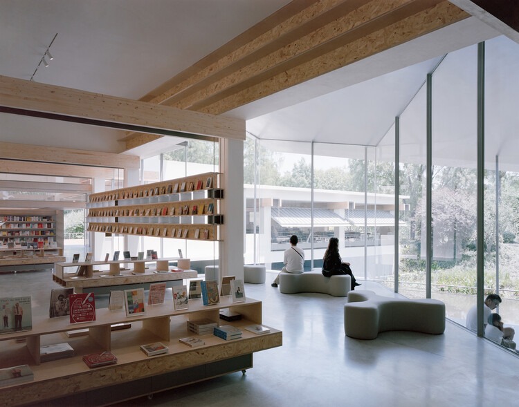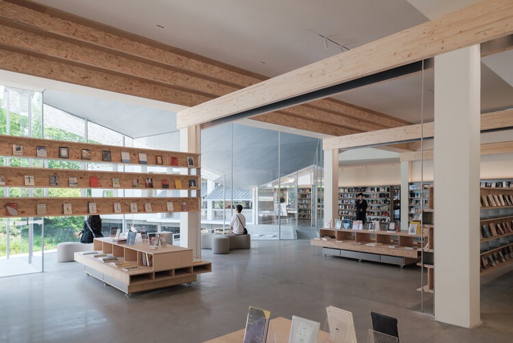 구조용 집성 소나무 빔들은 숨겨진 플레이트 조인트를 통해 콘크리트 기둥에 구조적으로 정착되면서, 다양한 지점에서 외부로 캔틸레버(한쪽 끝만 지지되어 돌출된 구조)된다. 더블빔 사이의 틈새는 공조 리턴과 기둥 정렬 조명을 위한 통합 채널 역할도 한다. 목재 빔이 형성하는 수평적 공간의 장에 설계는 두 개의 수직적 공간 교란을 추가로 도입한다. 하나는 천창으로 이어지는 북타워이고, 다른 하나는 습지로 향하는 물가 파빌리온으로, 자연 풍경이 서점 공간과 더욱 입체적으로 만나게 한다.